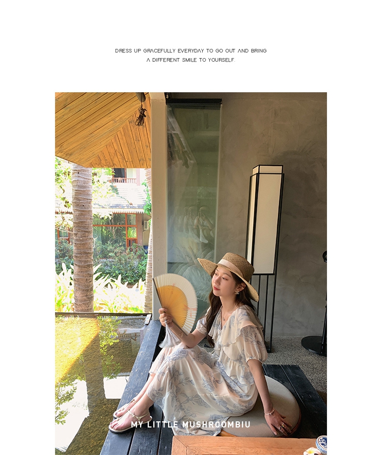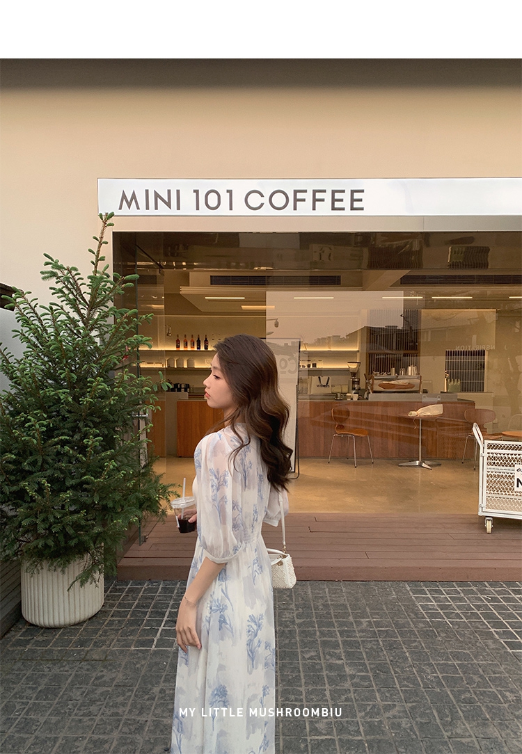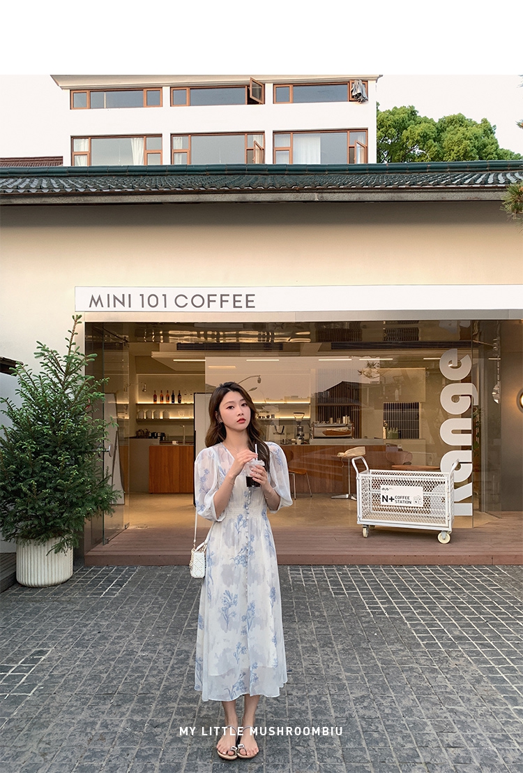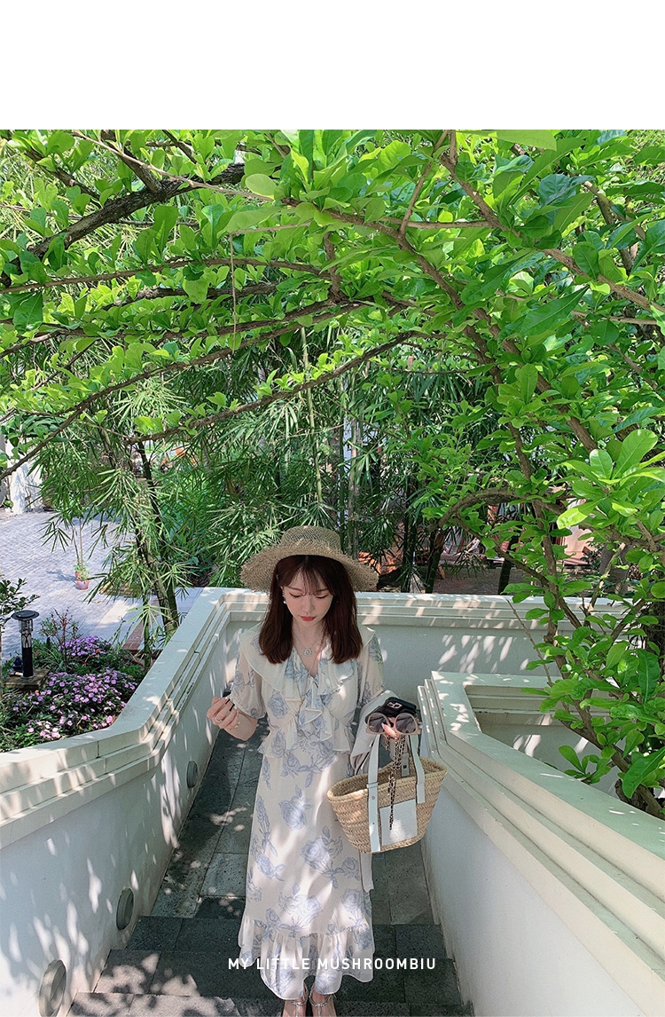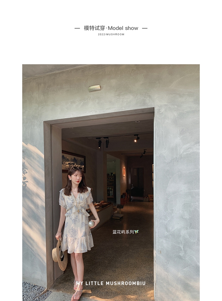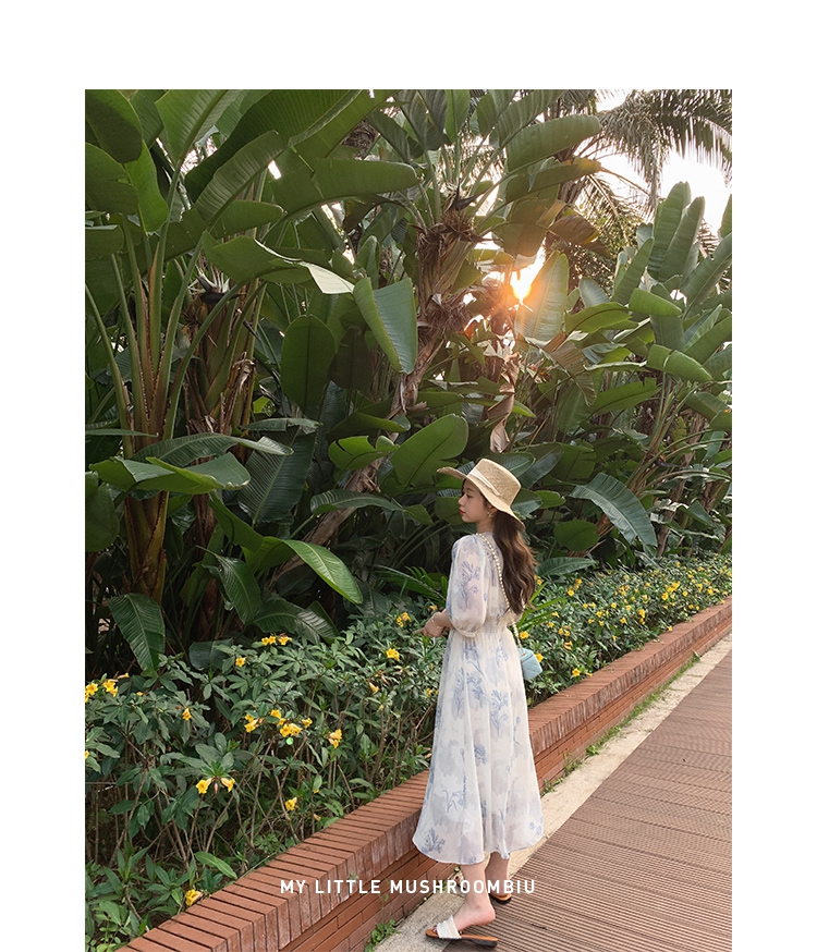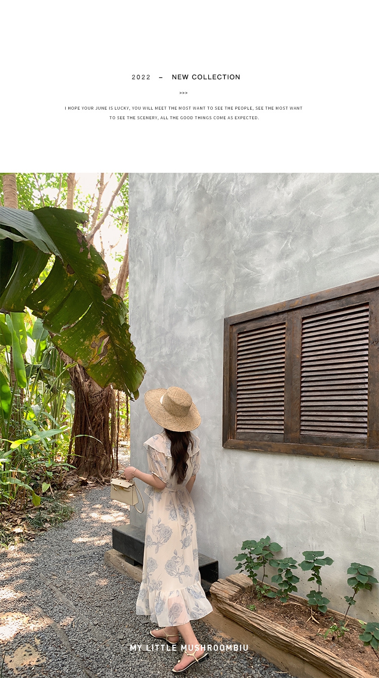 金蘑菇菇【蓝花屿系列】美哭原创油画印花小清新法式温柔风连衣裙