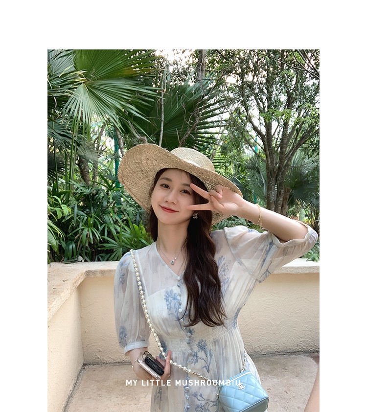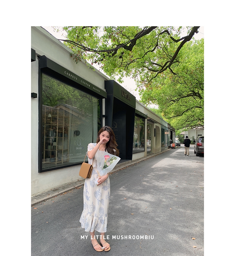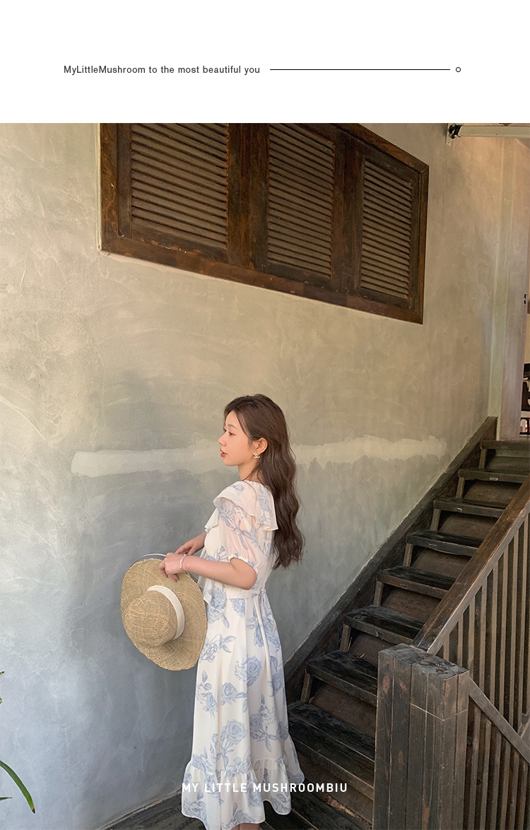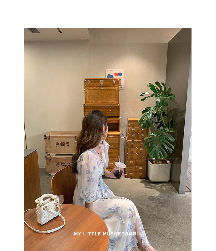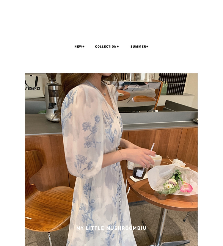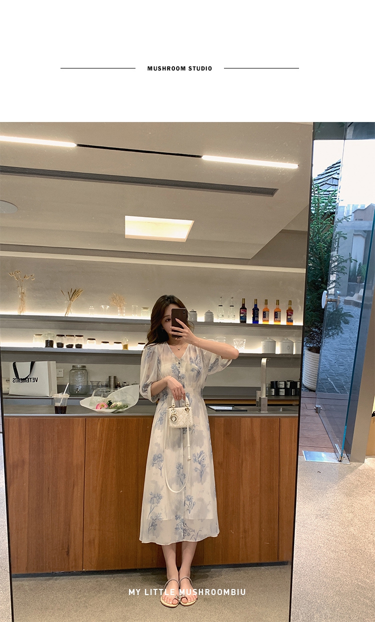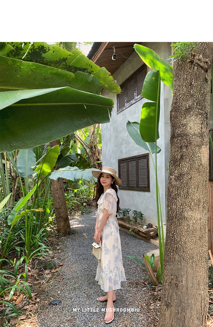 金蘑菇菇【蓝花屿系列】美哭原创油画印花小清新法式温柔风连衣裙