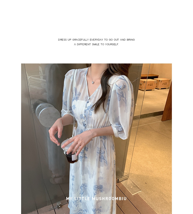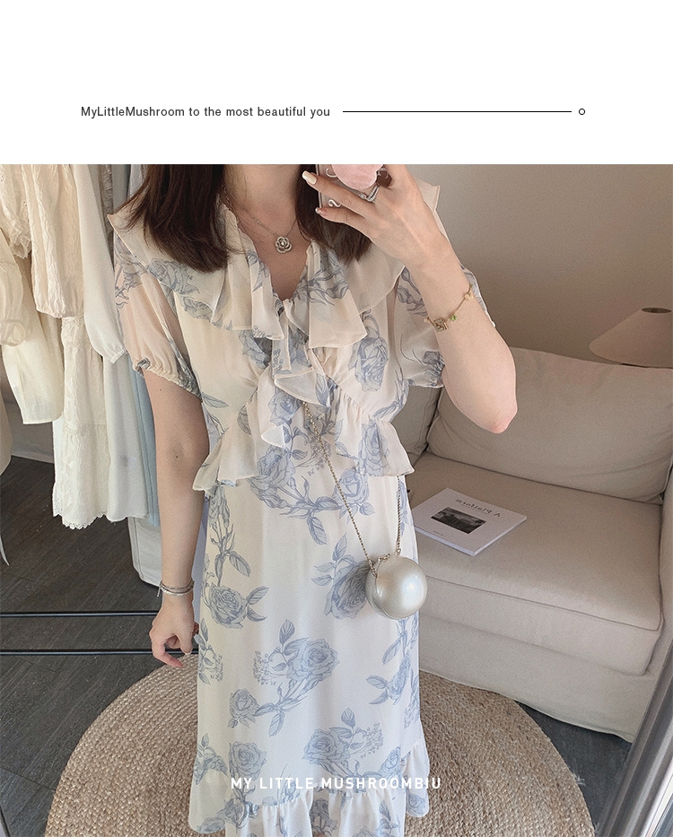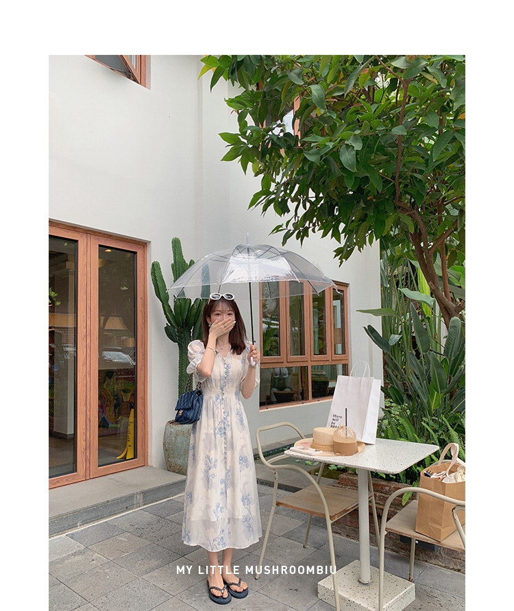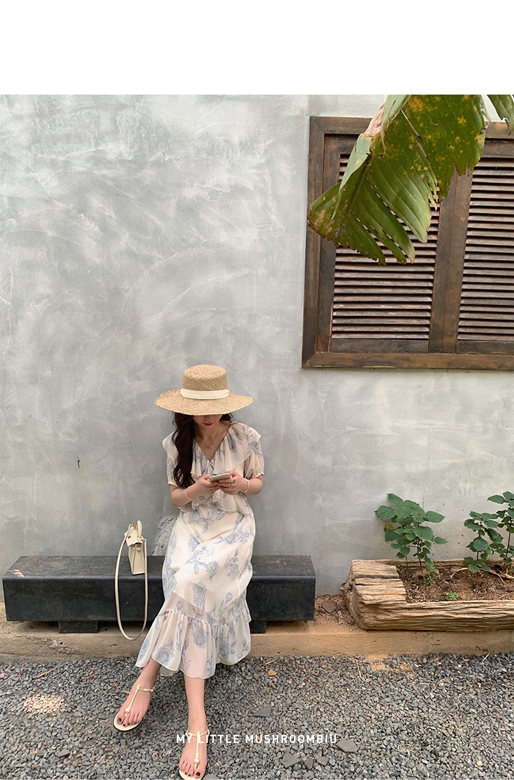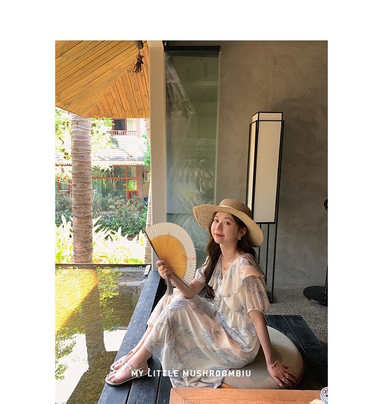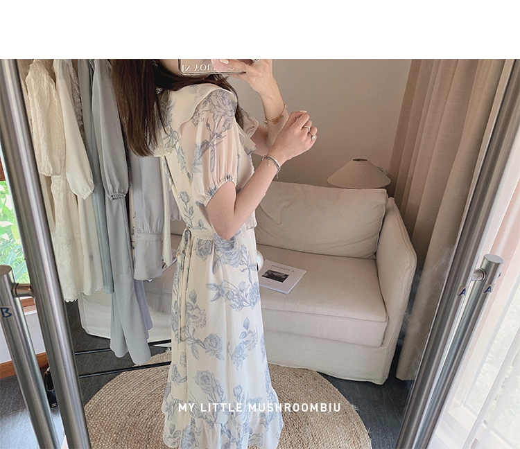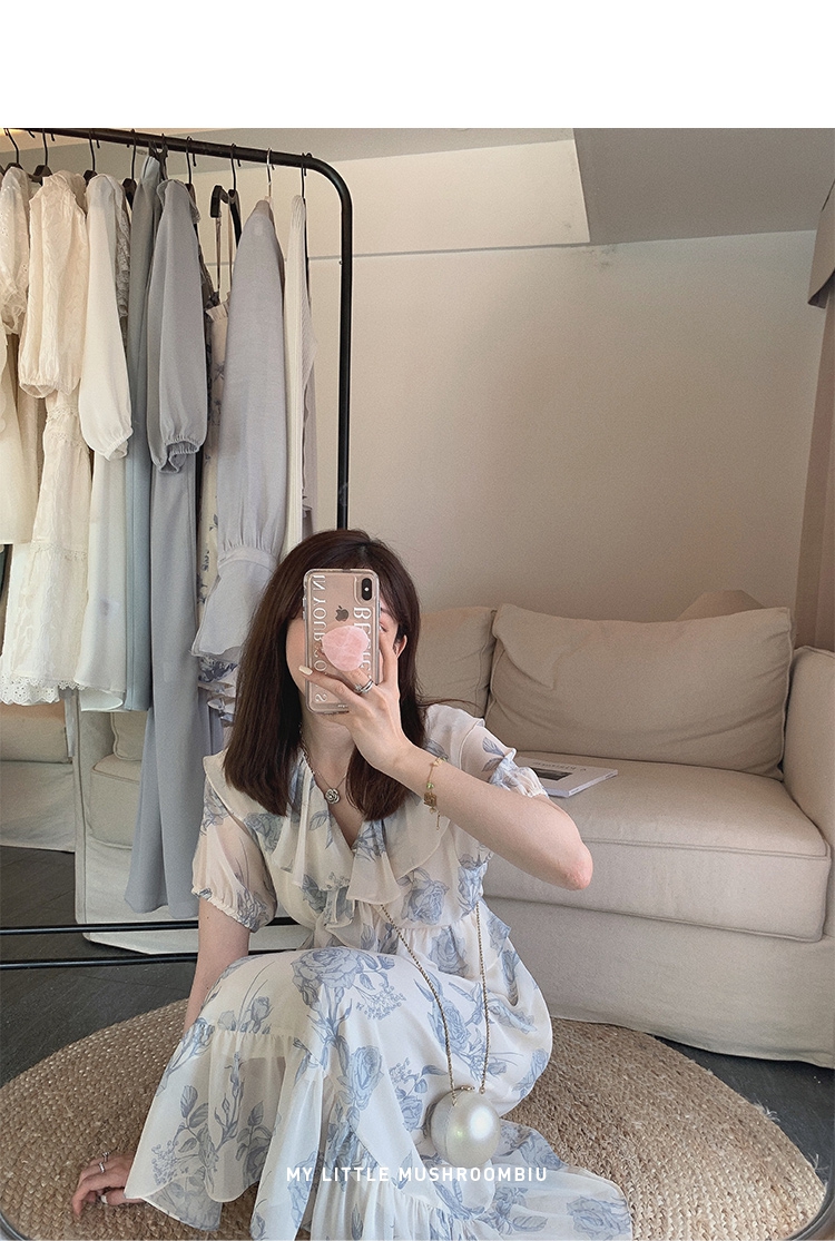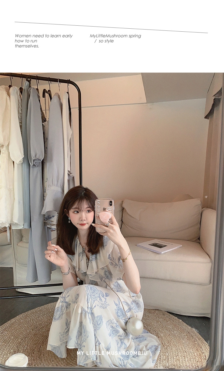 金蘑菇菇【蓝花屿系列】美哭原创油画印花小清新法式温柔风连衣裙