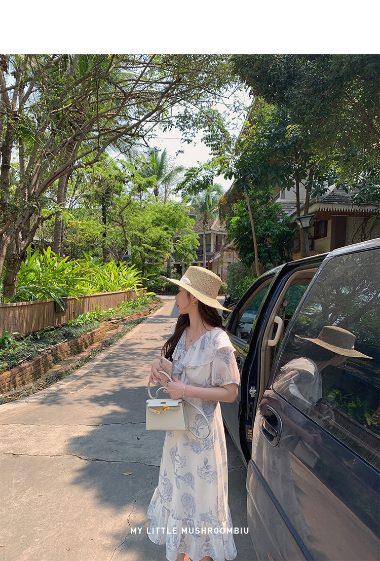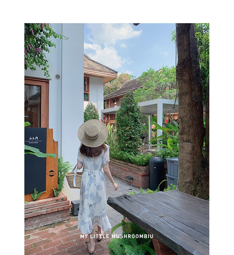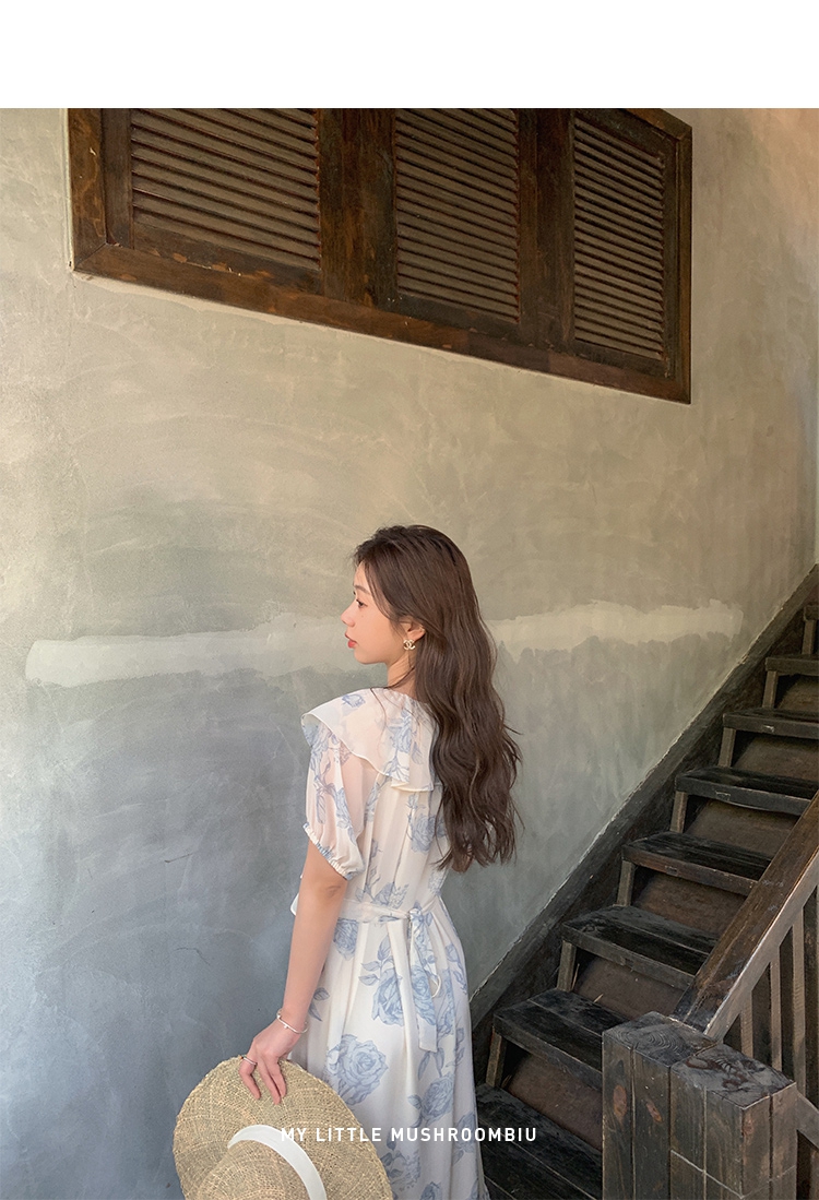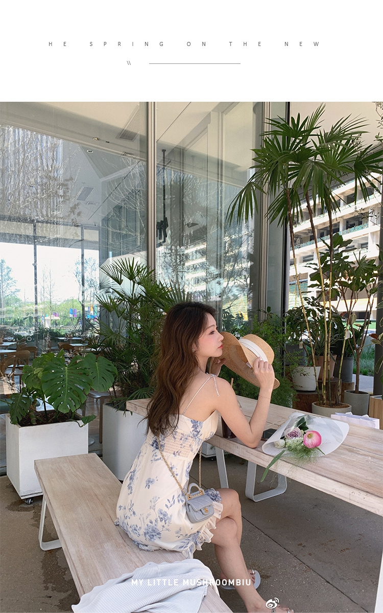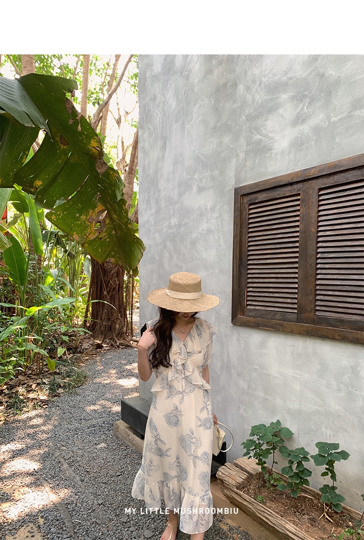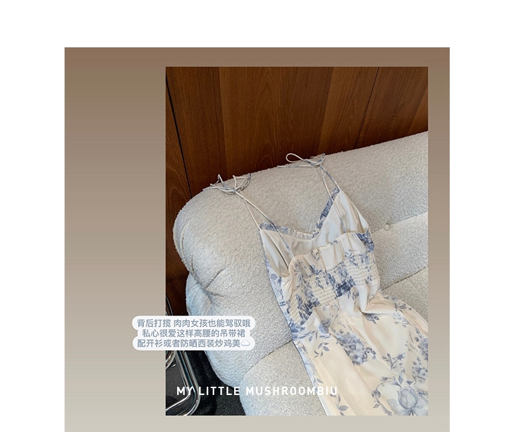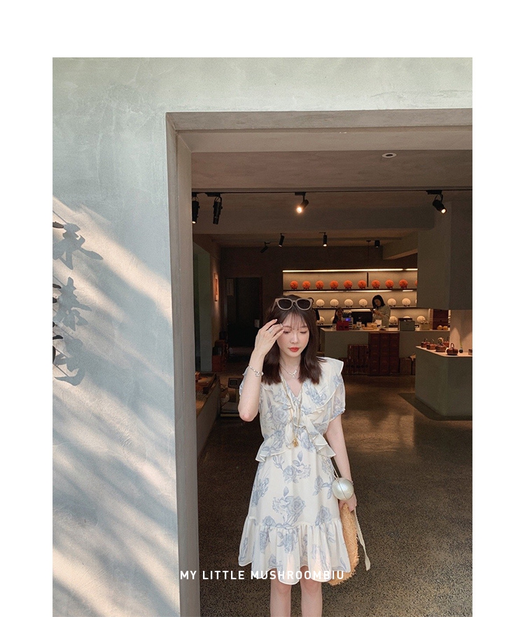 金蘑菇菇【蓝花屿系列】美哭原创油画印花小清新法式温柔风连衣裙