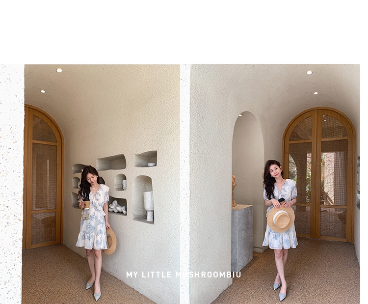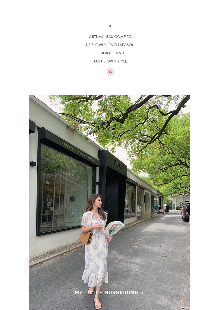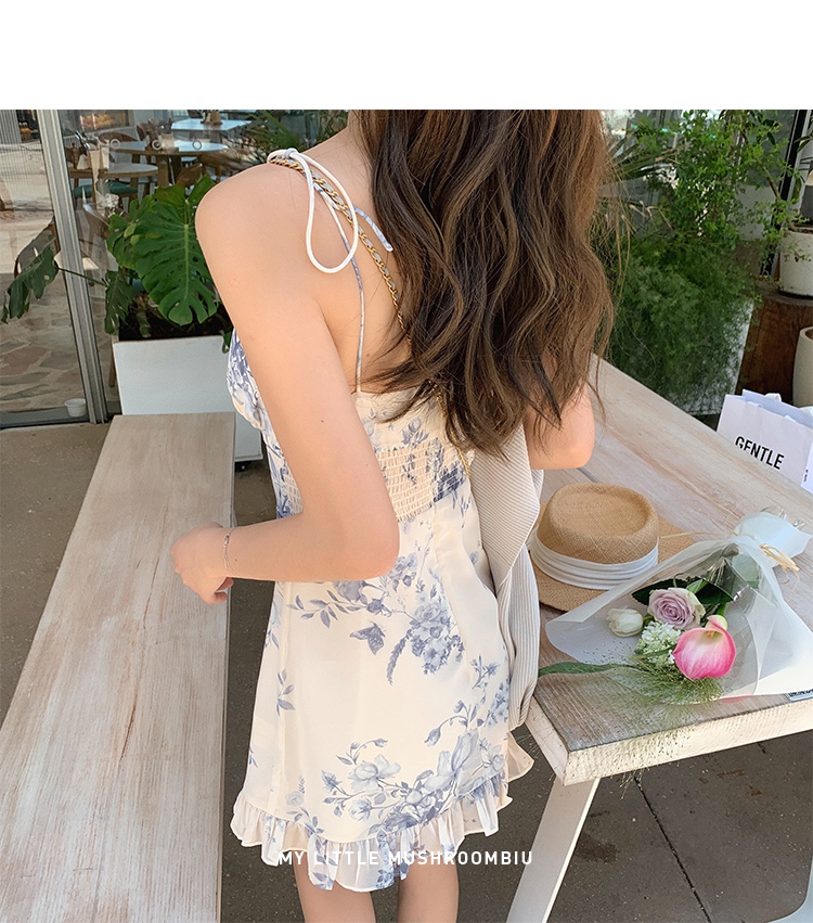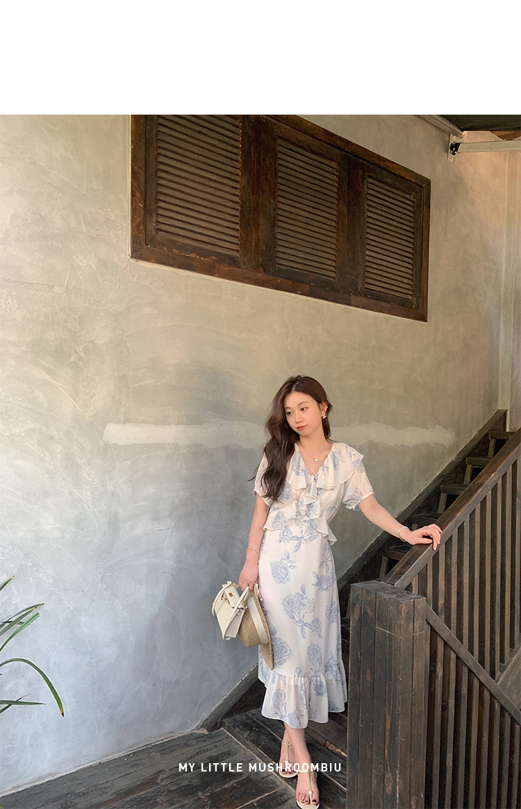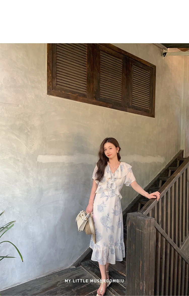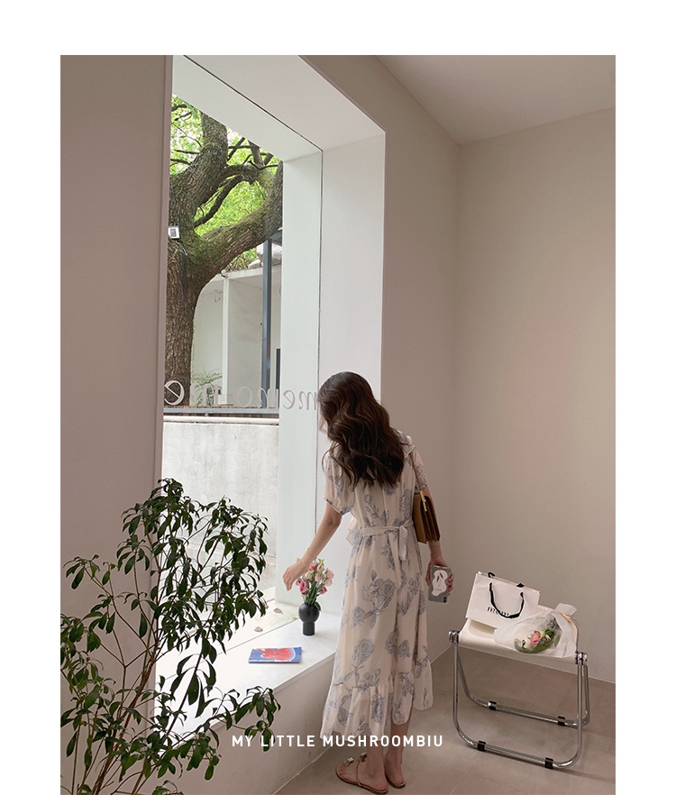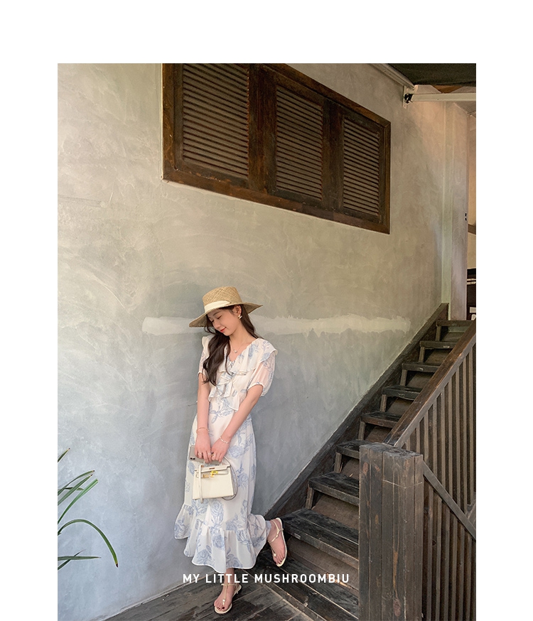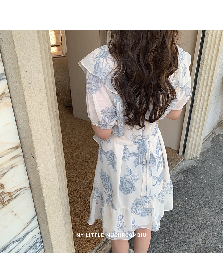 金蘑菇菇【蓝花屿系列】美哭原创油画印花小清新法式温柔风连衣裙