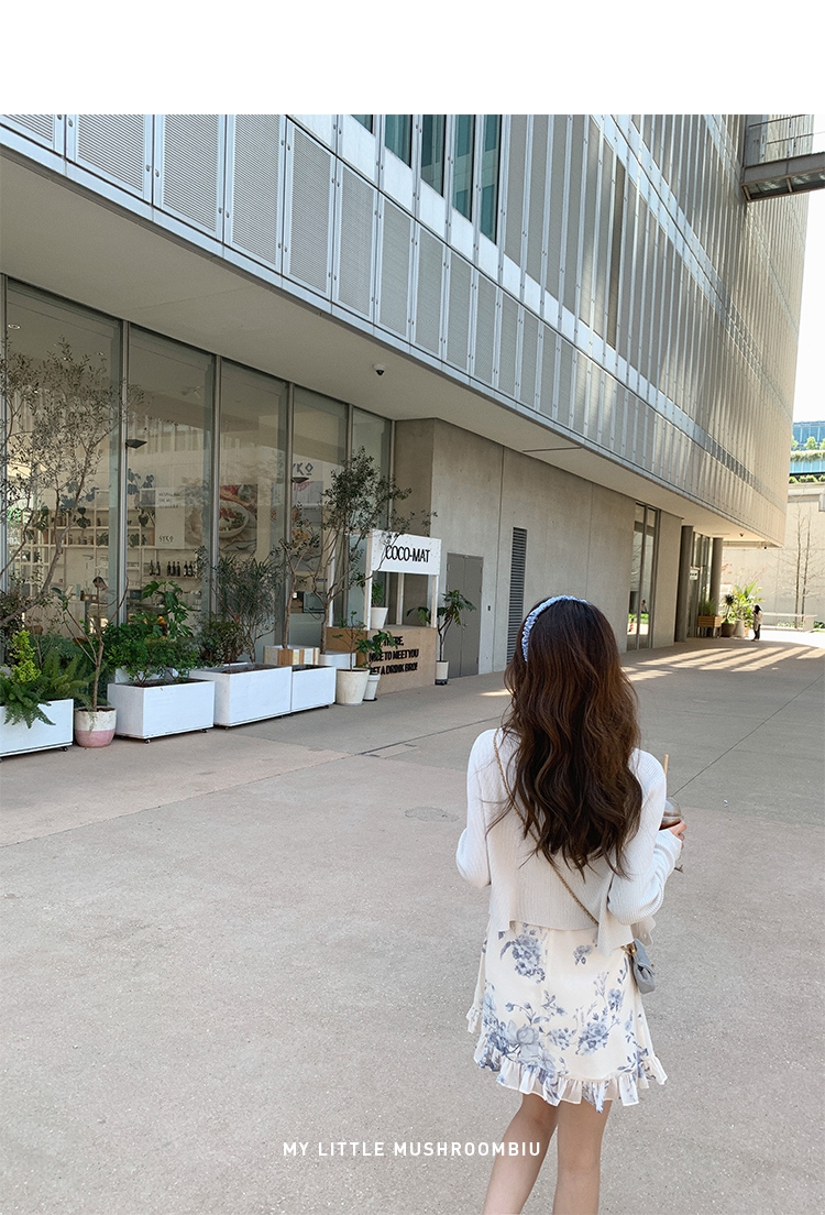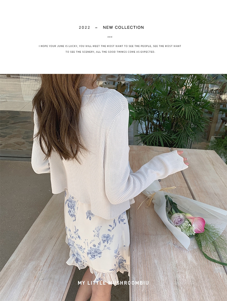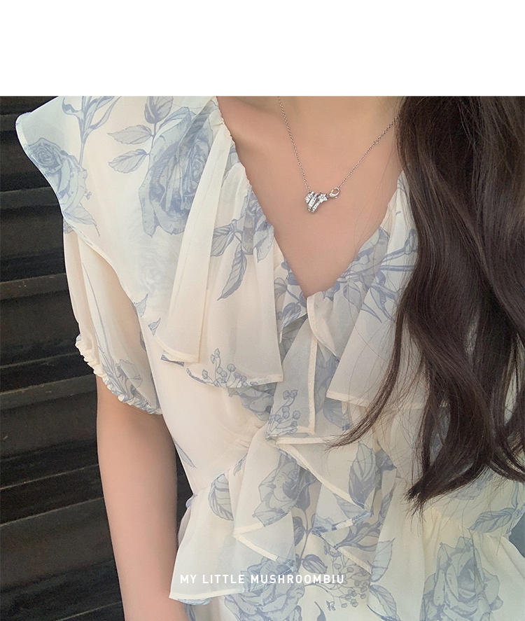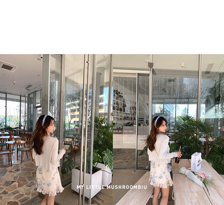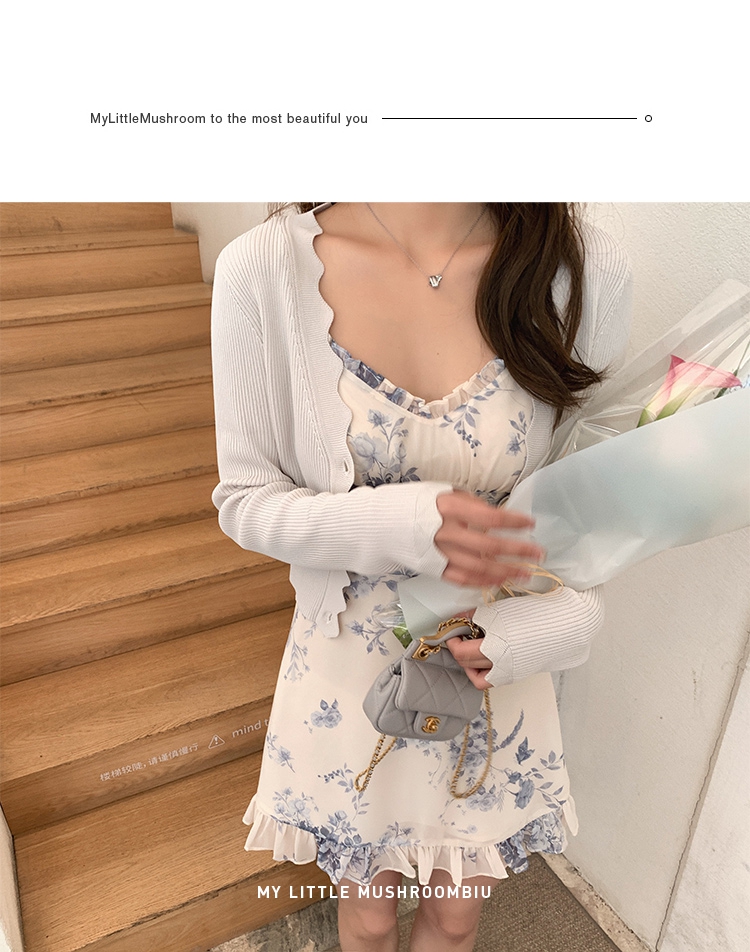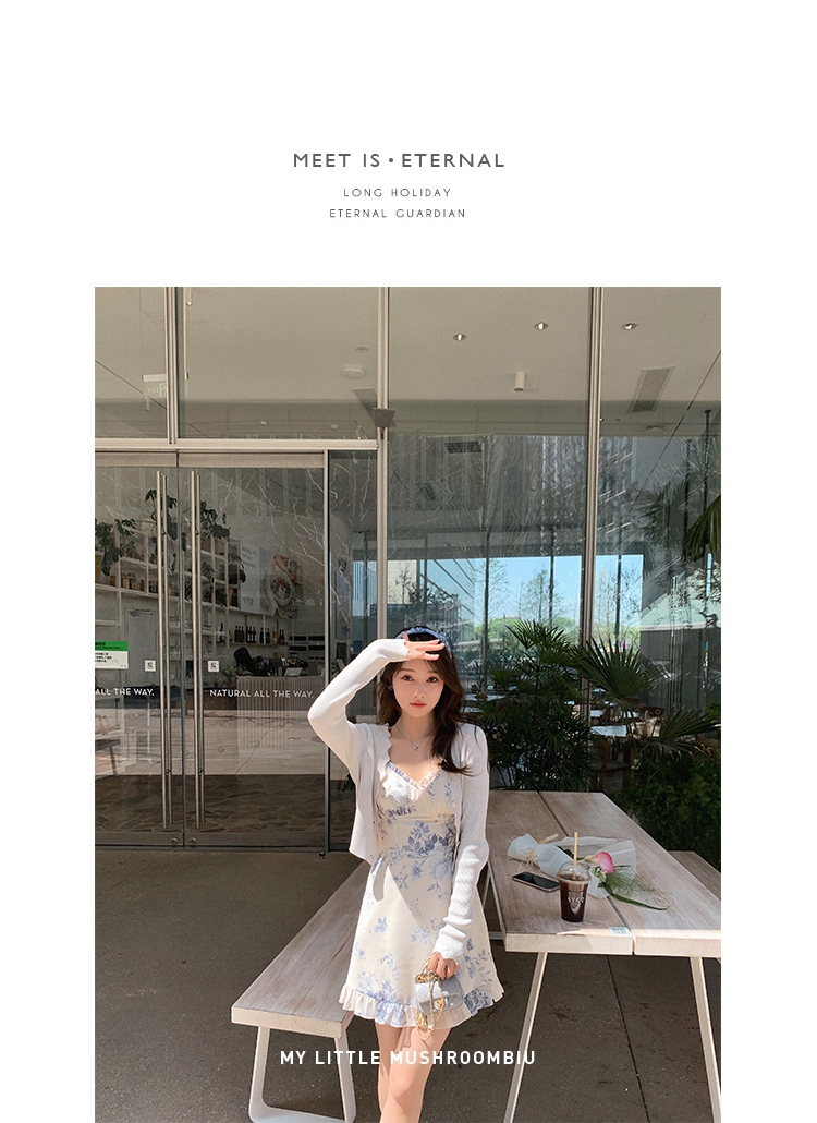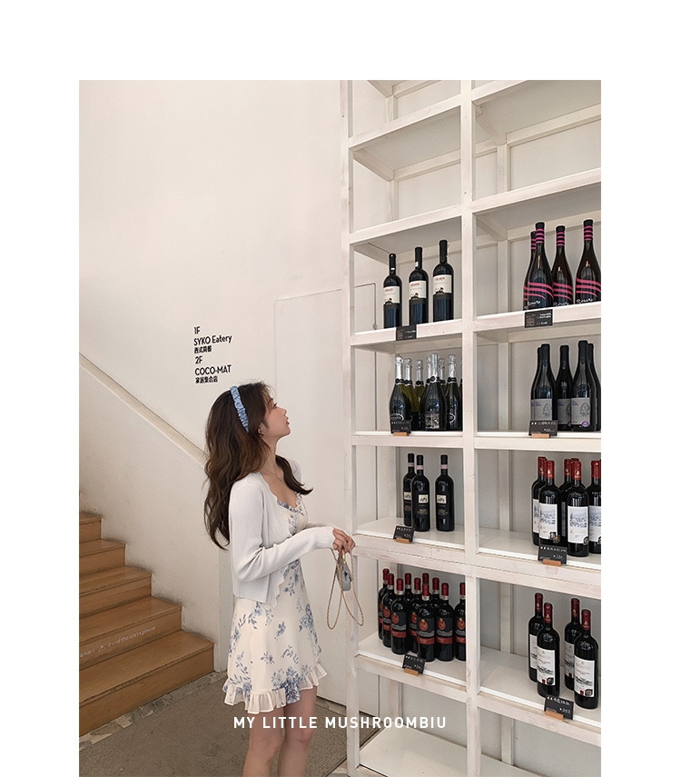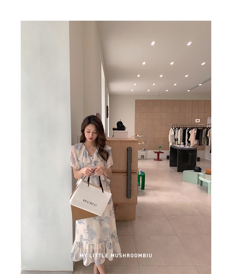 金蘑菇菇【蓝花屿系列】美哭原创油画印花小清新法式温柔风连衣裙