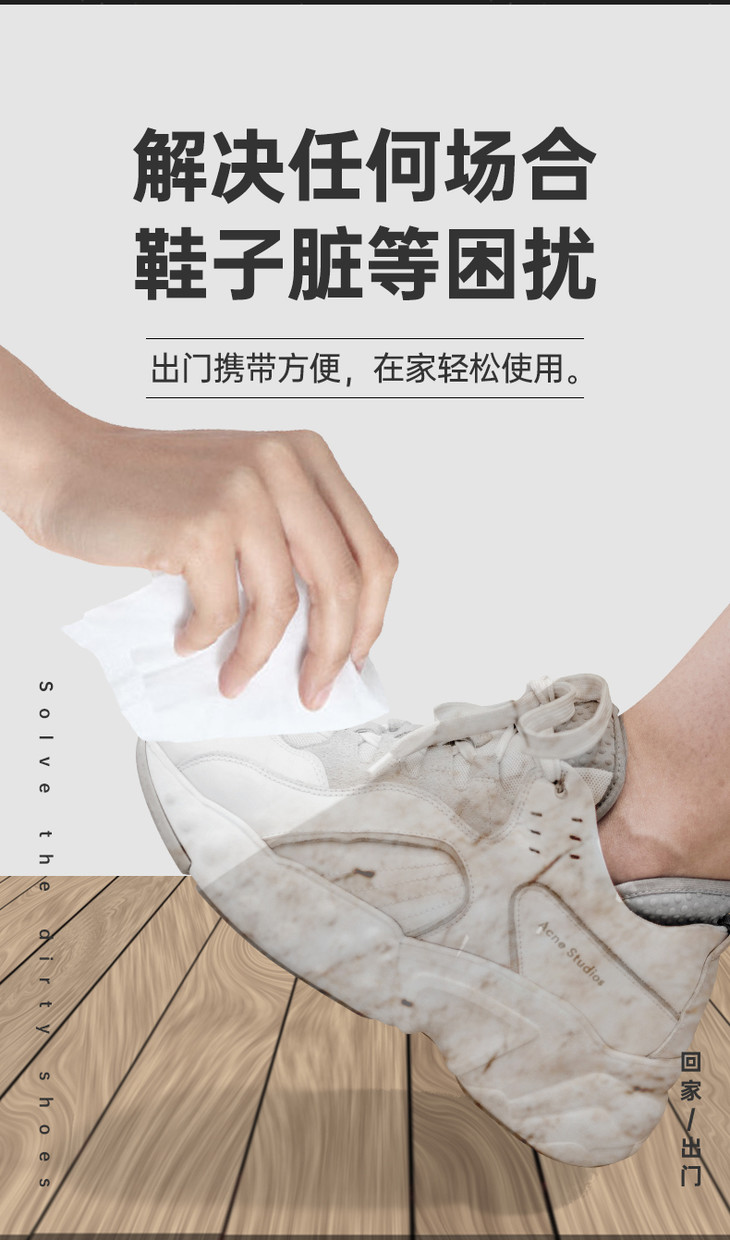 富含多种活性去污成分,快速渗透深层清洁,高效去污不伤手,只需一片即可迅速去除鞋子表面的油渍、污渍,汗渍等,一涂一擦,滋养鞋面,想白就是这么简单。