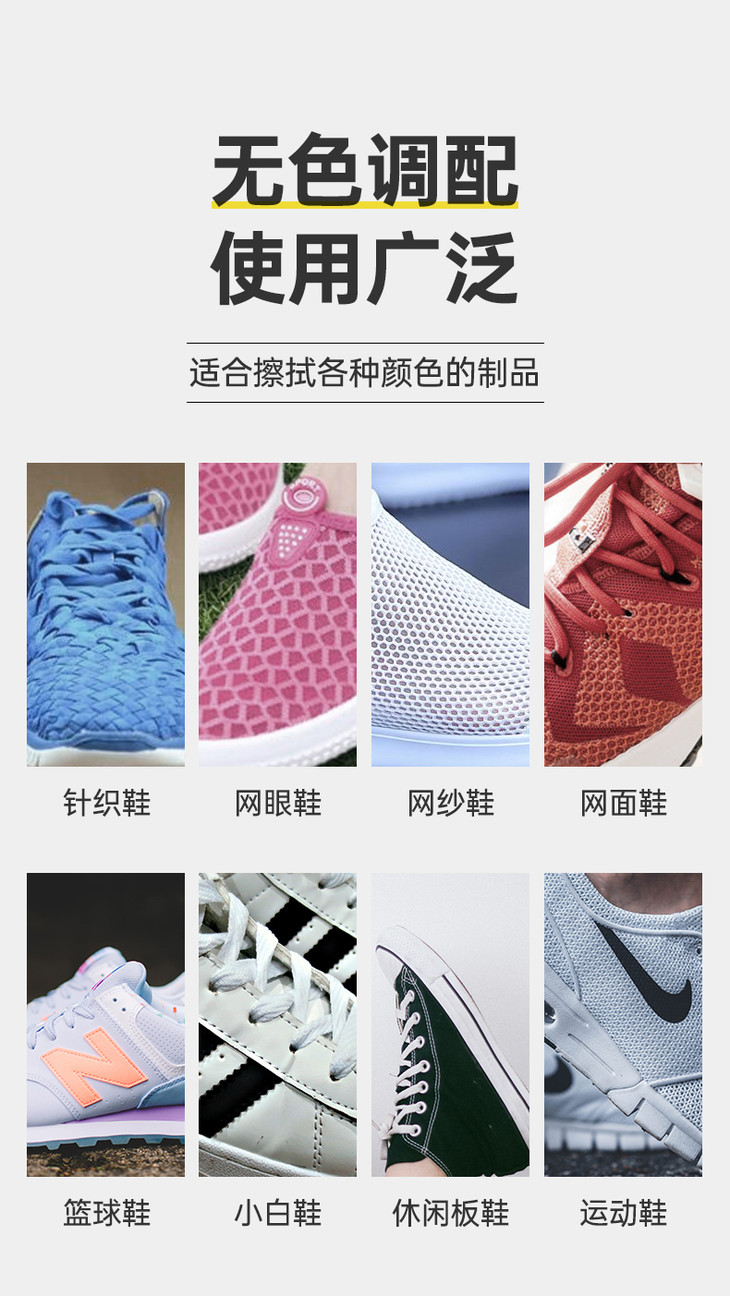 温和配方不伤鞋不伤手,免水、去污、养护、告别繁琐,一步到位!轻松快速。
