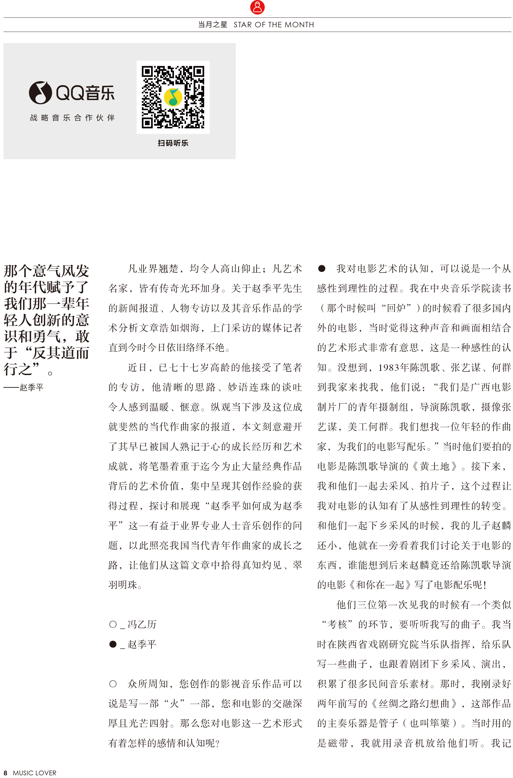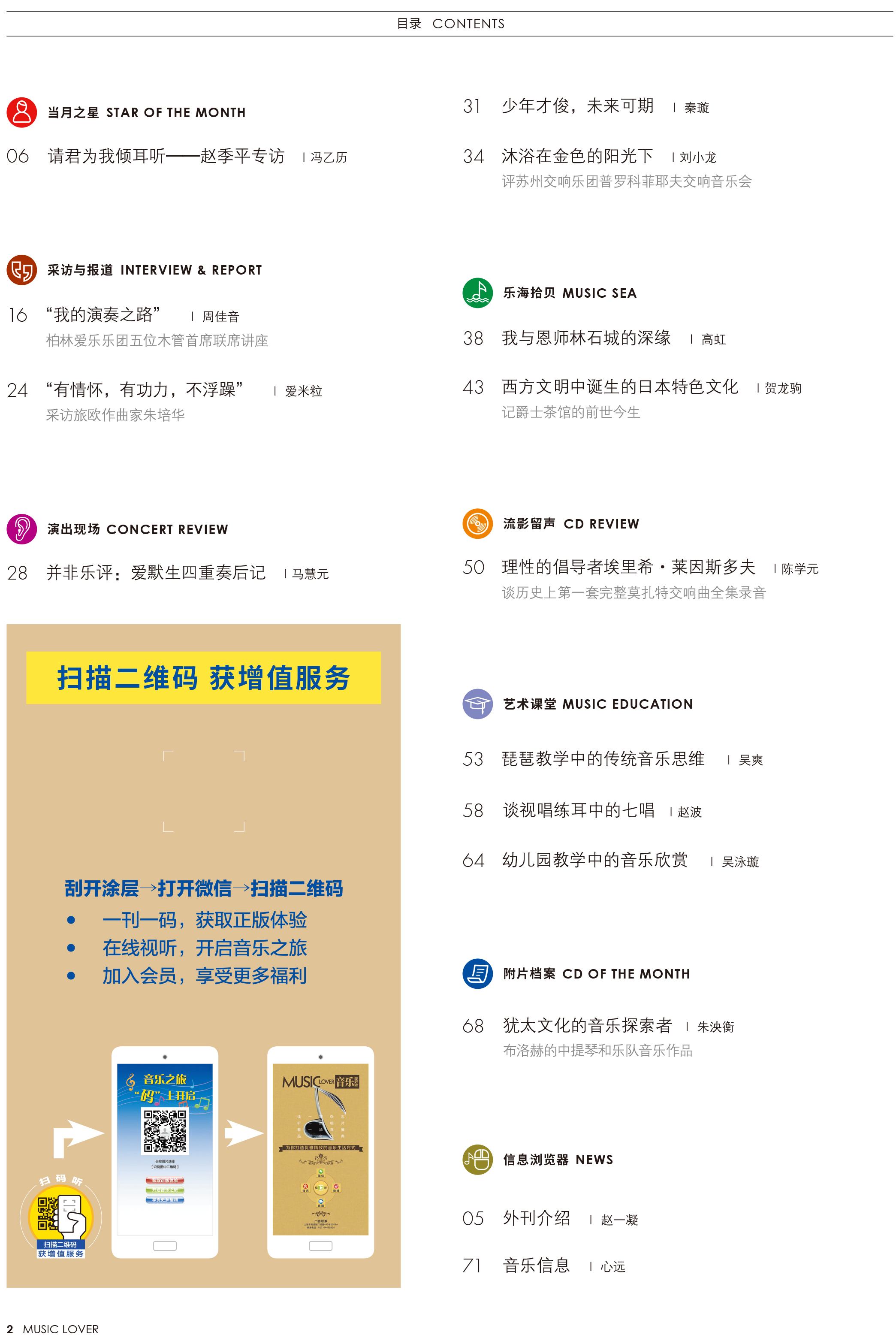 1979年创刊至今,《音乐爱好者》既坚持自己优雅精致的办刊传统,又和广大爱乐人一起,不断向更加辽阔的领域伸展新的视野和触角。对爱好者来说,音乐既是一份心心念念的精神向往,也是生活中扎扎实实的一个组成部分。《音乐爱好者》以音乐欣赏为中心,在经典音乐长廊里勾沉索隐,反映当代重大的音乐事件,将欣赏音乐与了解音乐、享受音乐结合起来。