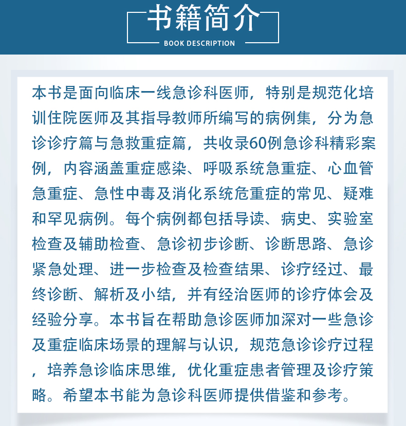 本书是面向临床一线急诊科医师,特别是规范化培训住院医师及其指导教师所编写的病例集,分为急诊诊疗篇与急救重症篇,共收录60例急诊科精彩案例,内容涵盖重症感染、呼吸系统急重症、心血管急重症、急性中毒及消化系统危重症的常见、疑难和罕见病例。每个病例都包括导读、病史、实验室检查及辅助检查、急诊初步诊断、诊断思路、急诊紧急处理、进一步检查及检查结果、诊疗经过、最终诊断、解析及小结,并有经治医师的诊疗体会及经验分享。本书旨在帮助急诊医师加深对一些急诊及重症临床场景的理解与认识,规范急诊诊疗过程,培养急诊临床思维,优化重症患者管理及诊疗策略。希望本书能为急诊科医师提供借鉴和参考。