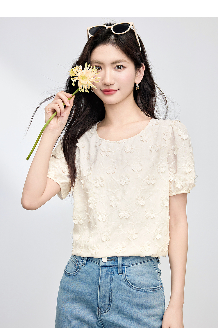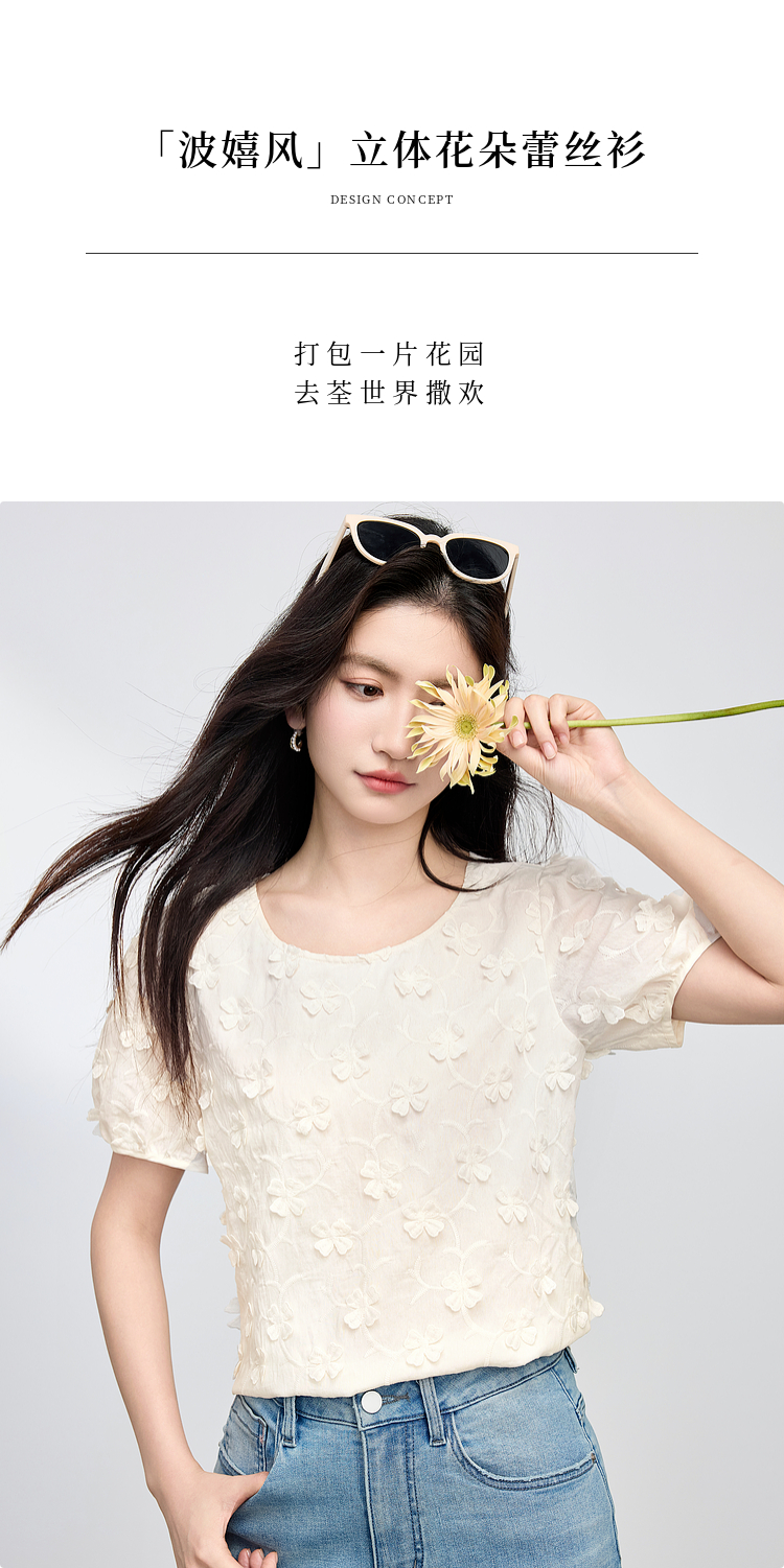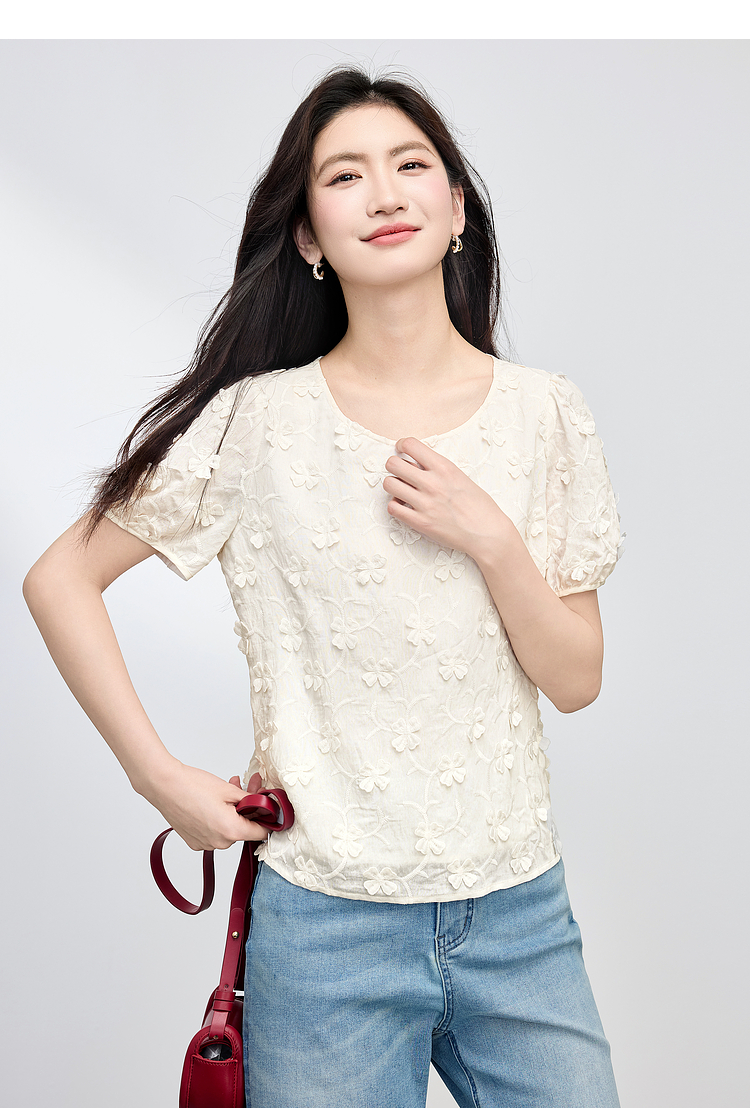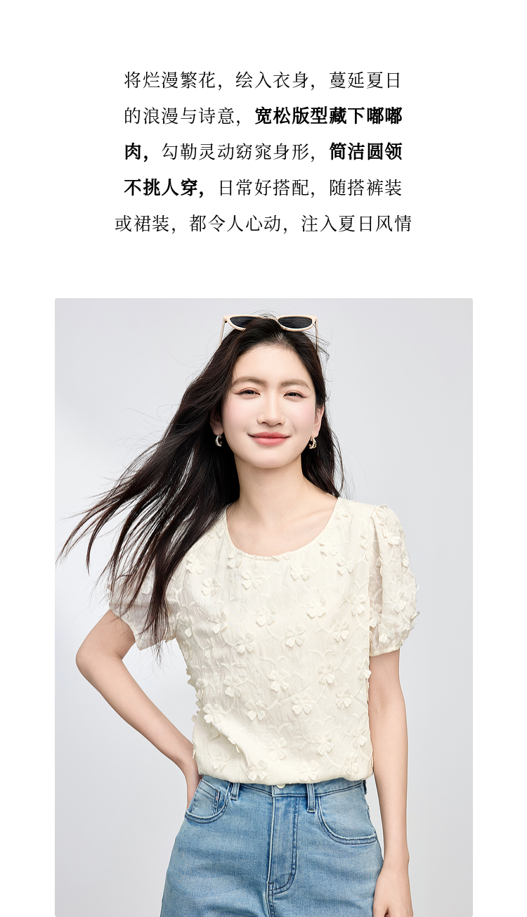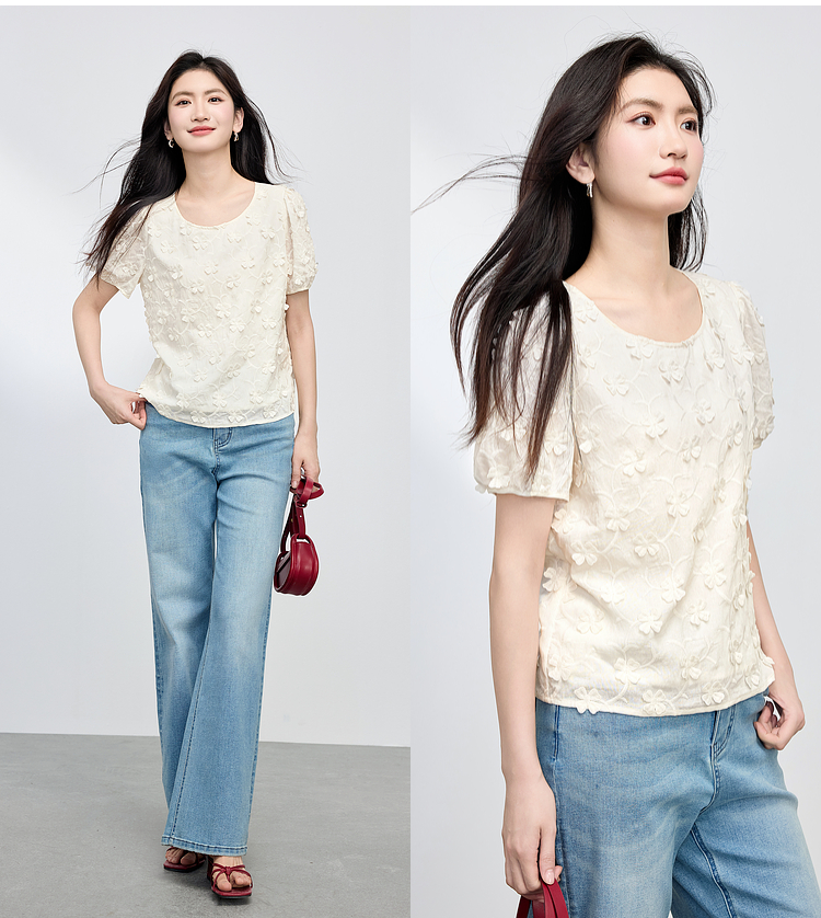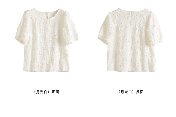 【周四狂欢价】熙世界立体花朵蕾丝衬衫夏宽松白色圆领短袖小衫上衣