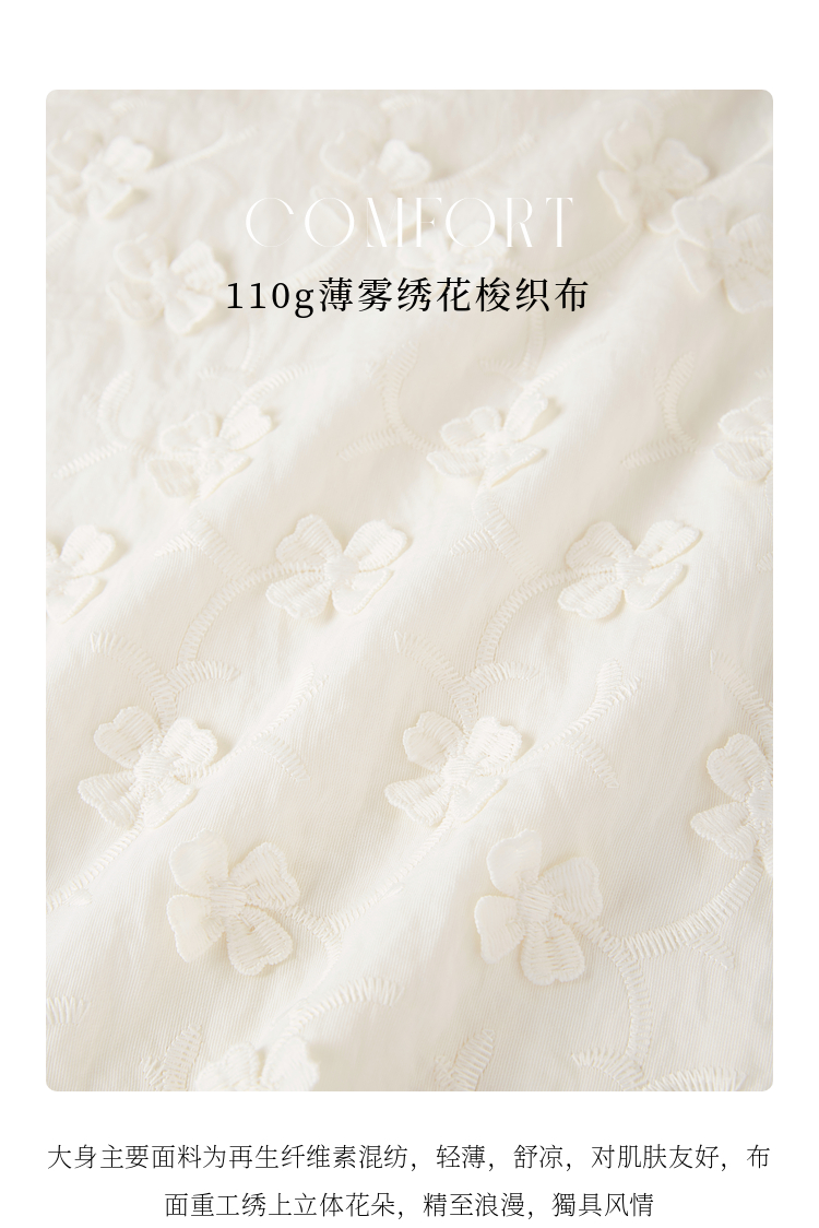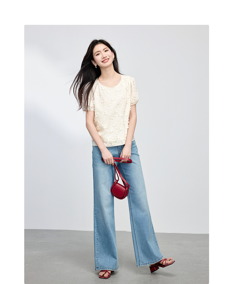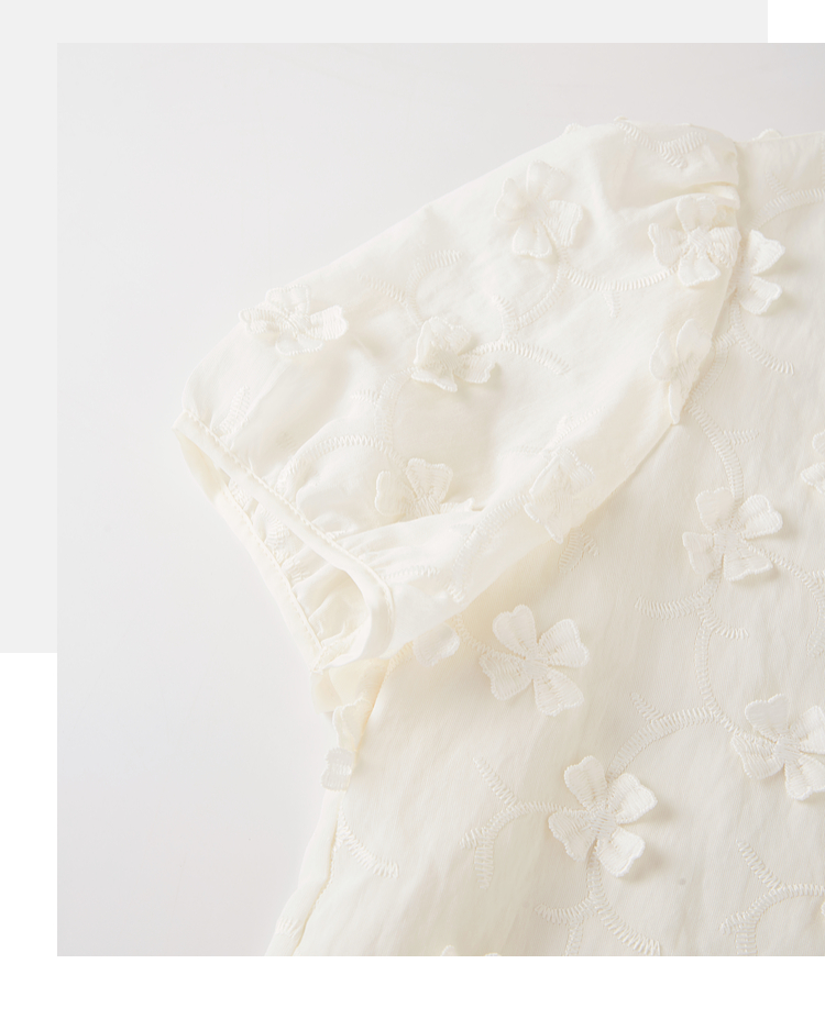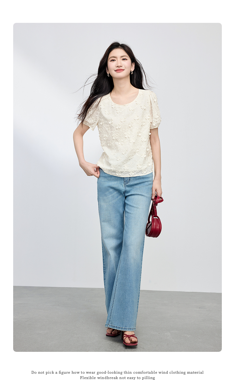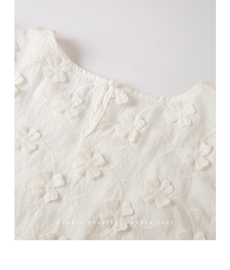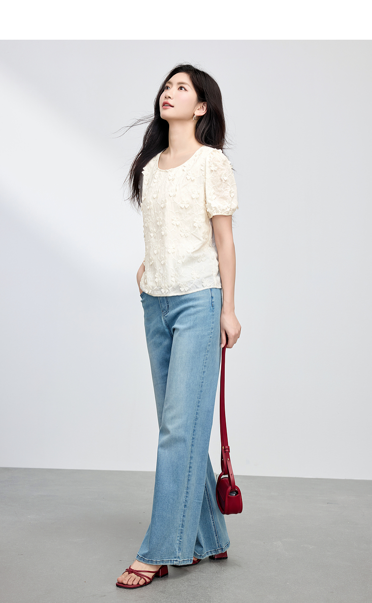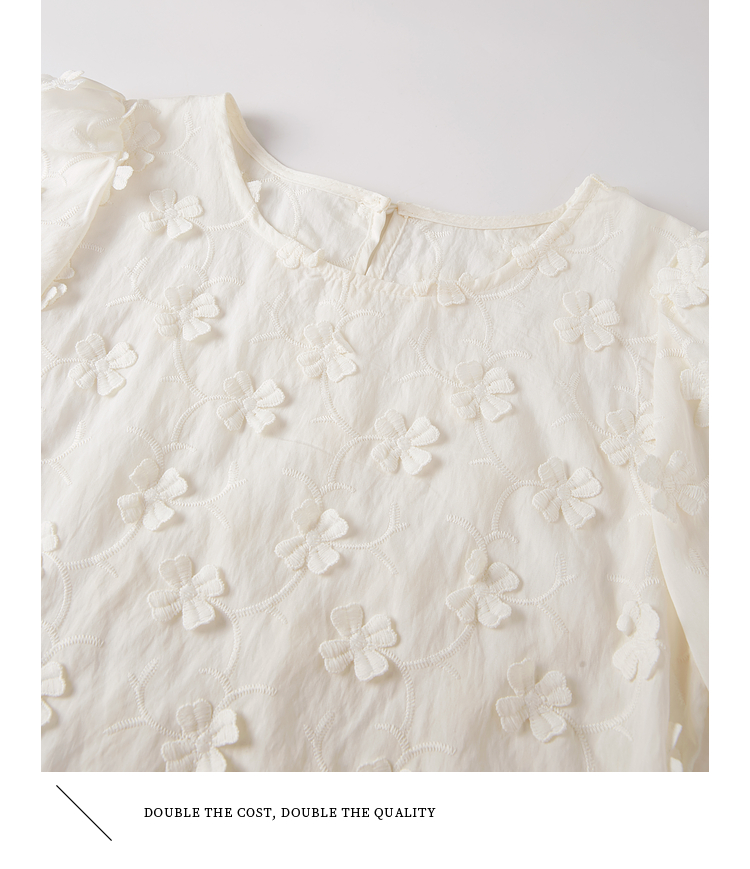 【周四狂欢价】熙世界立体花朵蕾丝衬衫夏宽松白色圆领短袖小衫上衣