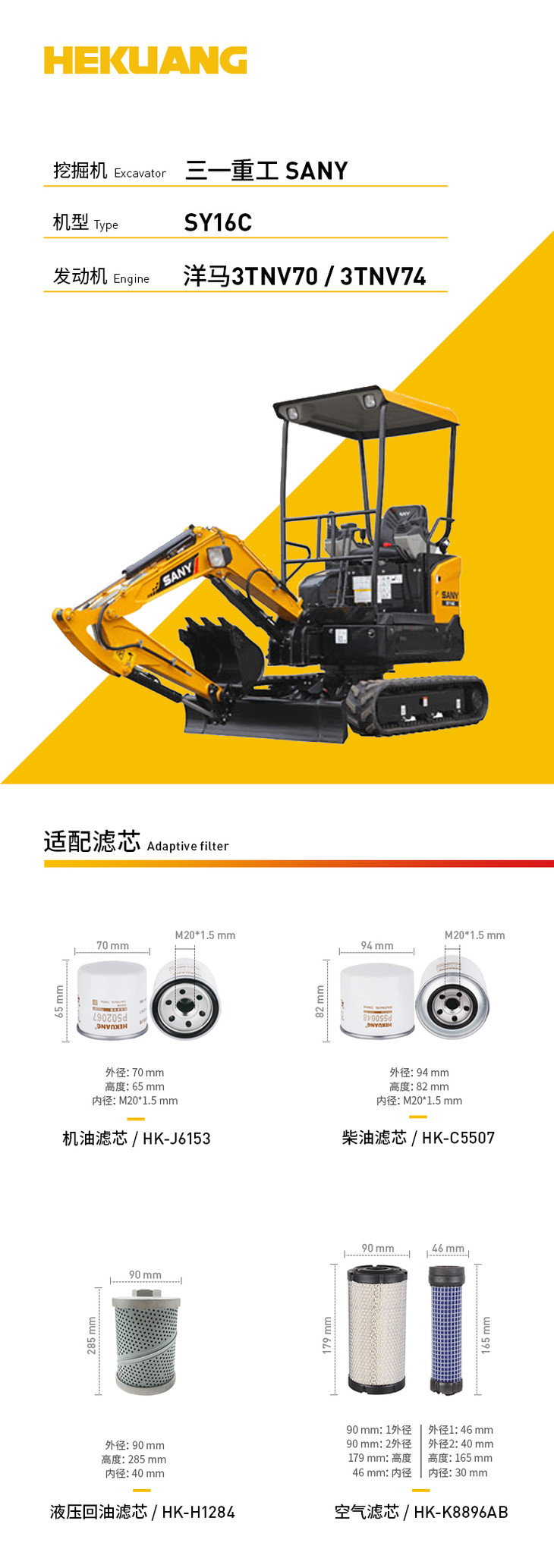 三一重工SY16C(洋马3TNV70/3TNV74)挖掘机适配滤芯 机柴滤芯 液压油吸油回油滤芯 空气滤芯 先导滤芯