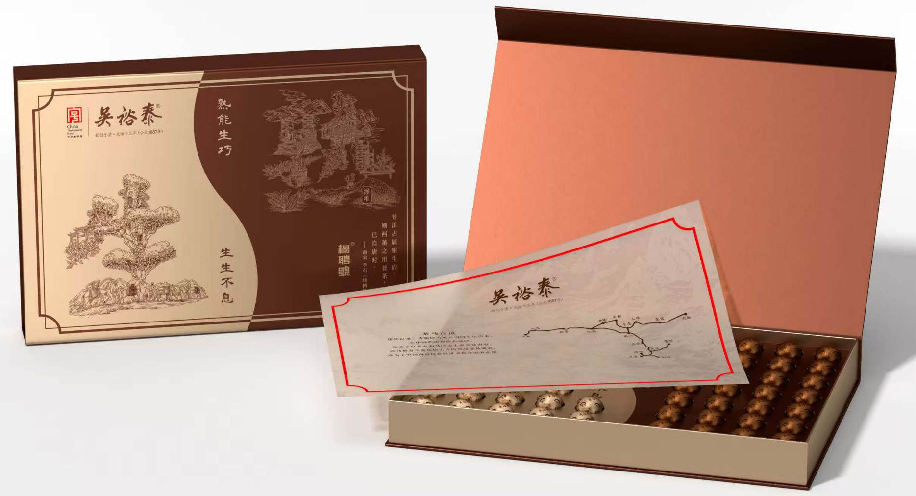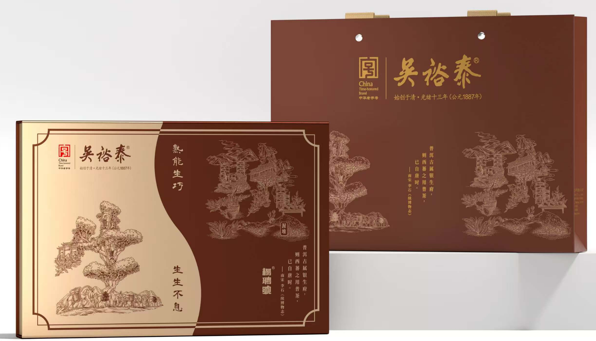 盒面左侧,以云南当地风光、架梯采茶场景及茶马古道元素构成“生” 字,生动展现产地自然韵味,传递普洱生茶原生、质朴的特性;盒面右侧的“熟” 字则由制茶工艺勾勒,彰显普洱熟茶匠心品质与醇厚风味。