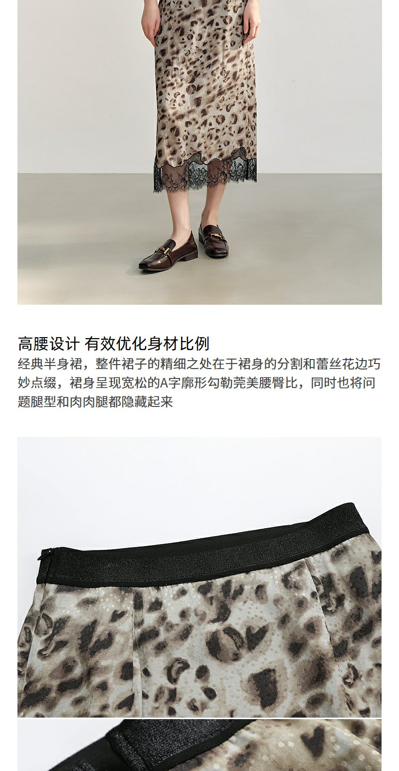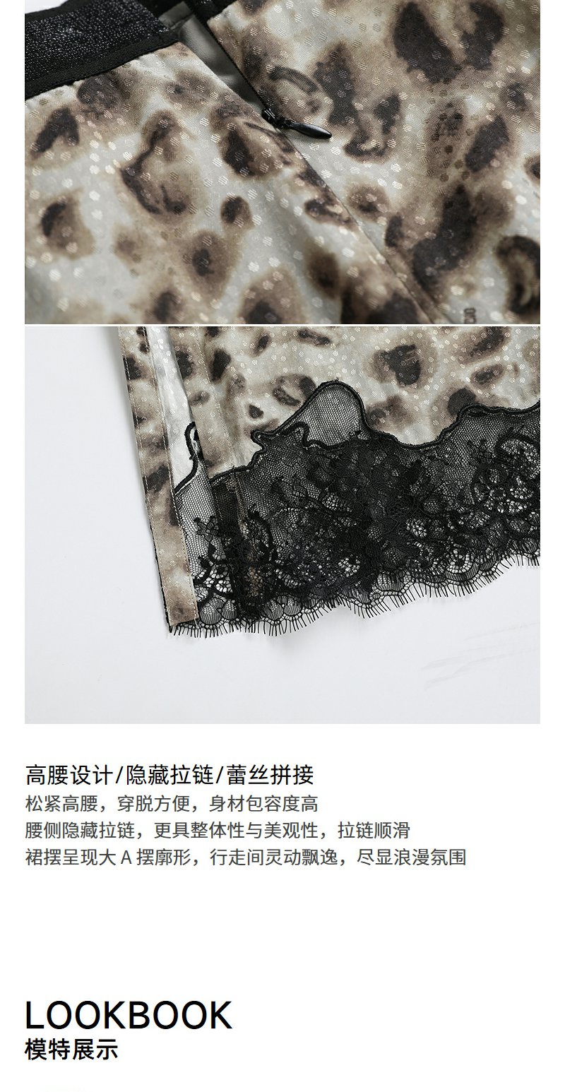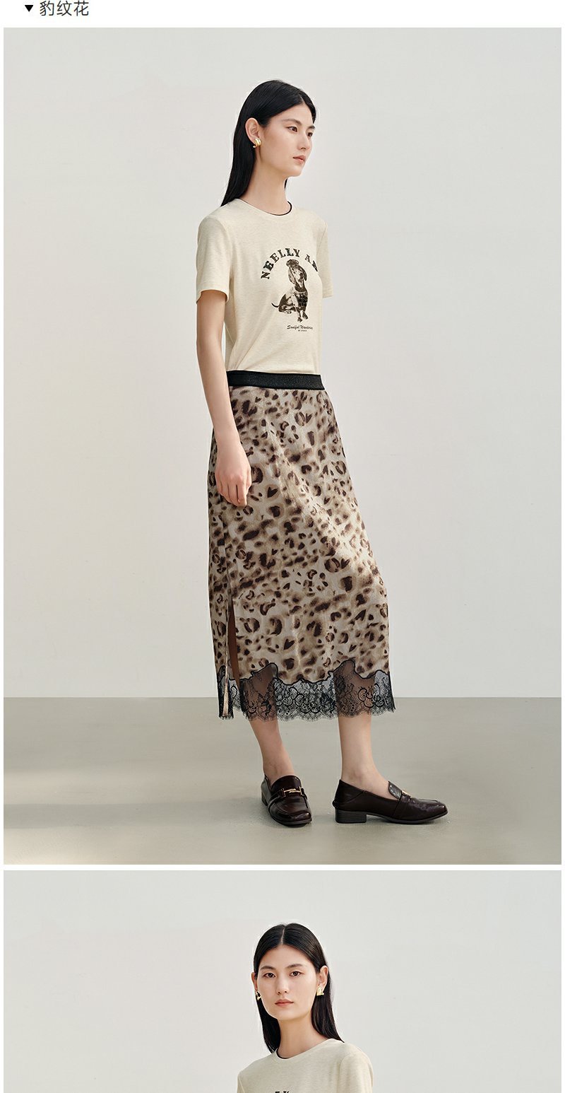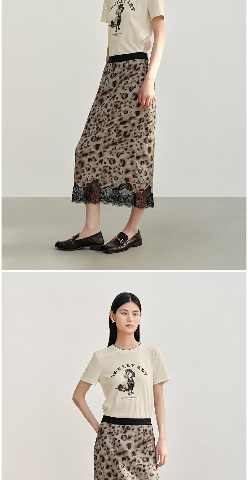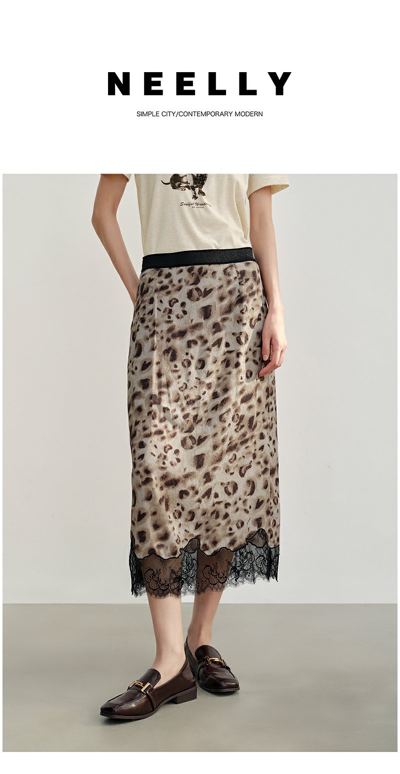 NEELLY纳俪商场同款秋新款豹纹蕾丝拼接半身裙女高级感显瘦中长裙N25082E01097
