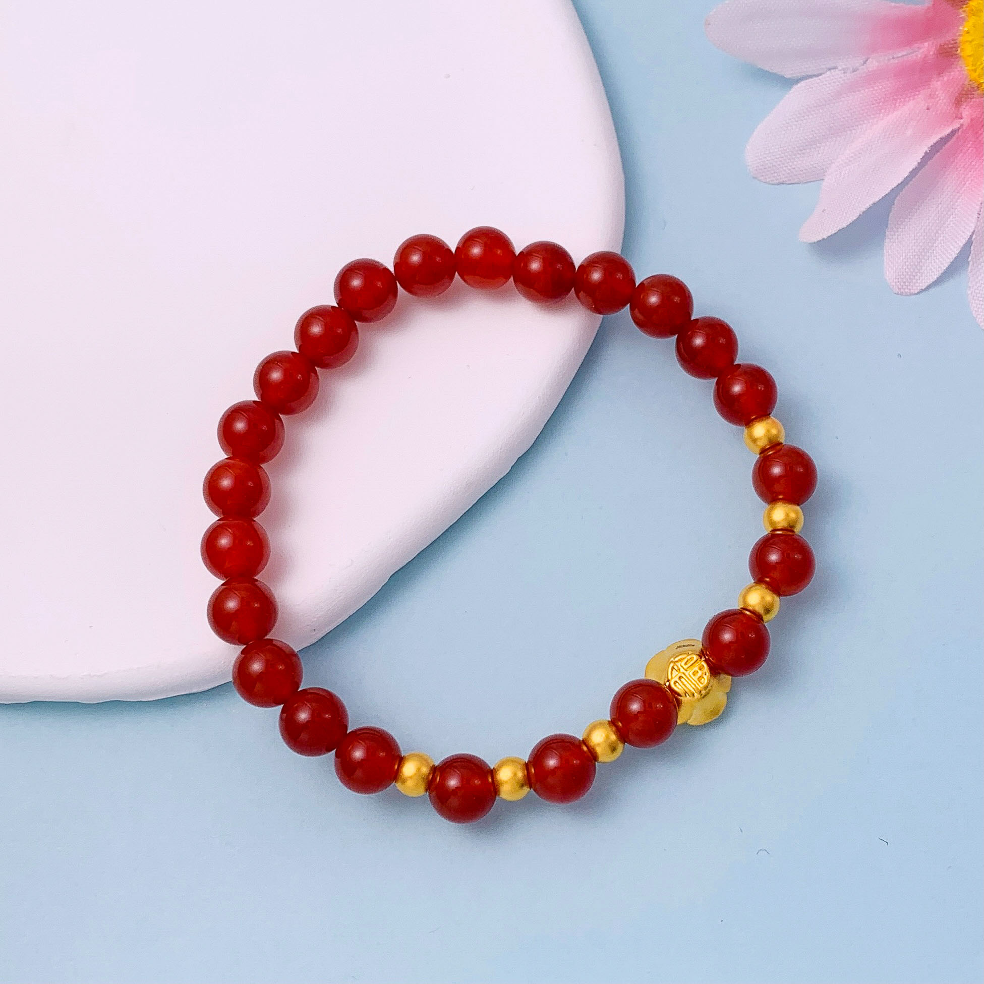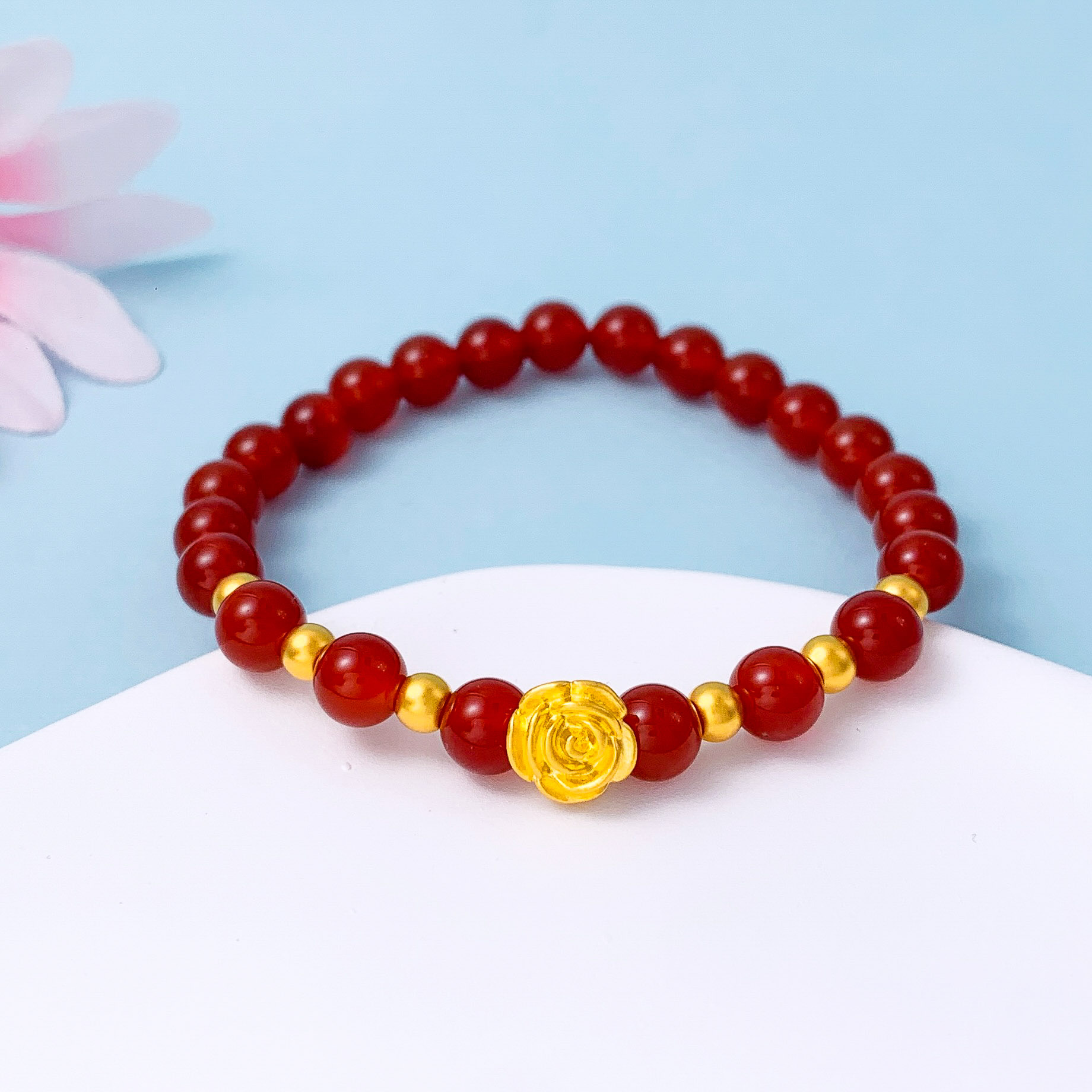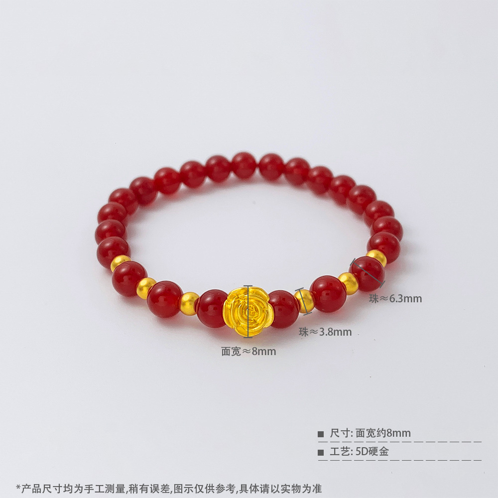【限时7.5折】【定价黄金】足金 #微硬金 无氰5D硬金邂逅爱情浪漫玫瑰花小金珠红玛瑙圆珠手链弹力绳手串(AA5DSC00072)(预售产品下单后不退款不退货不换货不补差价)