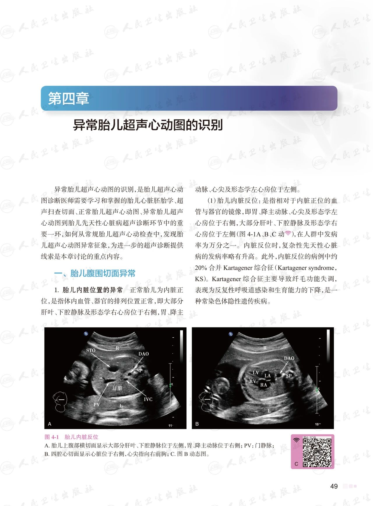 3全书附有示意图、解剖图、二维超声图及彩色多普勒血流图、动态视频图像,并介绍了50余种胎儿先天性心脏病在各切面上的异常声像图表现,便于读者学习掌握胎儿超声心动图扫查方法,重点突出、内容凝练,具有很好的参考性和实用性。