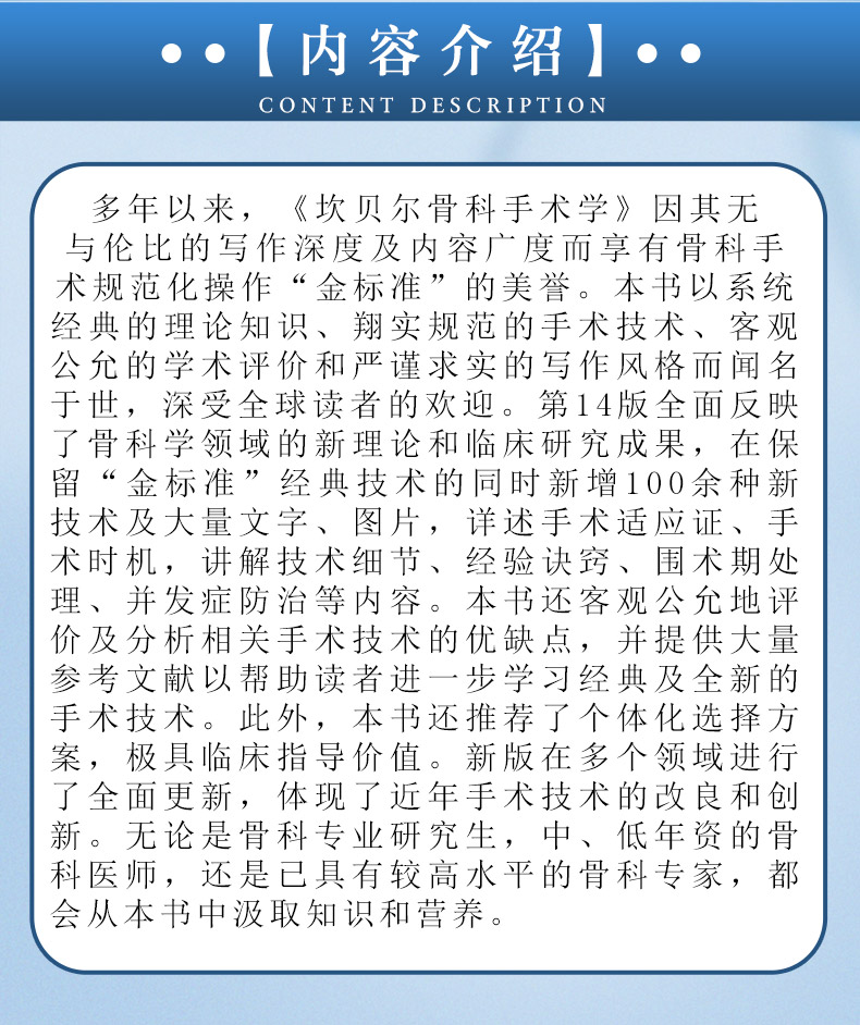 ?第14版在保留部分被视为“金标准”的经典手术技术的同时,新增了100余种新手术技术和大量文字、图片,为骨科医师准确把握手术适应证、手术时机及各种手术操作技术和技巧提供了科学指导,再次实现了沉淀经典与积极创新的完美结合。