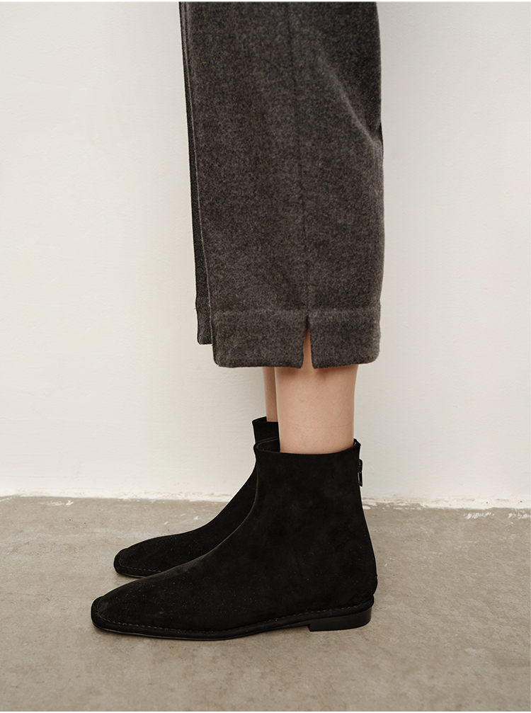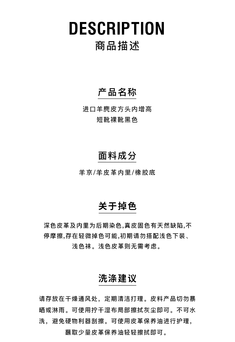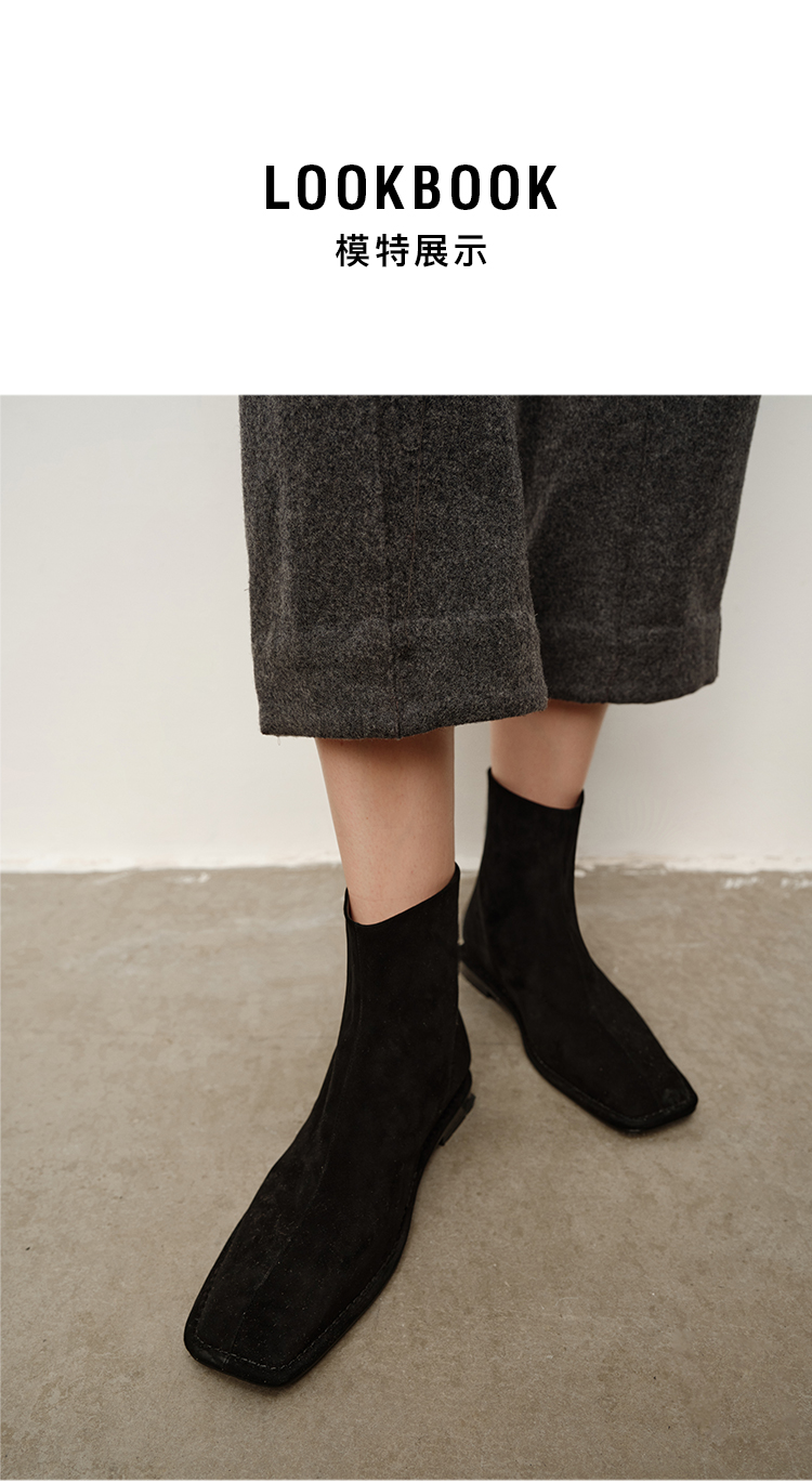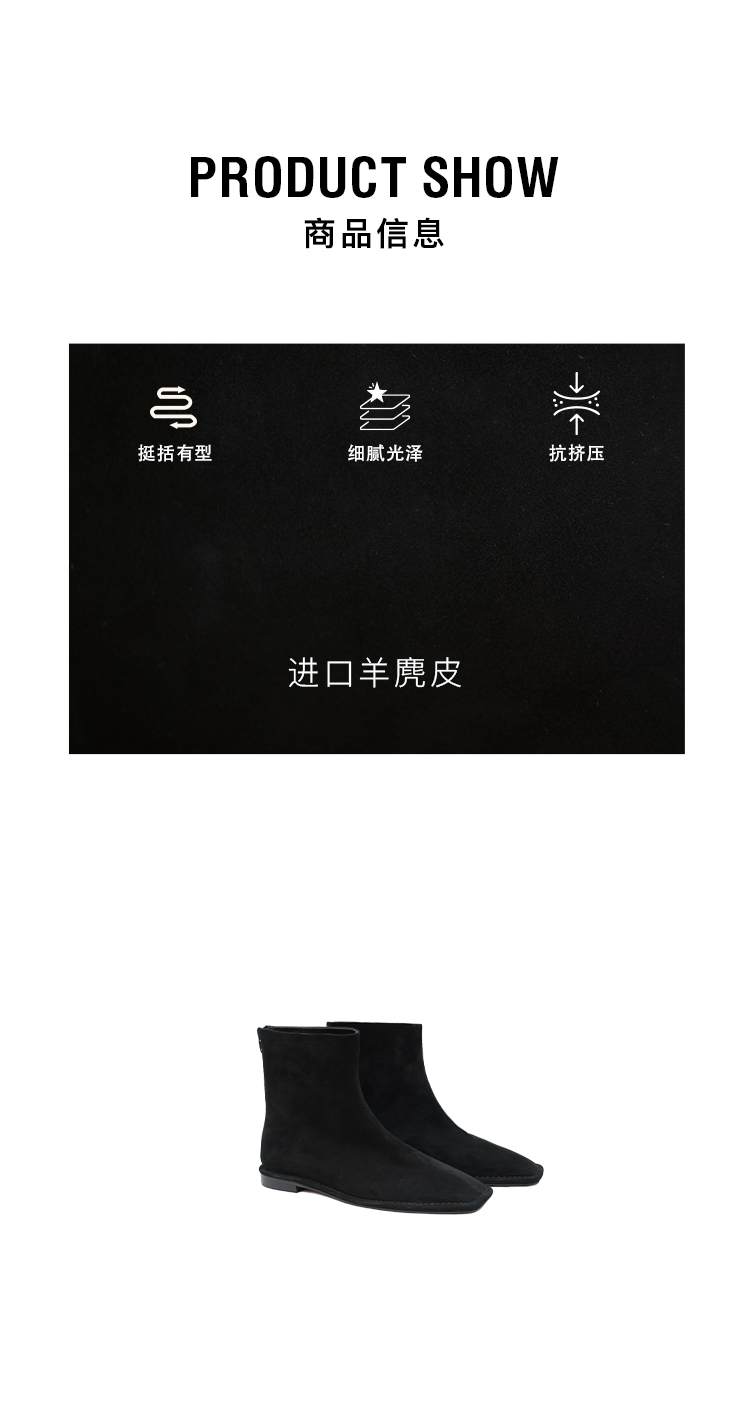 HIDEMI 进口羊麂皮方头内增高短靴裸靴 黑色