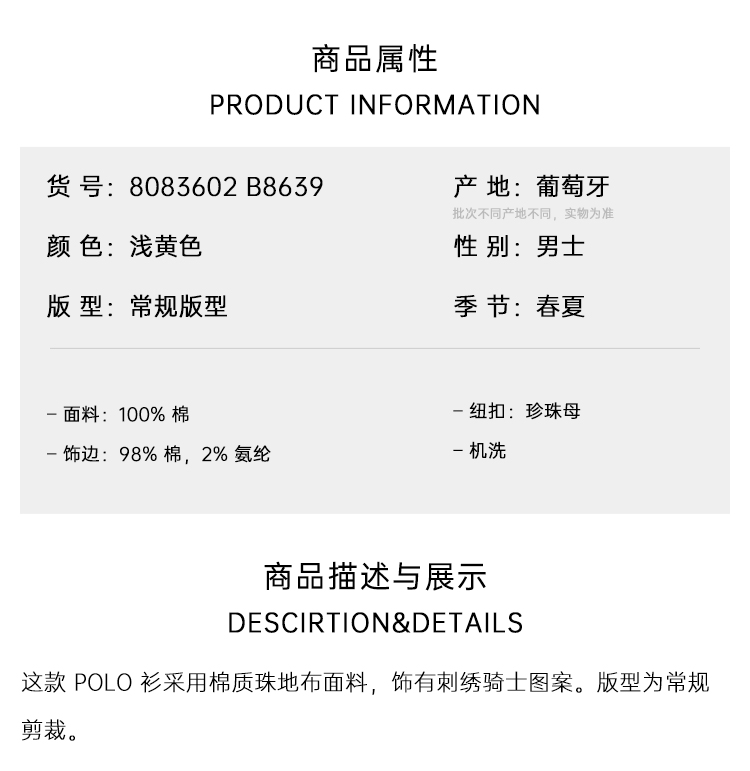 【一】BURBERRY 巴宝莉 男士马术骑士刺绣徽标棉质短袖 Polo 衫 黄色 8083602 B8639