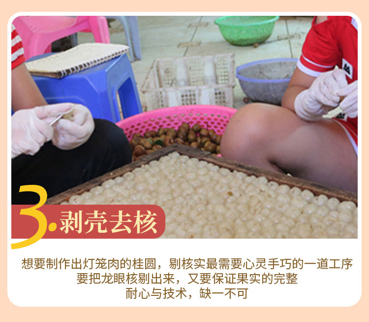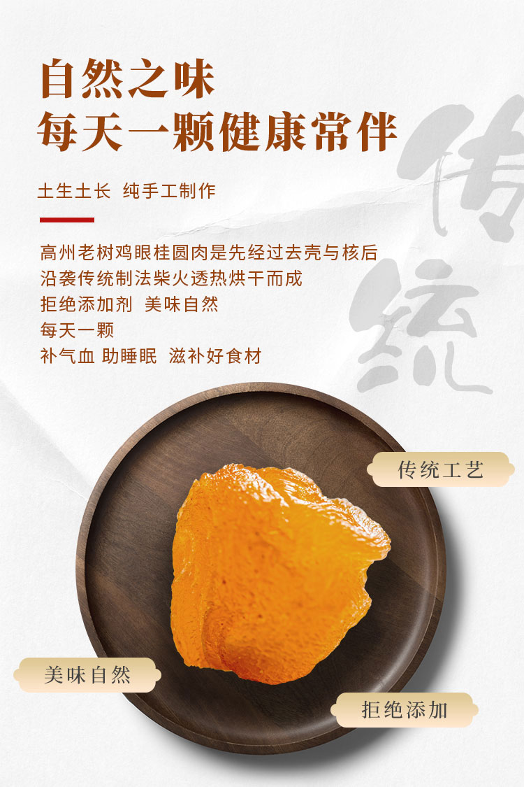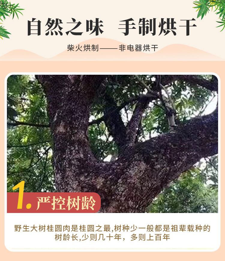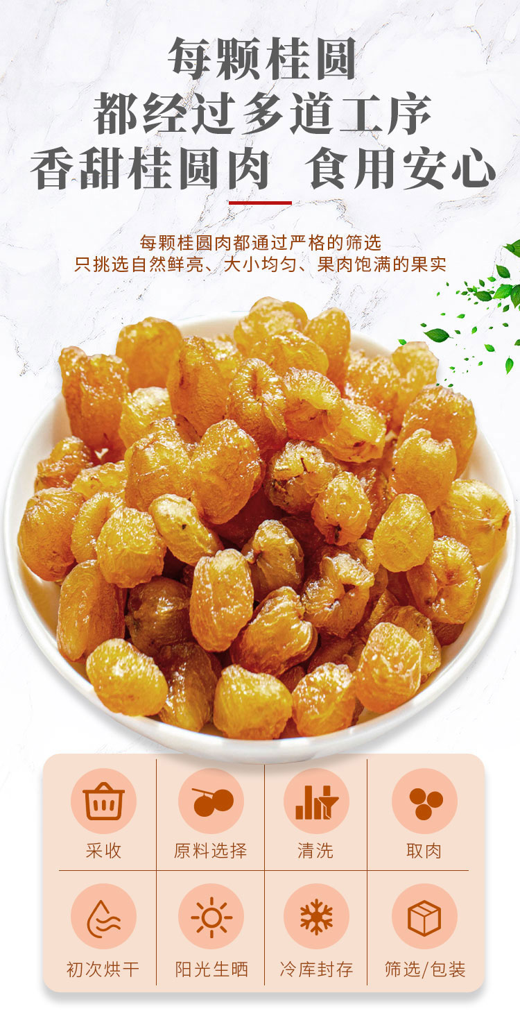 【产品优势】桂圆肉选料为山区自然生长野生60年以上树龄桂圆,果质正,无污染,且为纯手工制作不加糖不熏硫磺不熏煤球,干爽干净原汁原味,为馈赠好品!