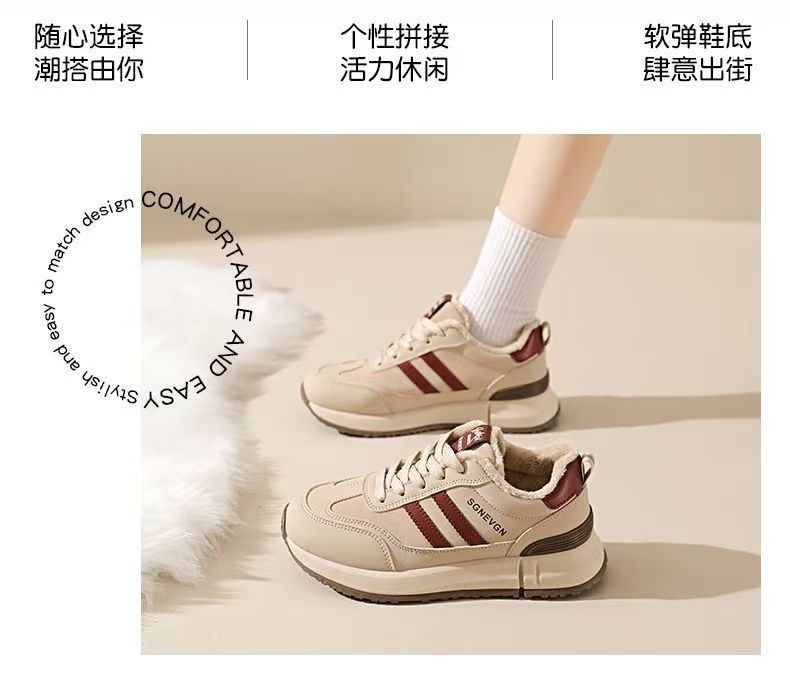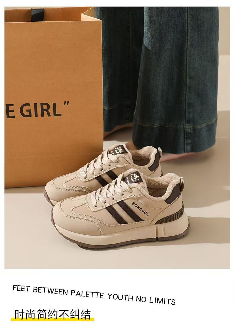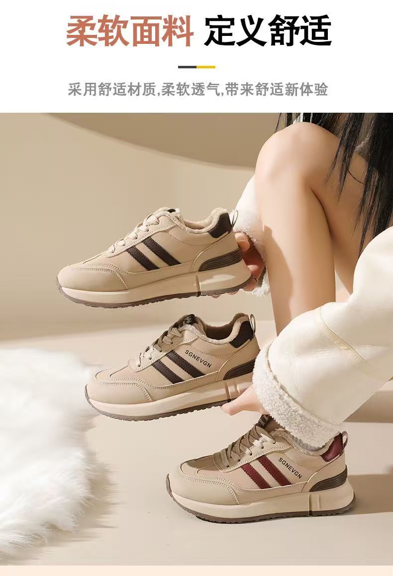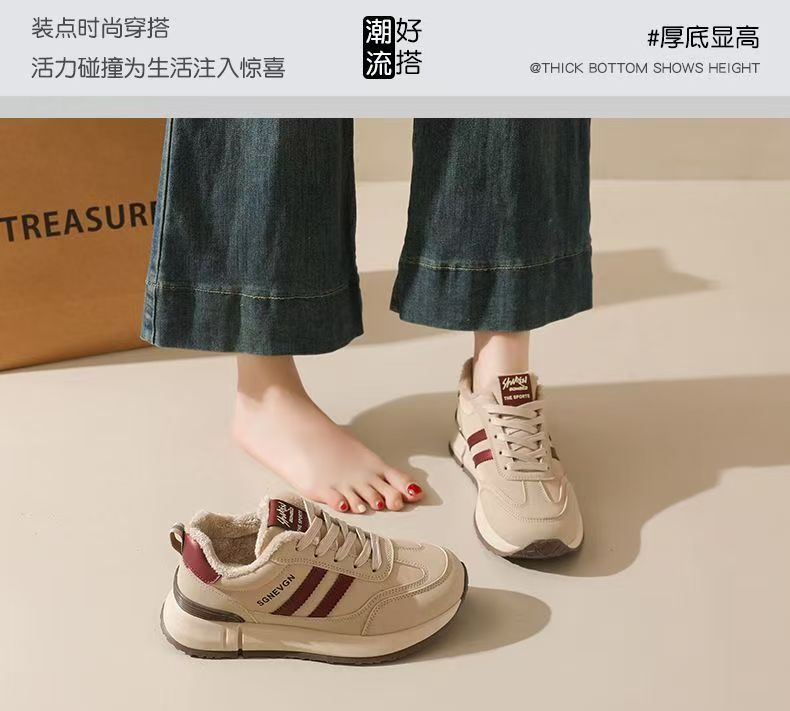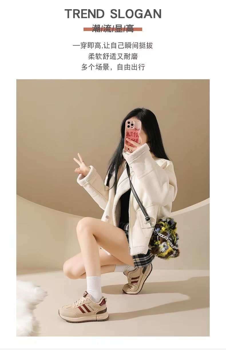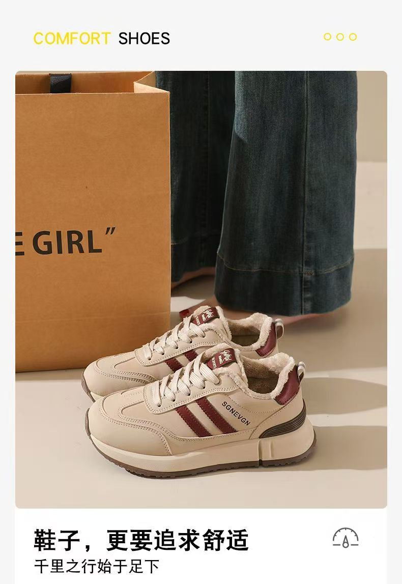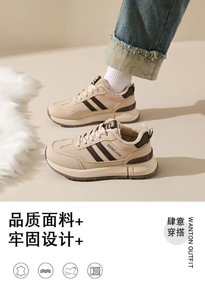 女士加绒厚底皮面运动鞋新款鞋百搭时尚轻便防滑软底老爹鞋35-40★娃娃优选