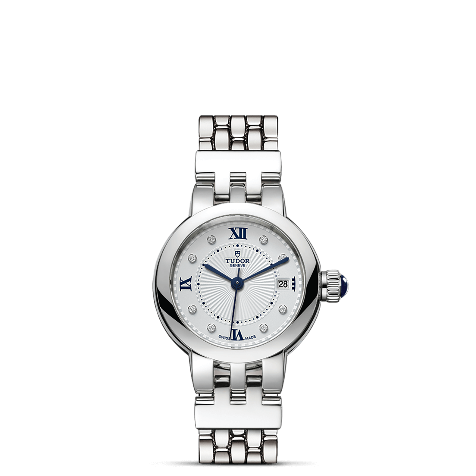 不锈钢旋入式上链表冠,饰以透明圆拱形蓝色尖晶石
