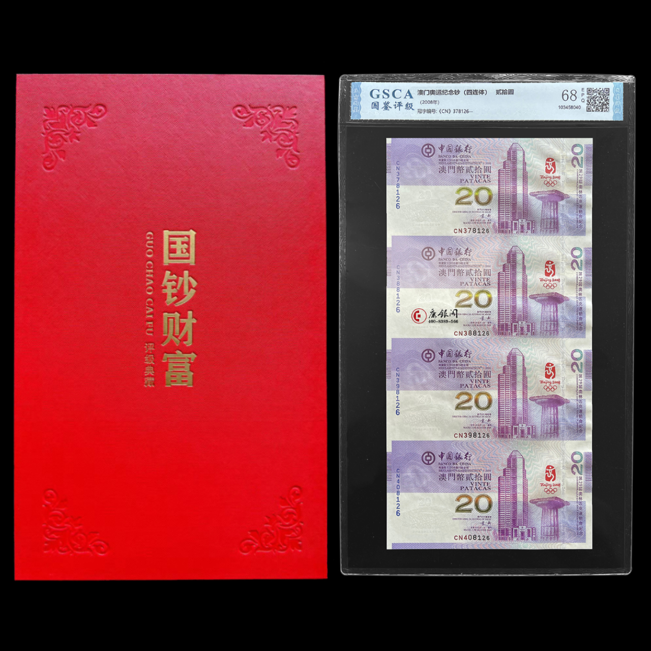 2008澳门奥运钞四连体由4张未剪裁的澳门奥运纪念钞组成,发行量仅3万套,极其稀少!