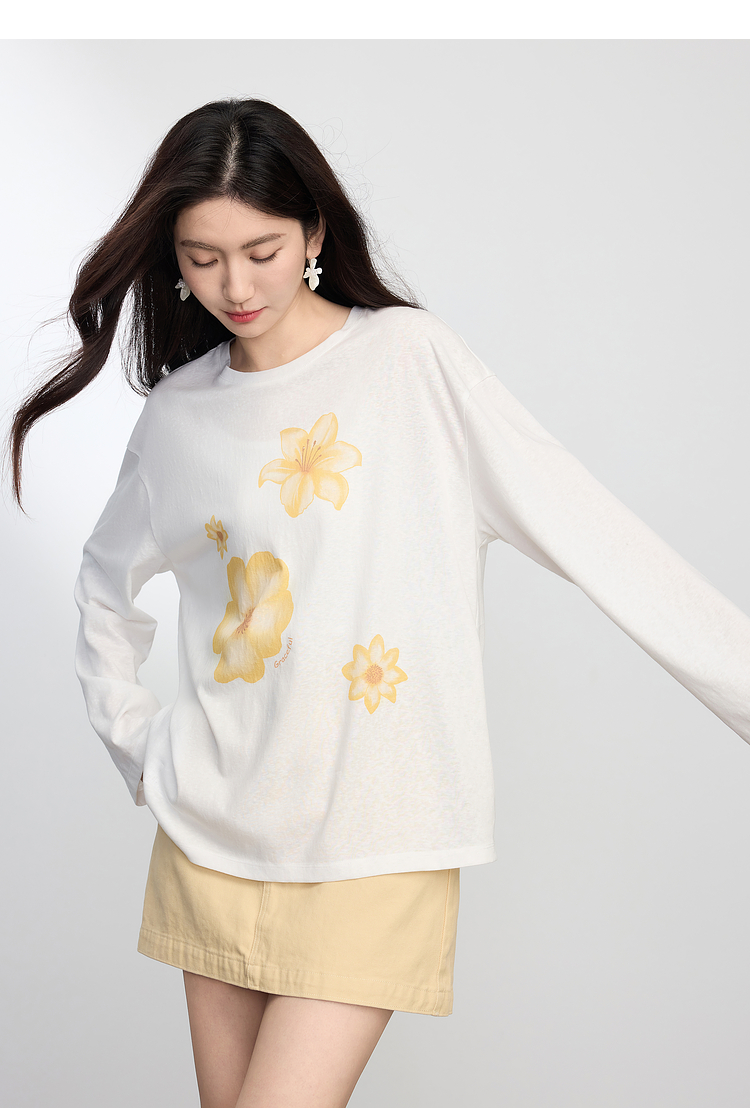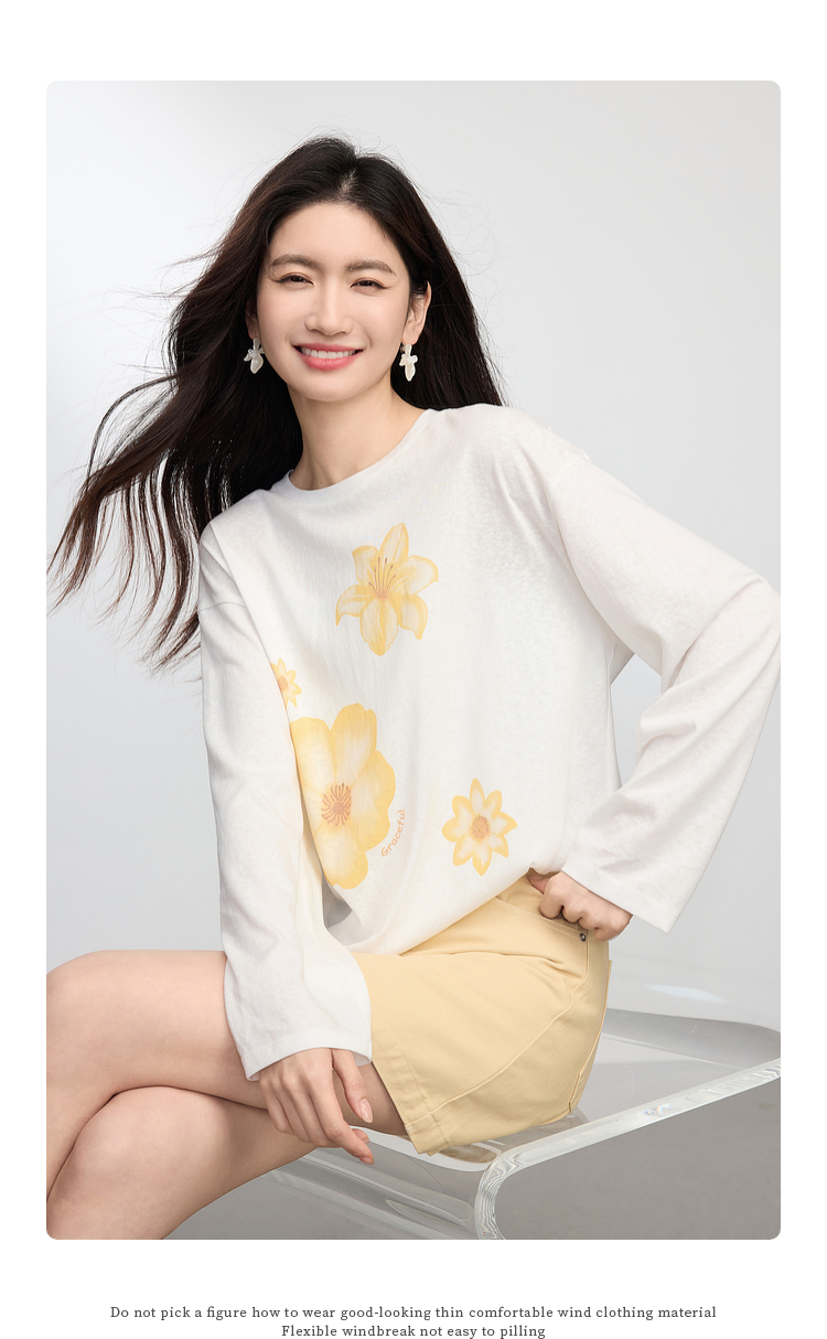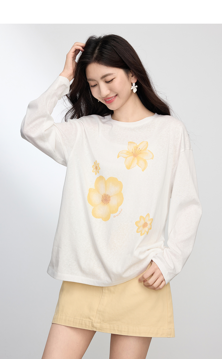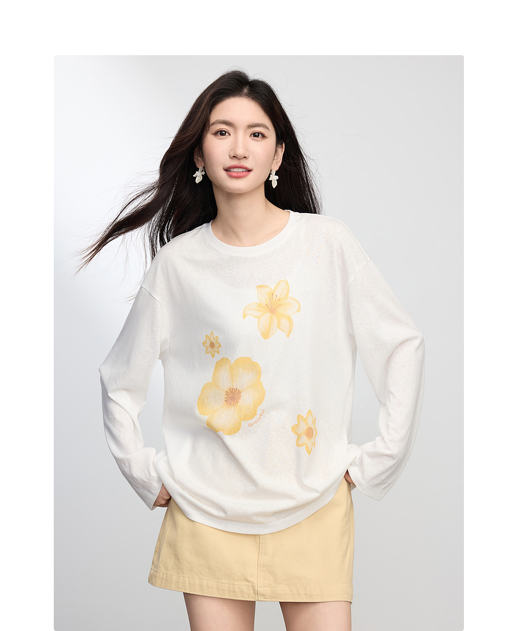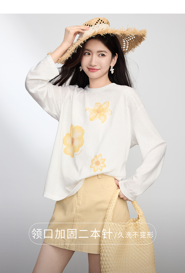 【周末秒杀】熙世界松弛慵懒感印花T恤女长袖2025早秋新款设计感圆领宽松上衣