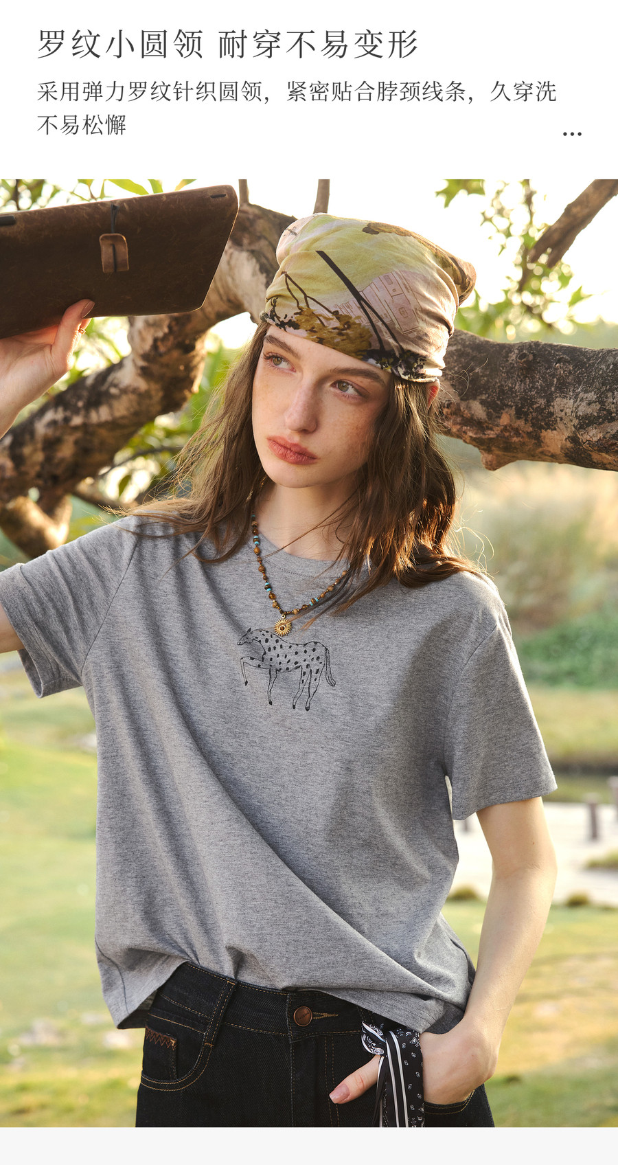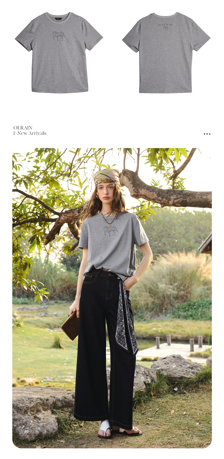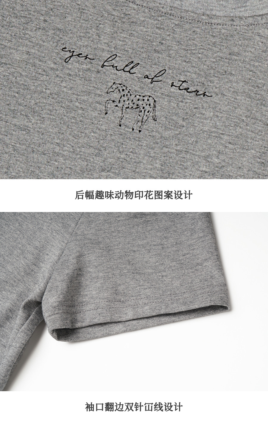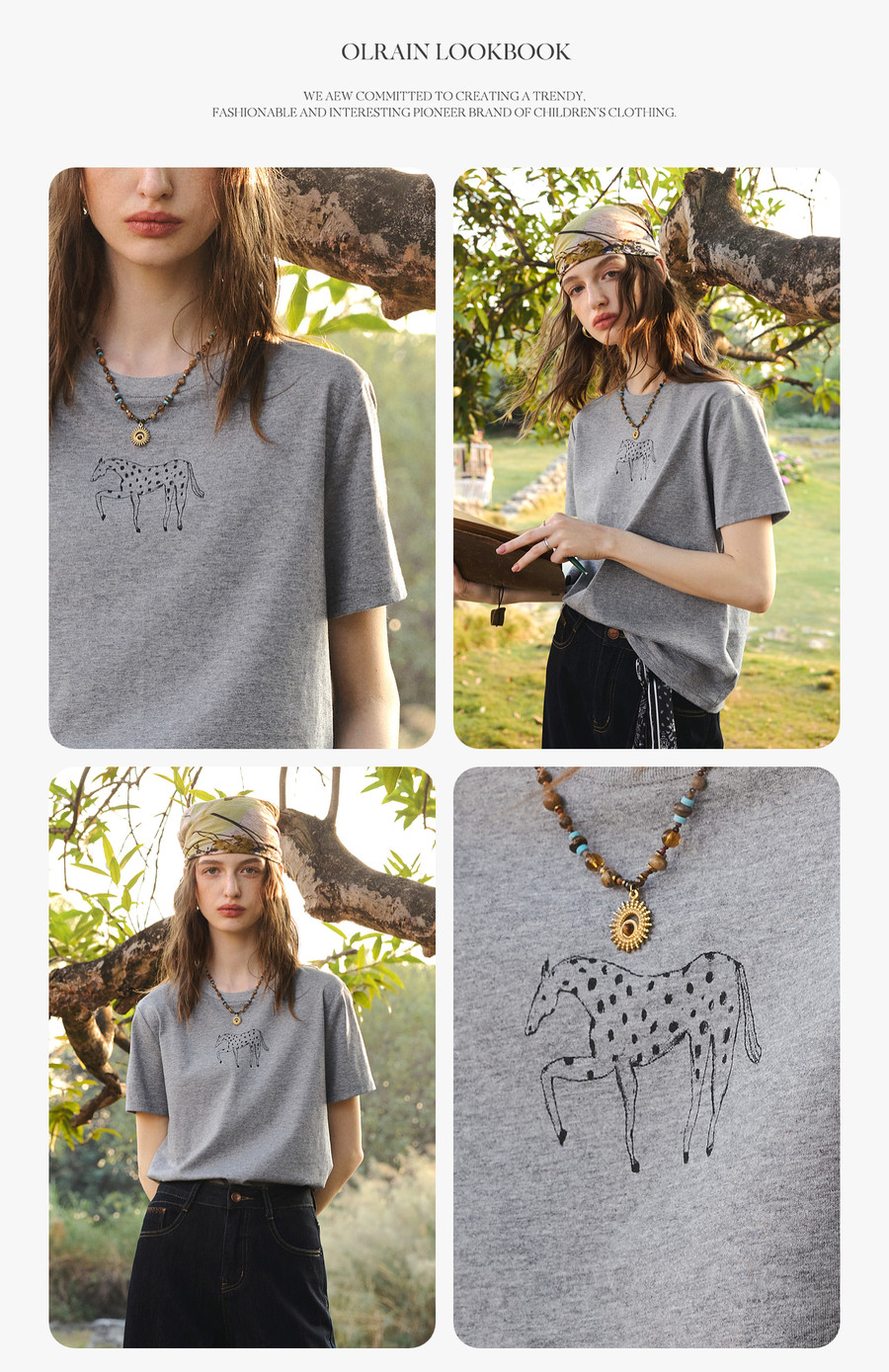 欧芮儿2026年新款夏季纯棉灰色休闲宽松上衣印花设计圆领短袖T恤
