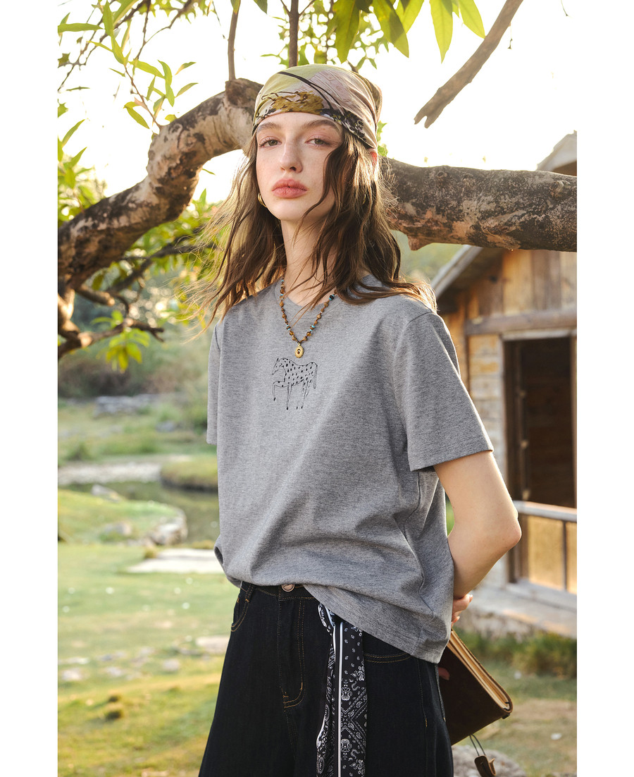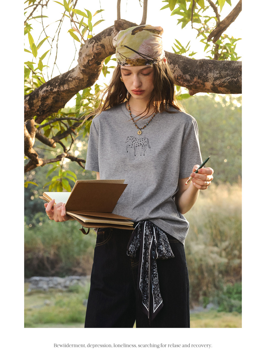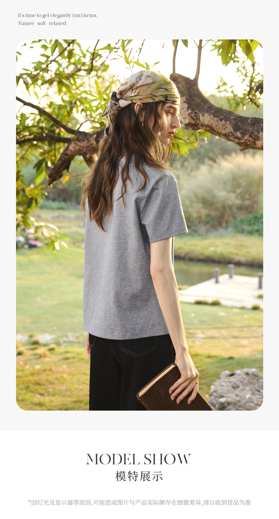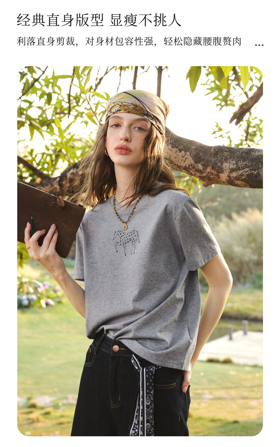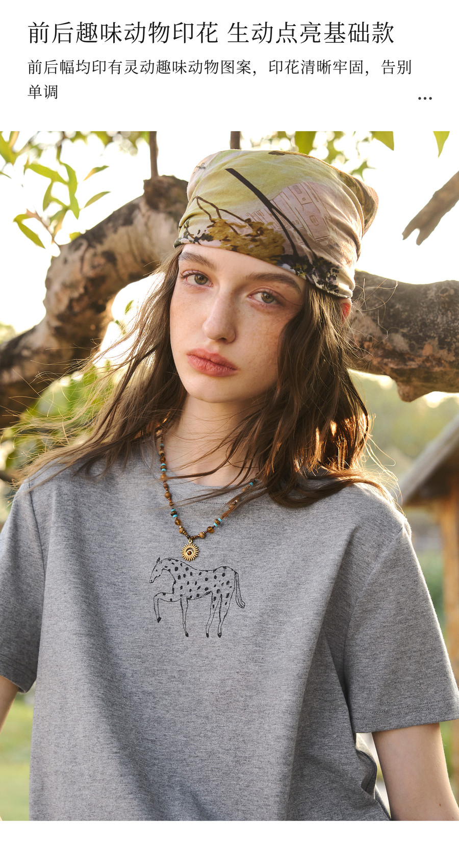 欧芮儿2026年新款夏季纯棉灰色休闲宽松上衣印花设计圆领短袖T恤