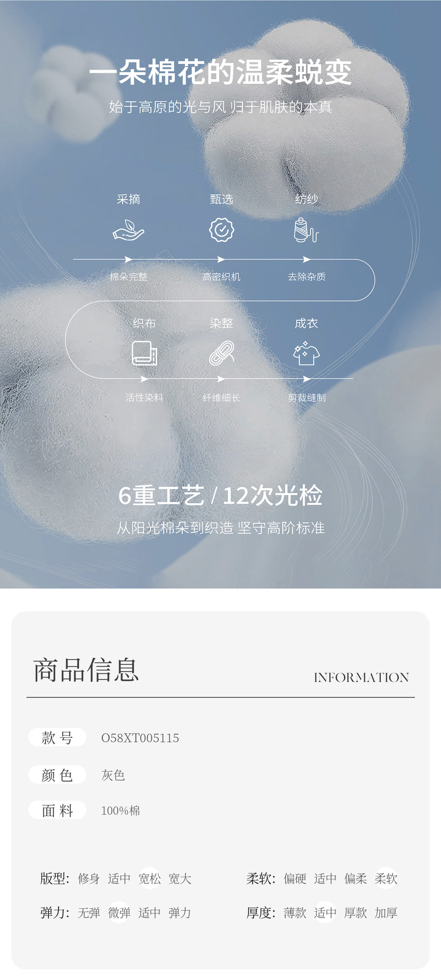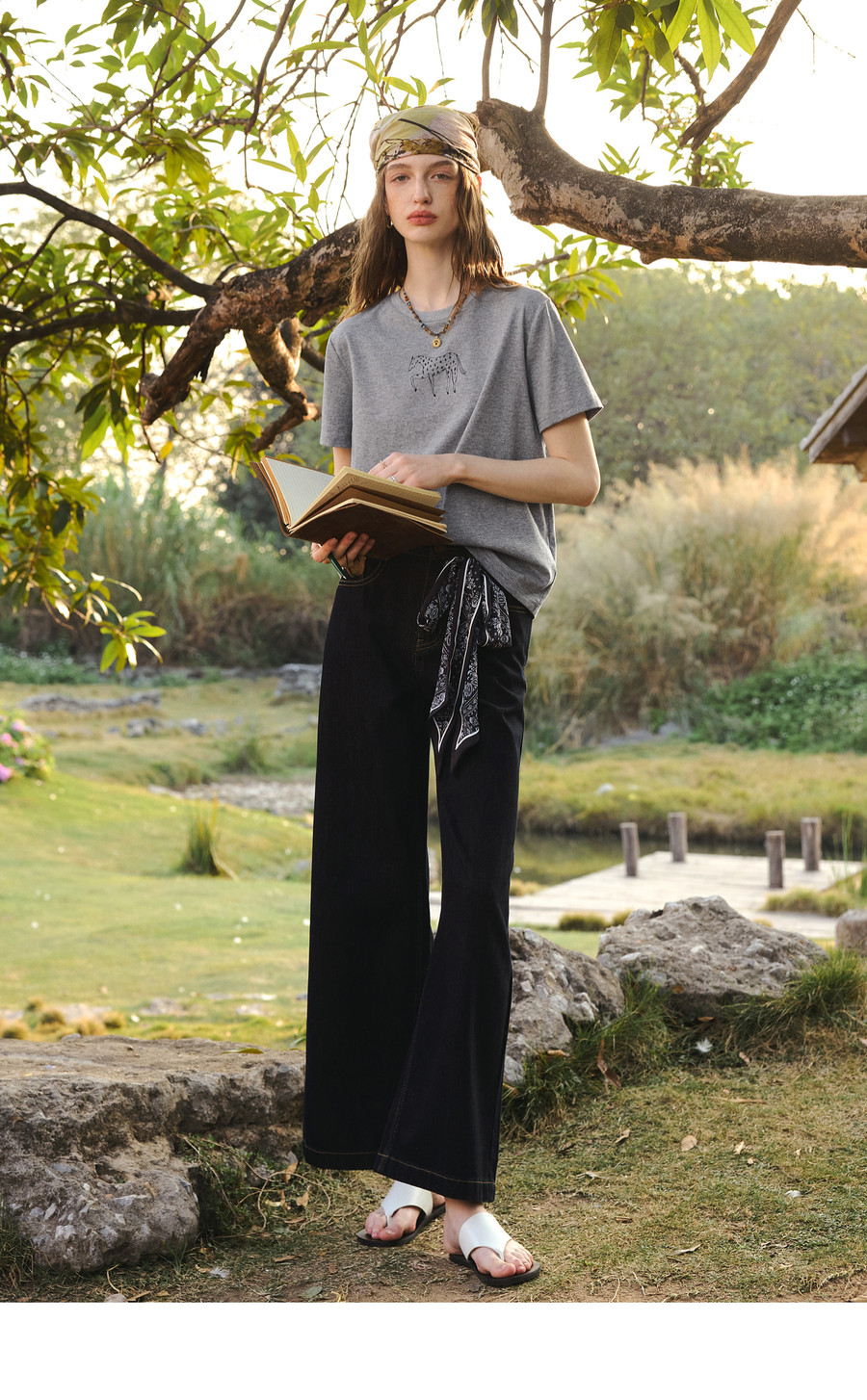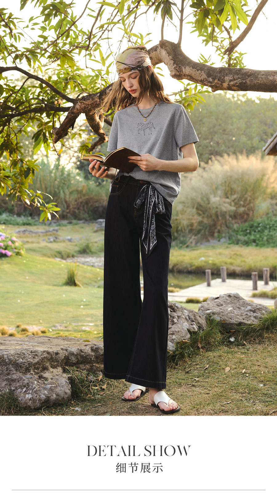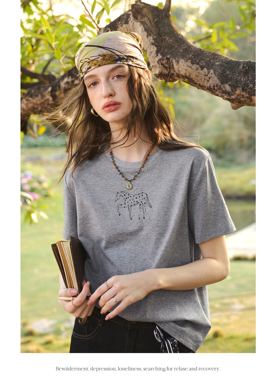 欧芮儿2026年新款夏季纯棉灰色休闲宽松上衣印花设计圆领短袖T恤