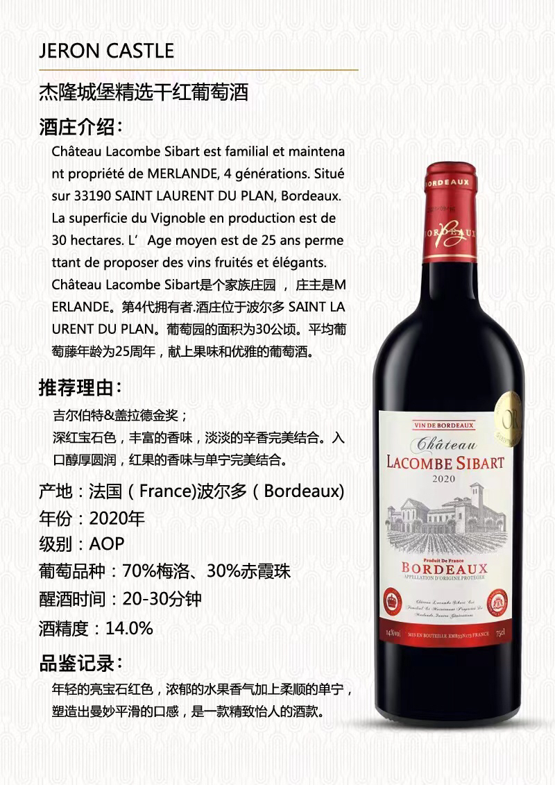 【会员秒杀】法国波尔多-杰隆城堡干红- 法国原瓶进口-瓶底有果肉沉淀介意勿拍!
