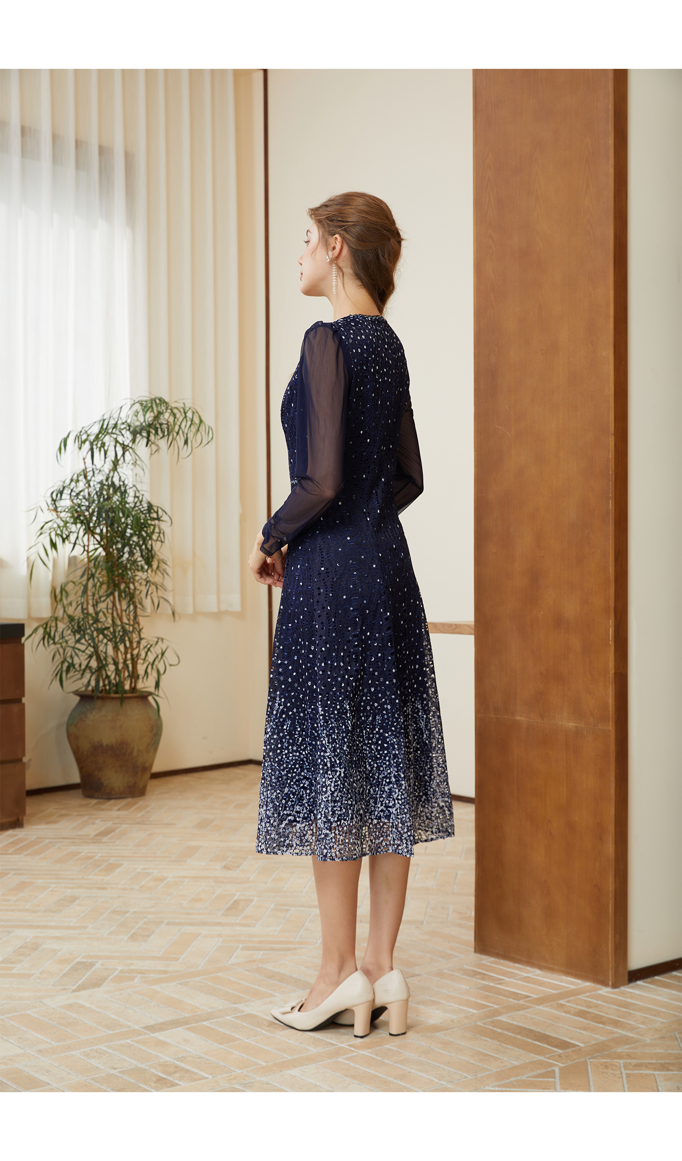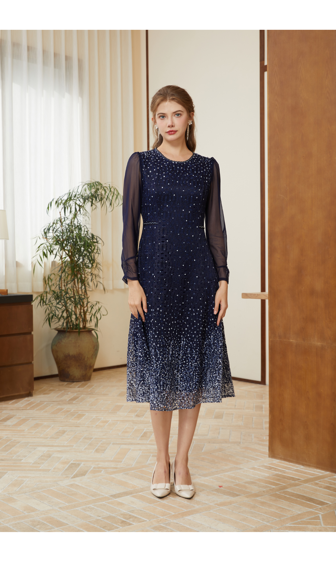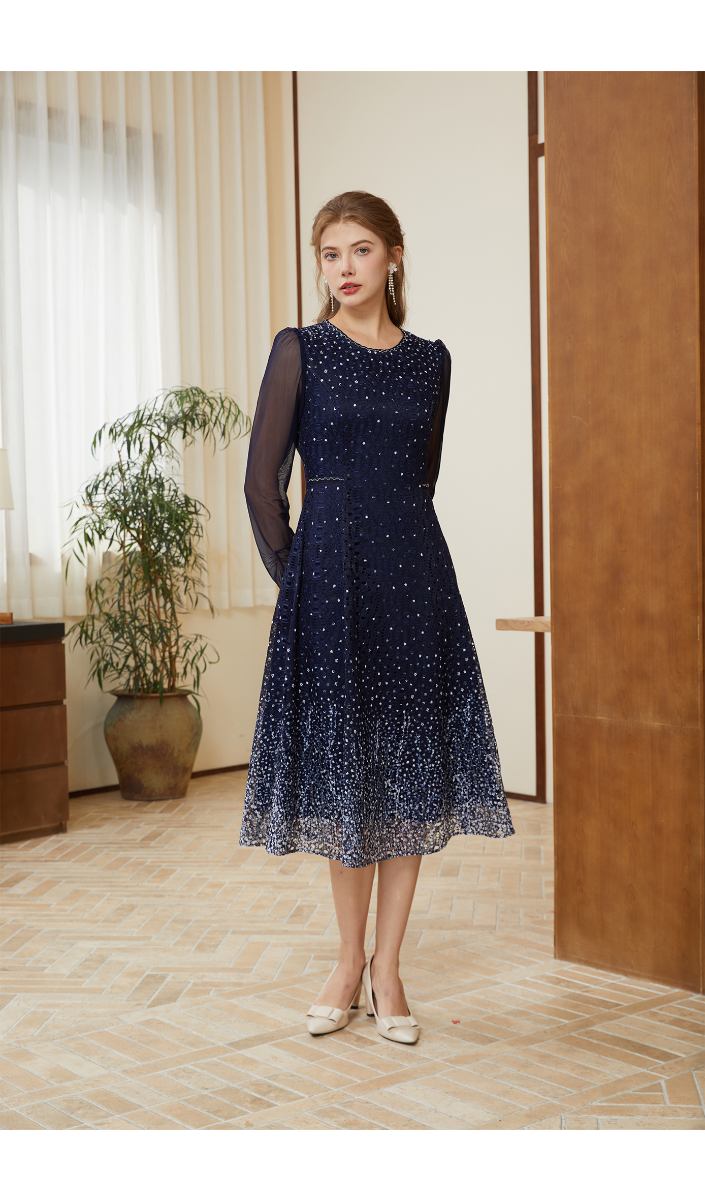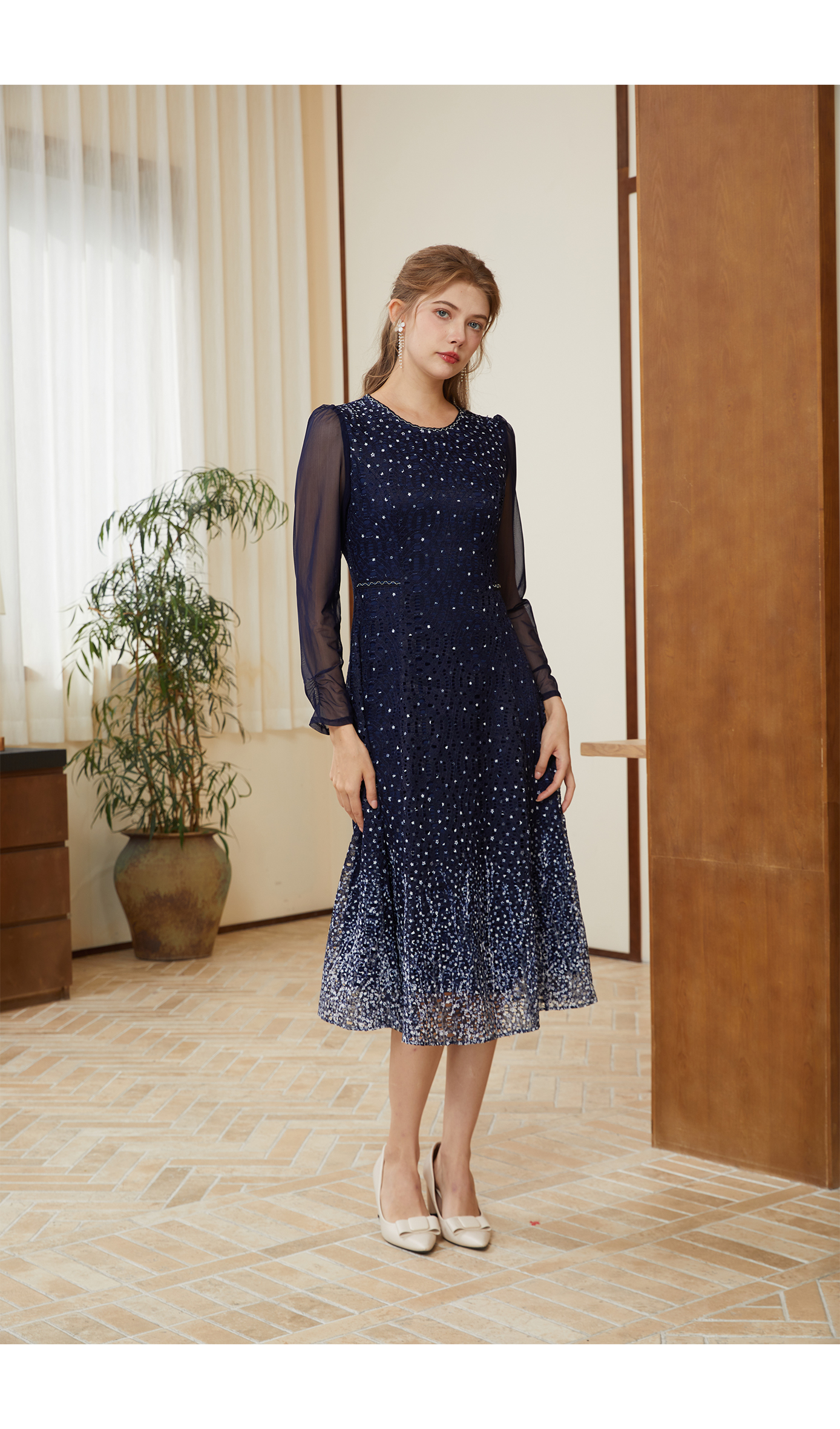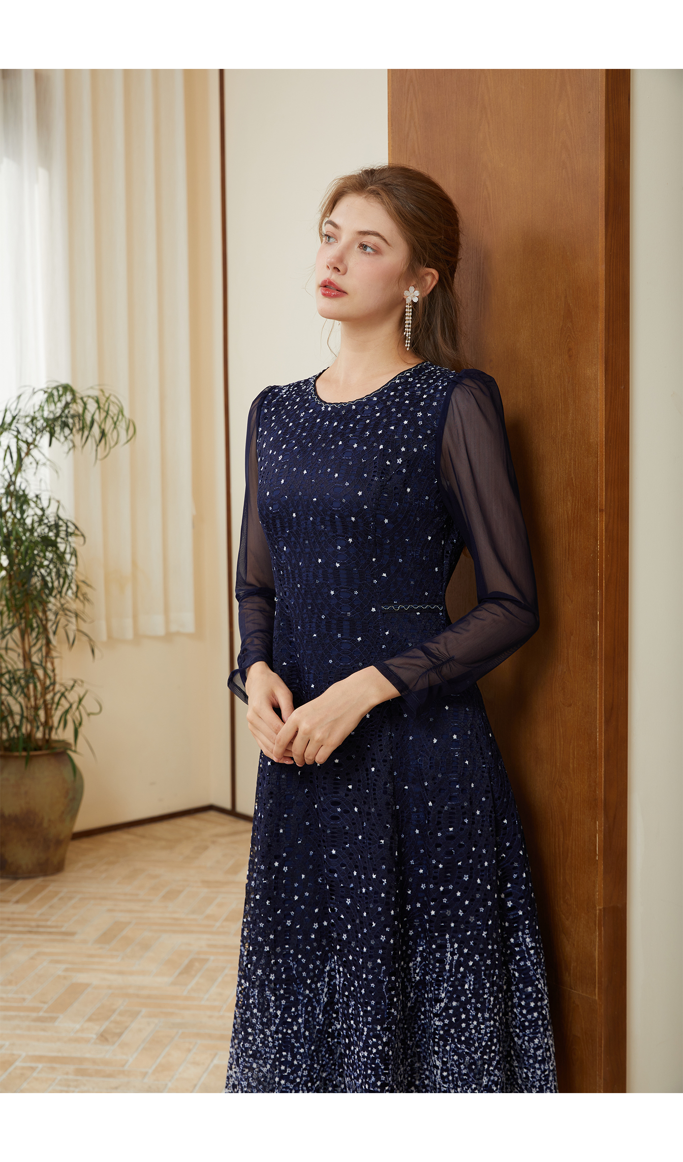司歌刺绣连衣裙圆领网纱长袖弹力修身A881268