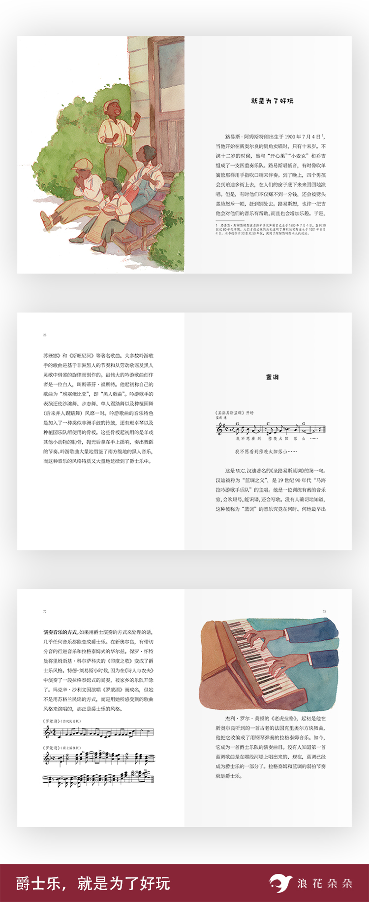 国内优秀青年画家YiLi精心创作插图,多样构图绘出不同爵士乐元素、著名爵士音乐家和人们游戏、表演、舞蹈、比赛的场景,多彩画面丰富阅读体验、增添视觉享受。