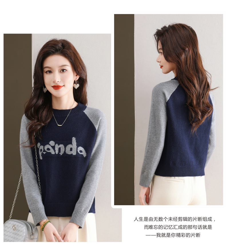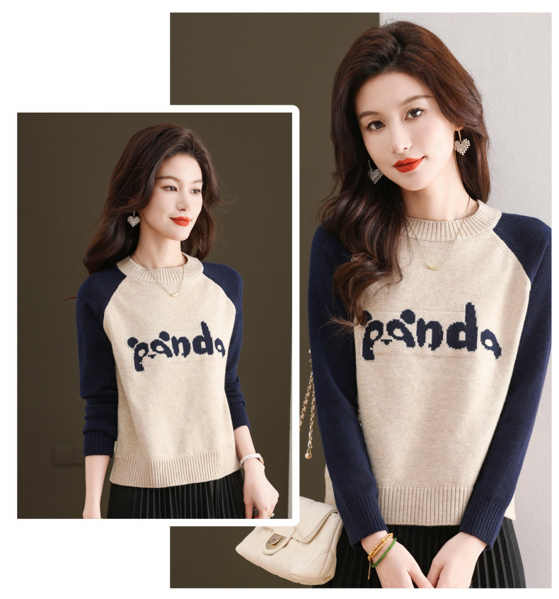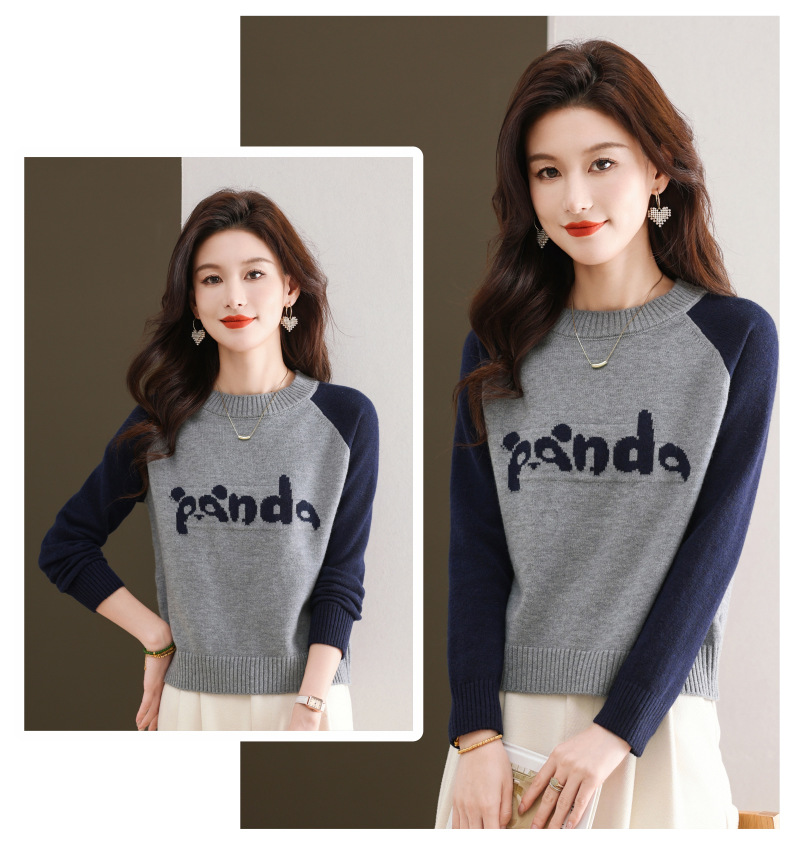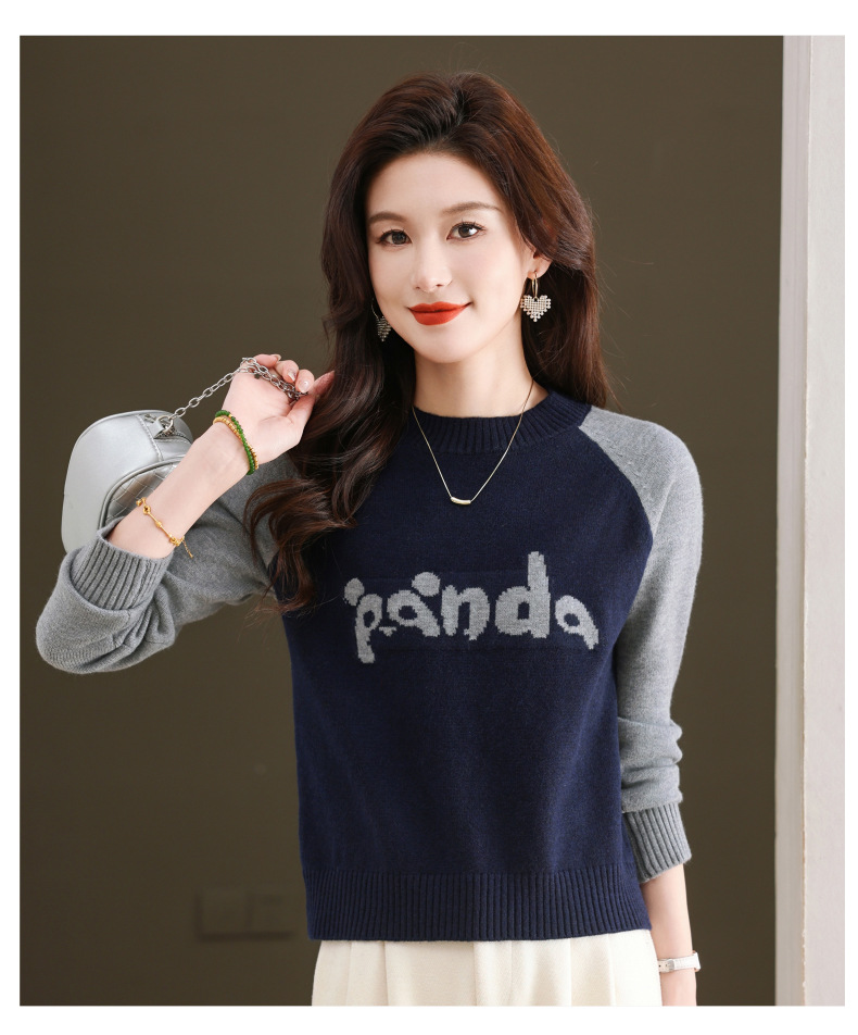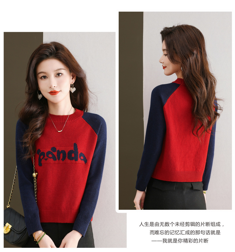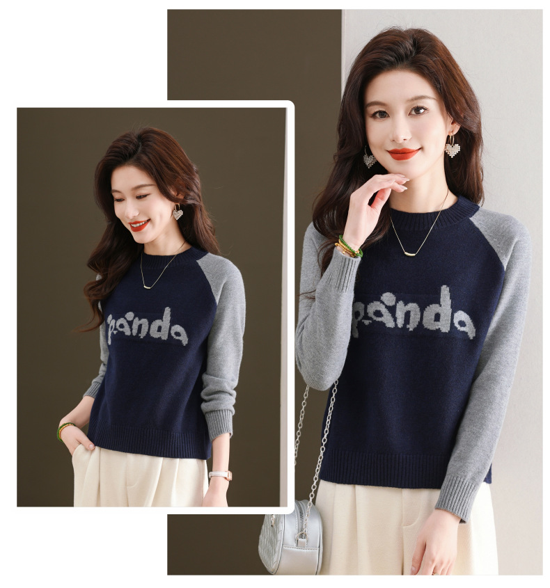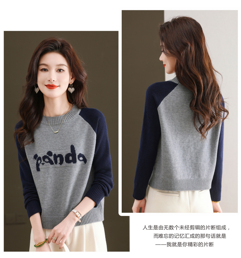 圆领拼色长袖针织打底衫,宽松显瘦气质内搭上衣CC-103-H6118