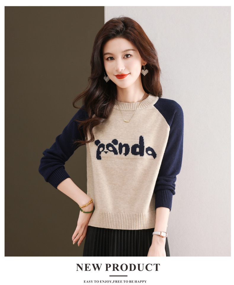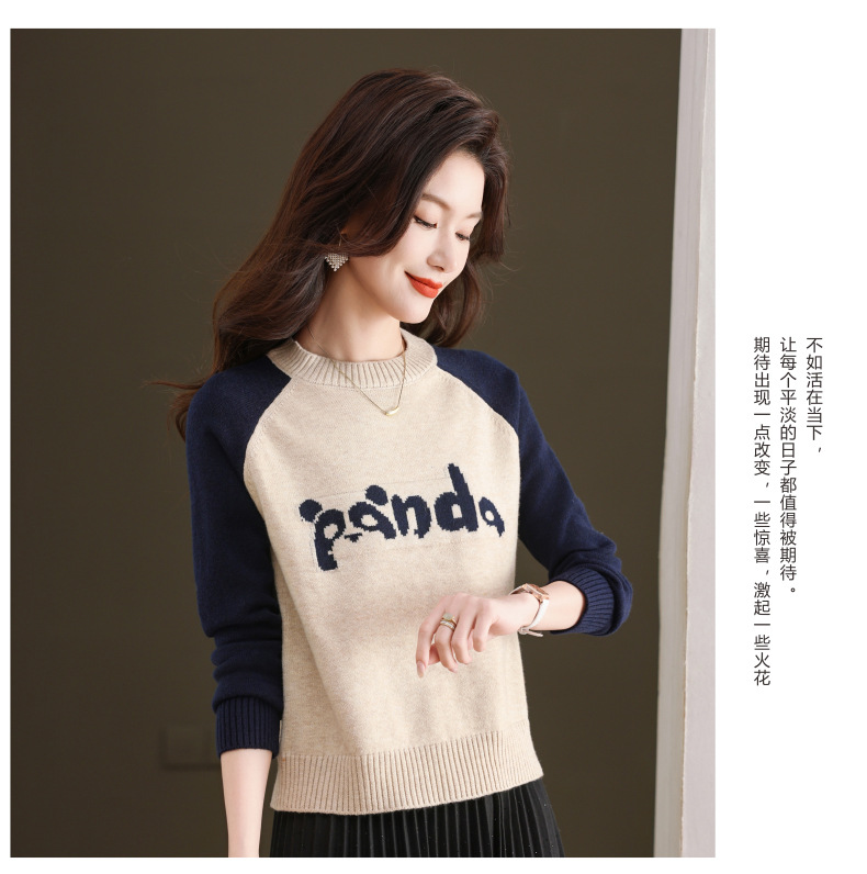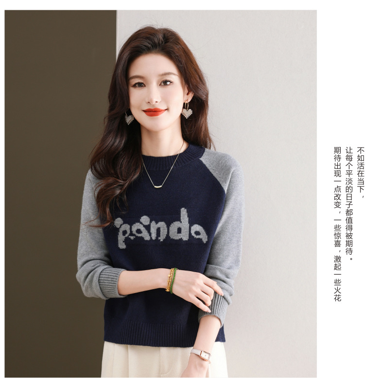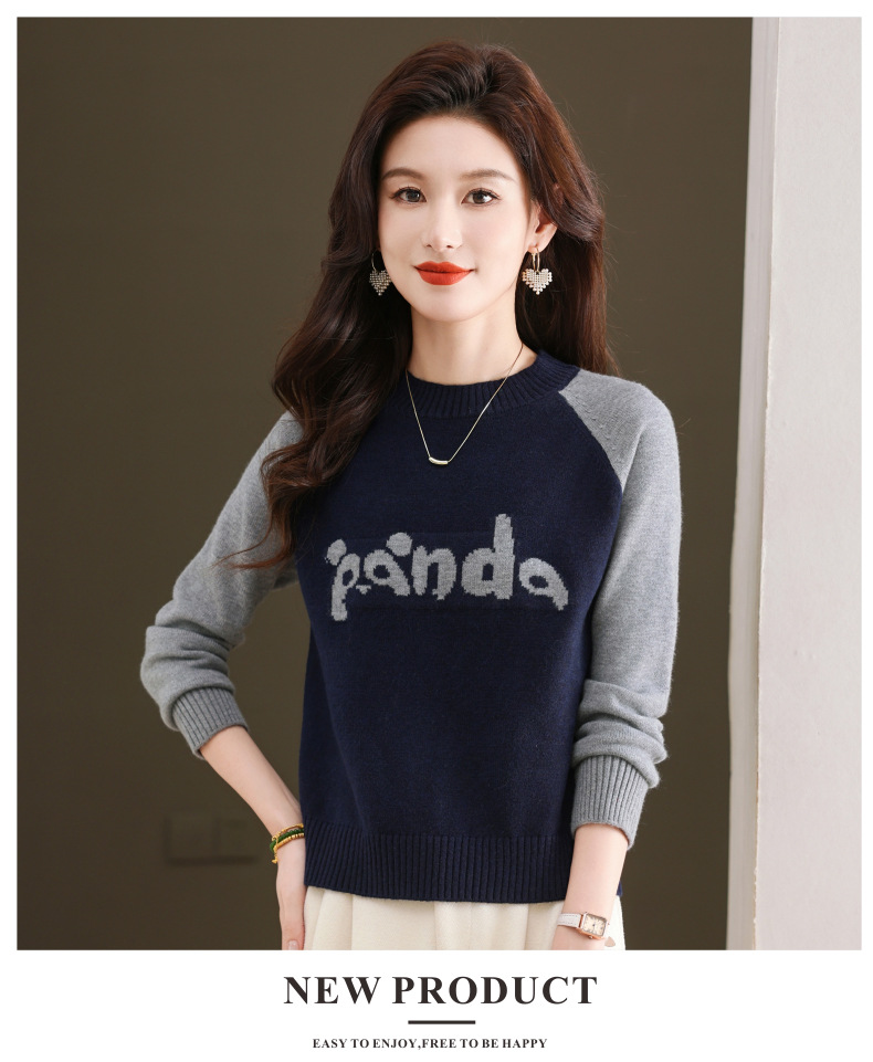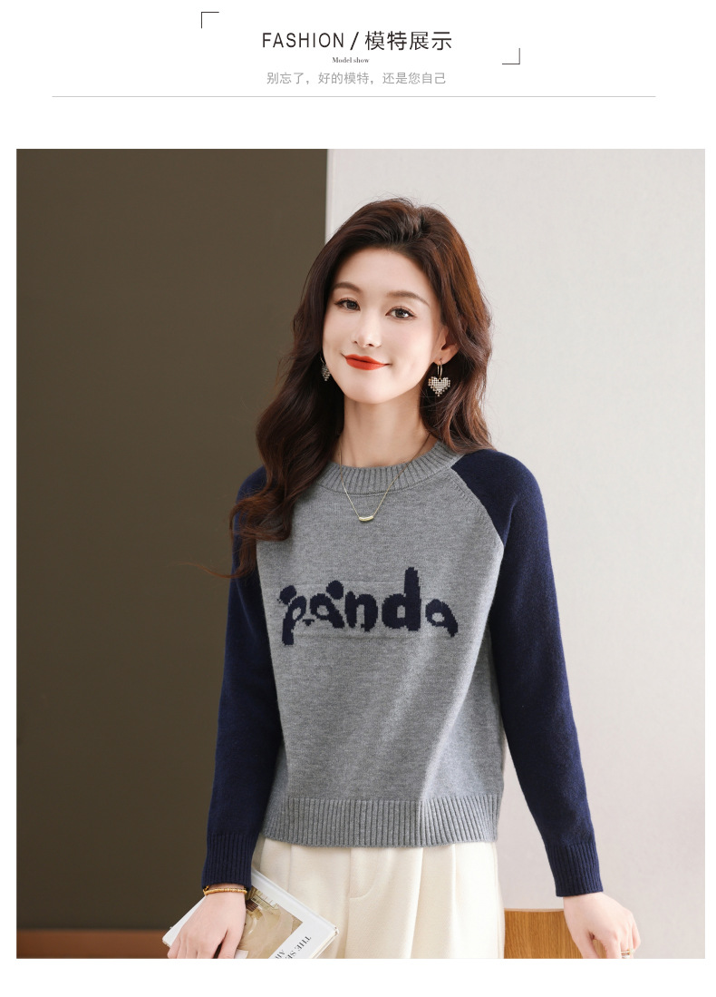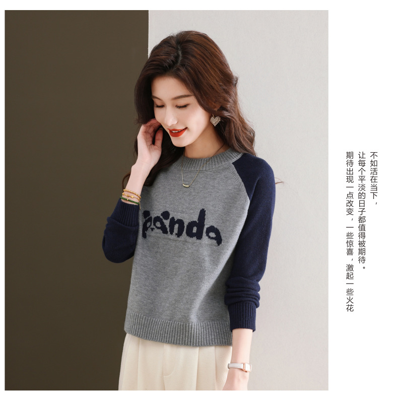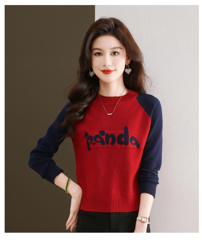 圆领拼色长袖针织打底衫,宽松显瘦气质内搭上衣CC-103-H6118