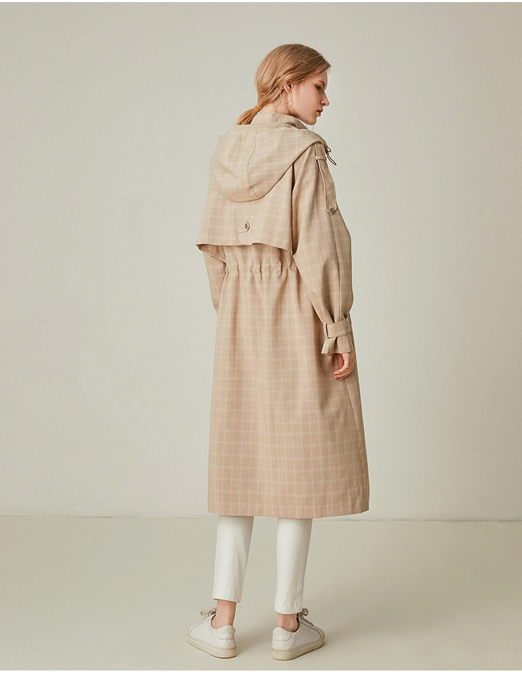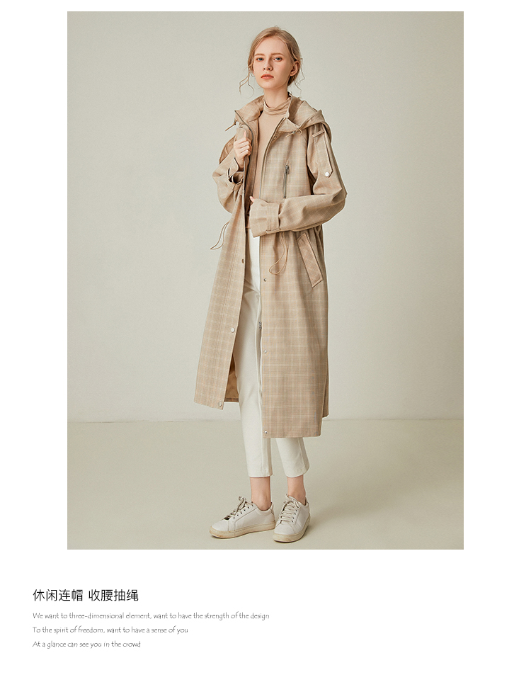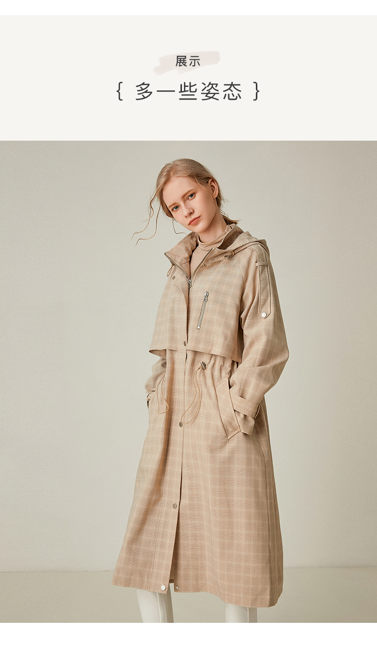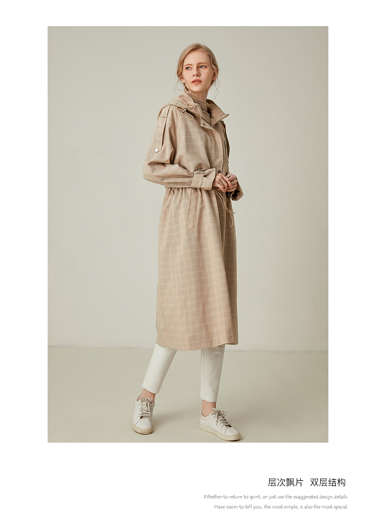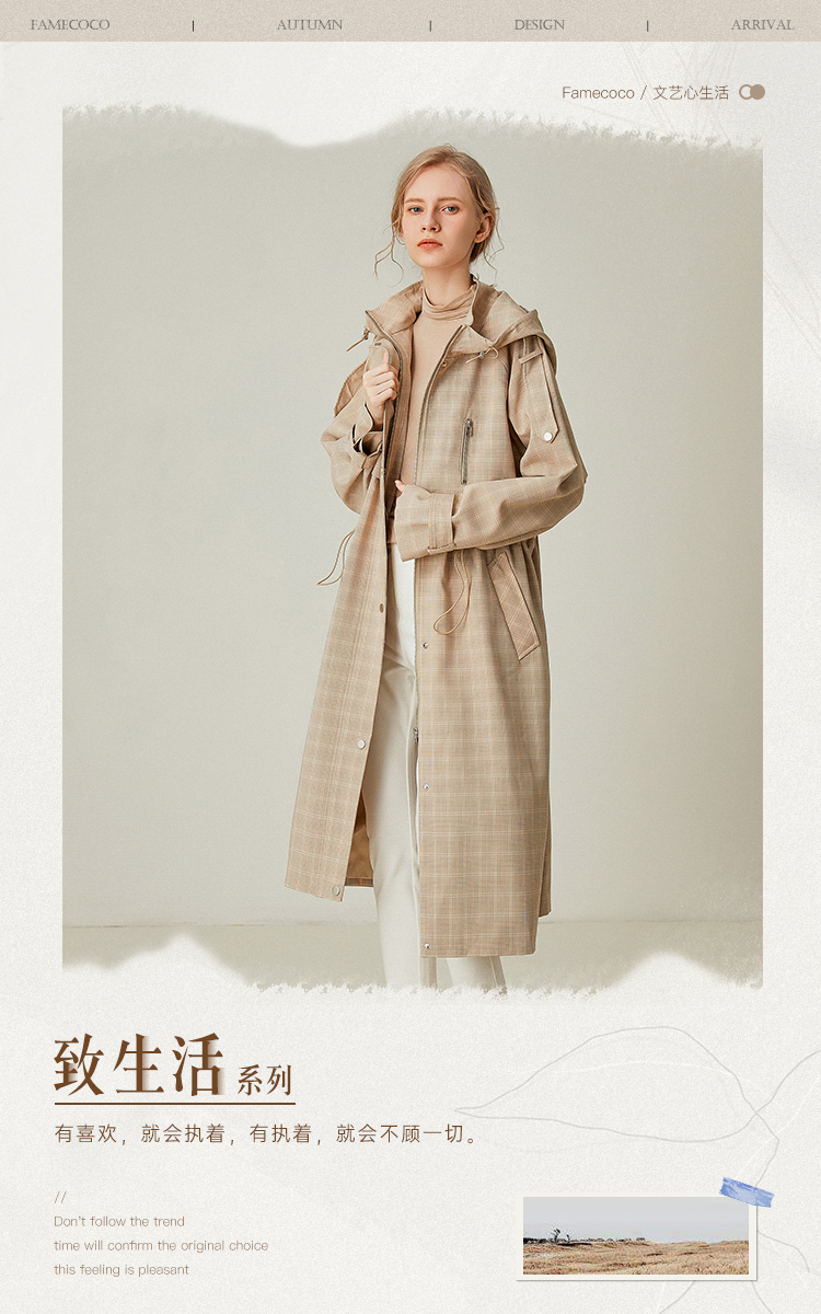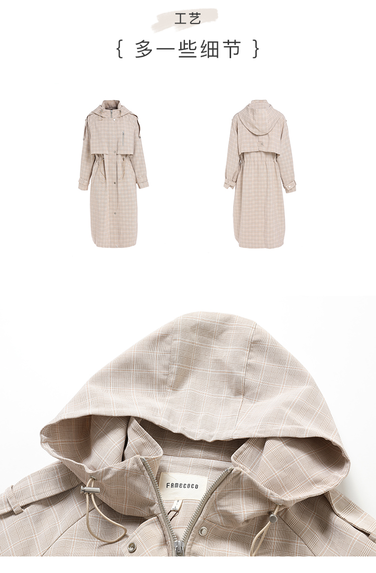 Famecoco范可儿风衣女格子连帽收腰假两件中长款F195AA006