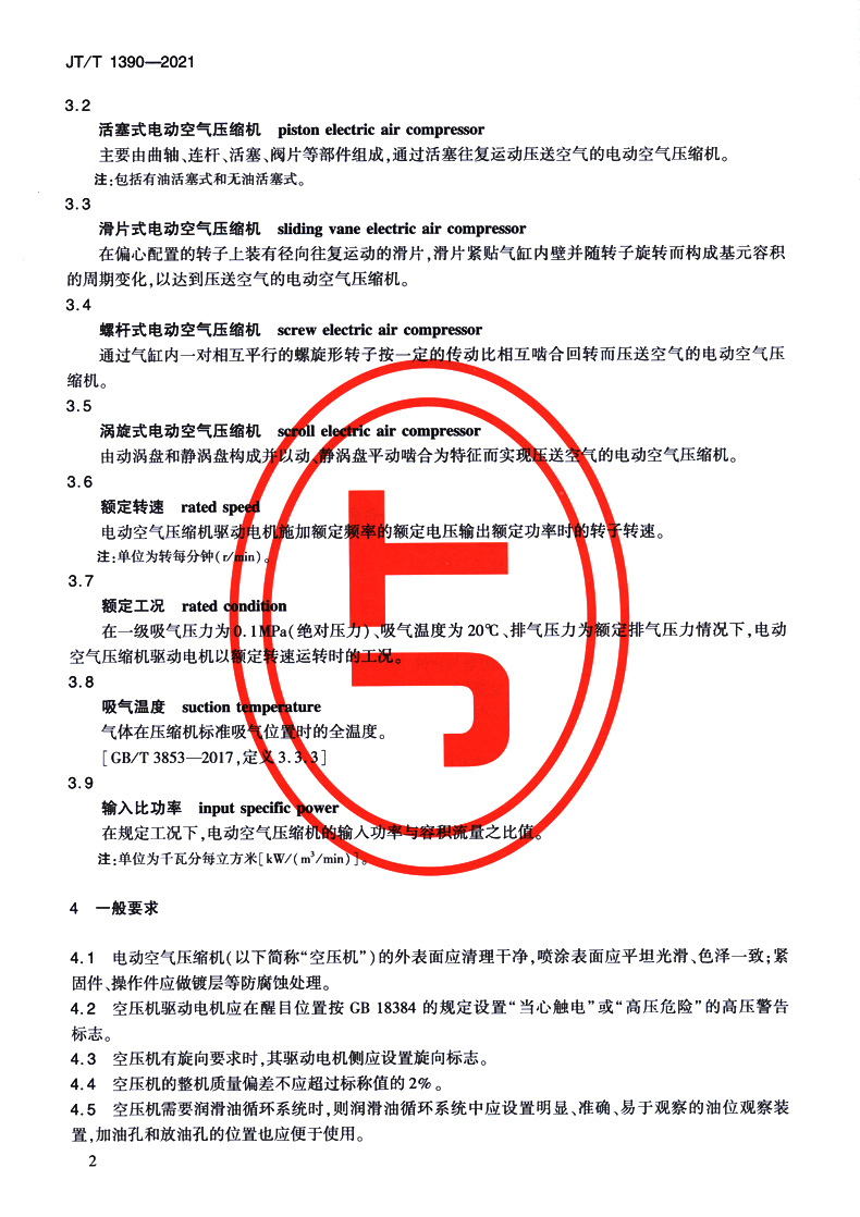 电动客车电动空气压缩机(JT/T 1390—2021)