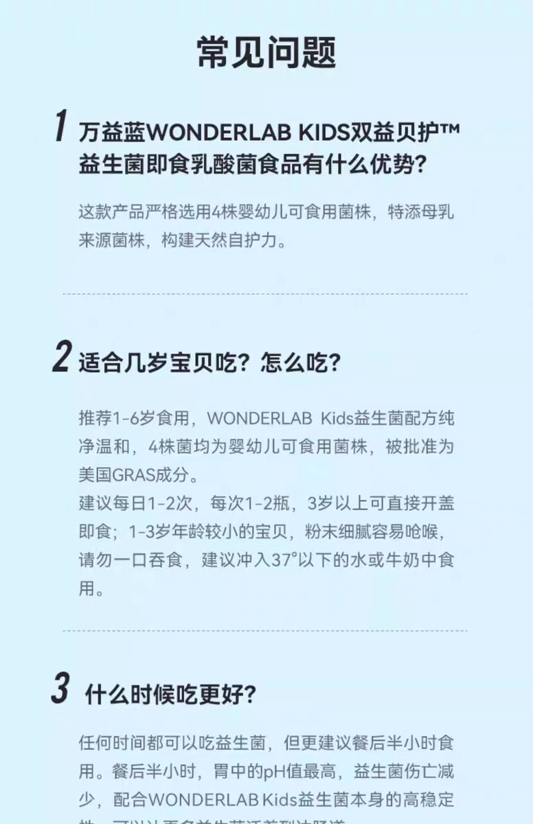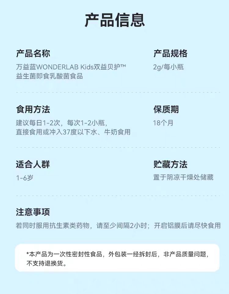 【产品名称】:万益蓝WONDERLAB Kids双益贝护™益生菌即食乳酸菌食品