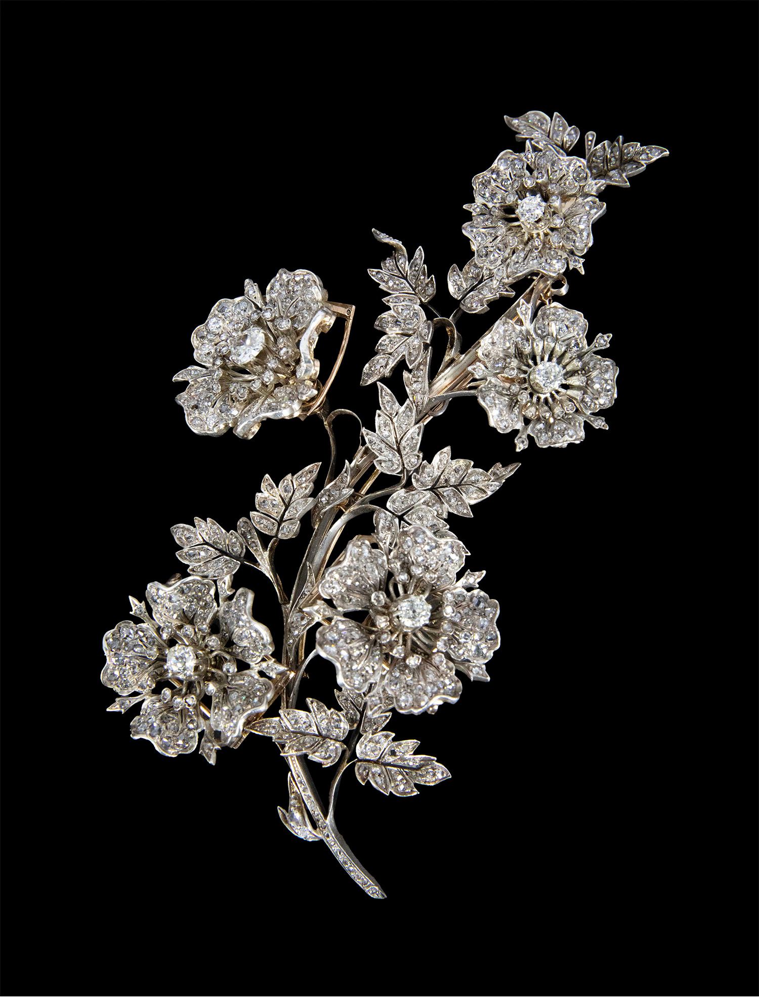 独角鹿西洋古董 1850年代法国出品花卉主题黄金底纯银镶嵌钻石En Tremblant颤动式可拆卸多功能胸针