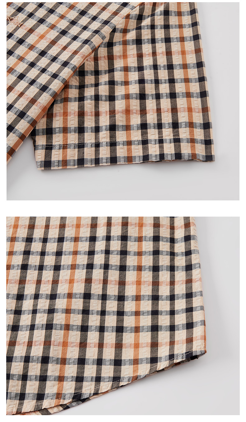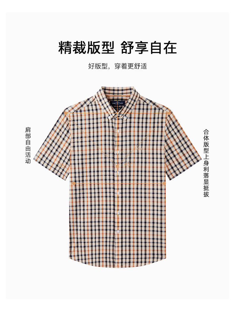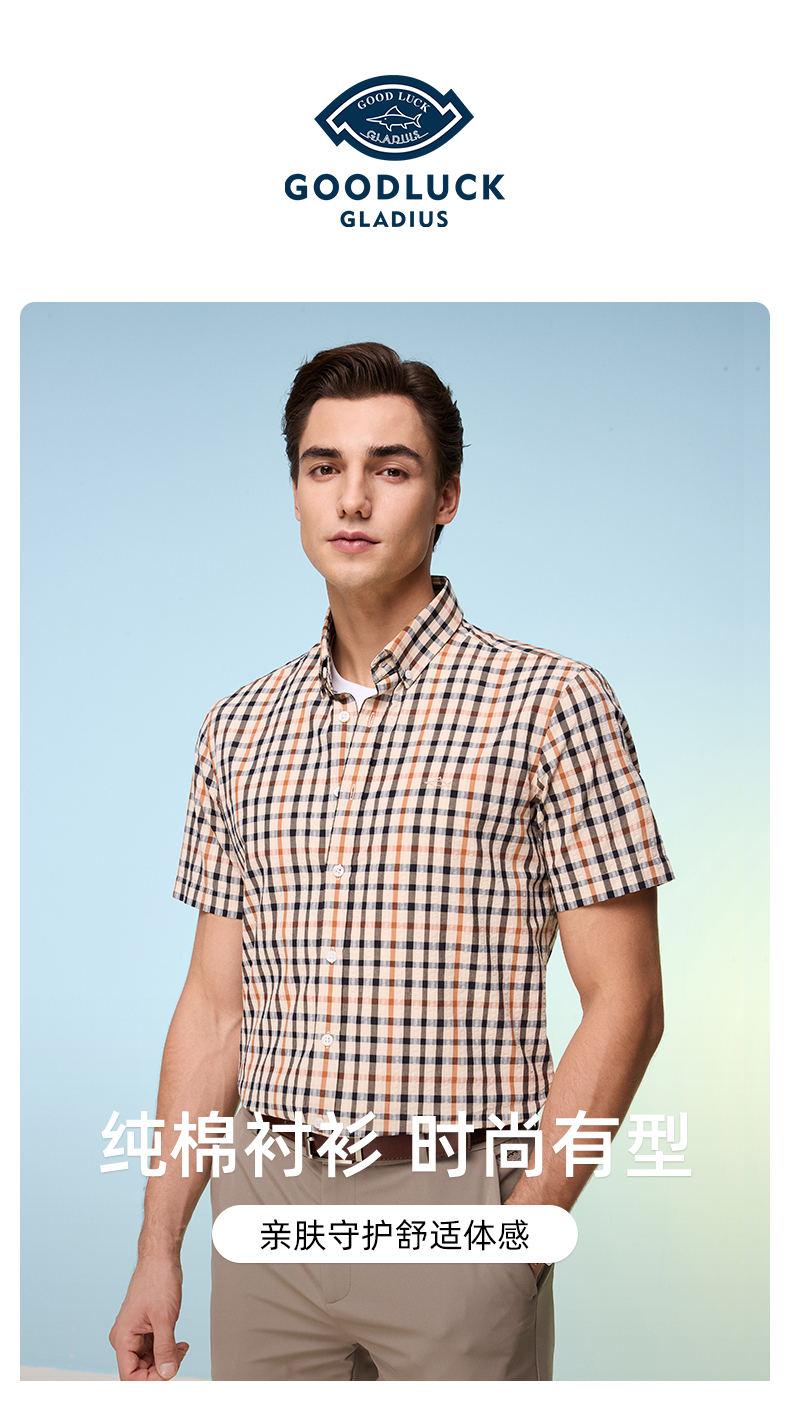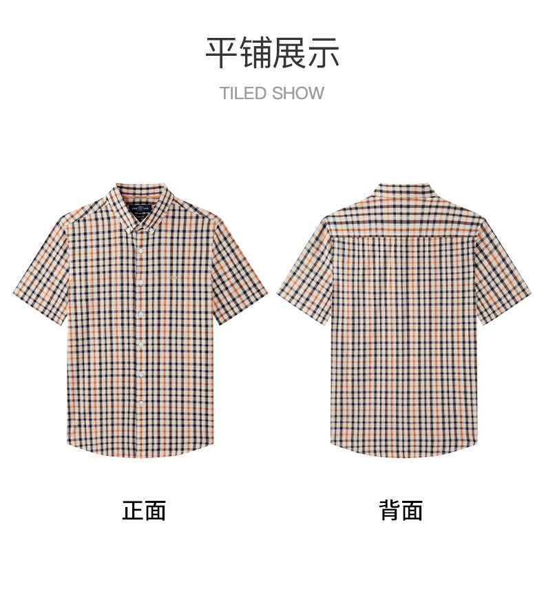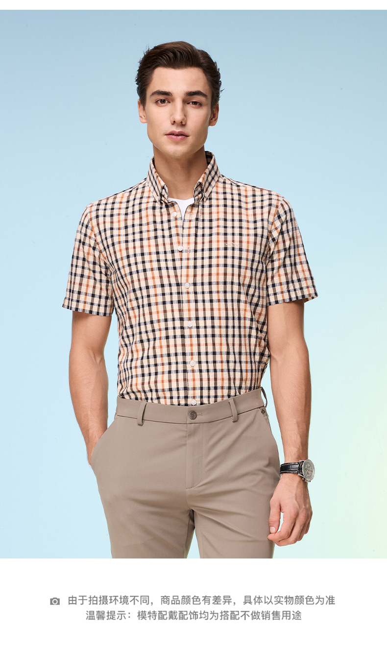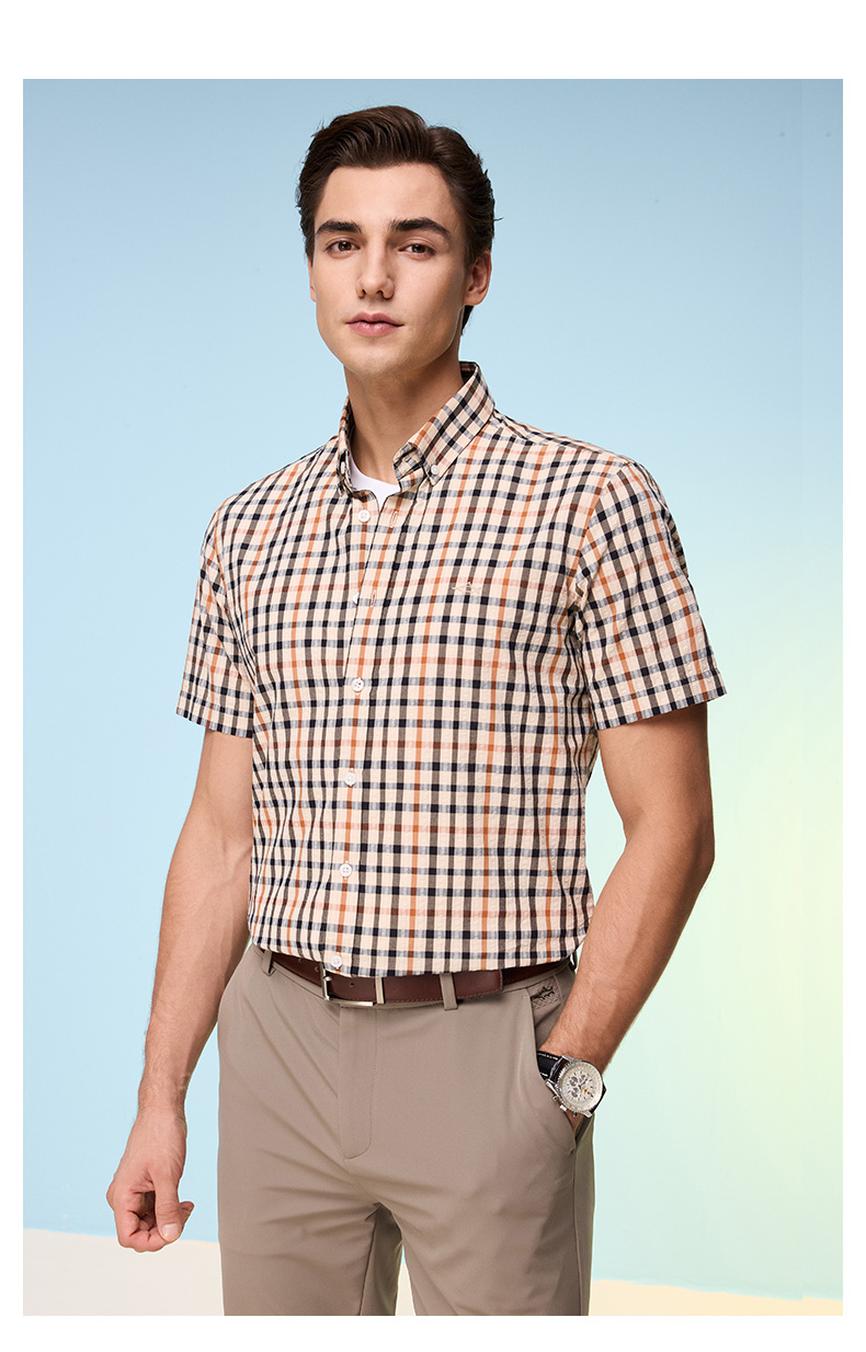 【纯棉舒适】德鲨卡其色短袖衬衫男2026夏款休闲格子上衣打底衬衣