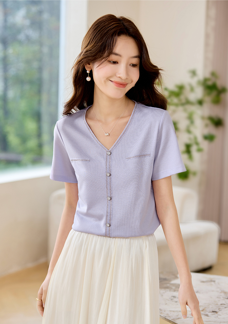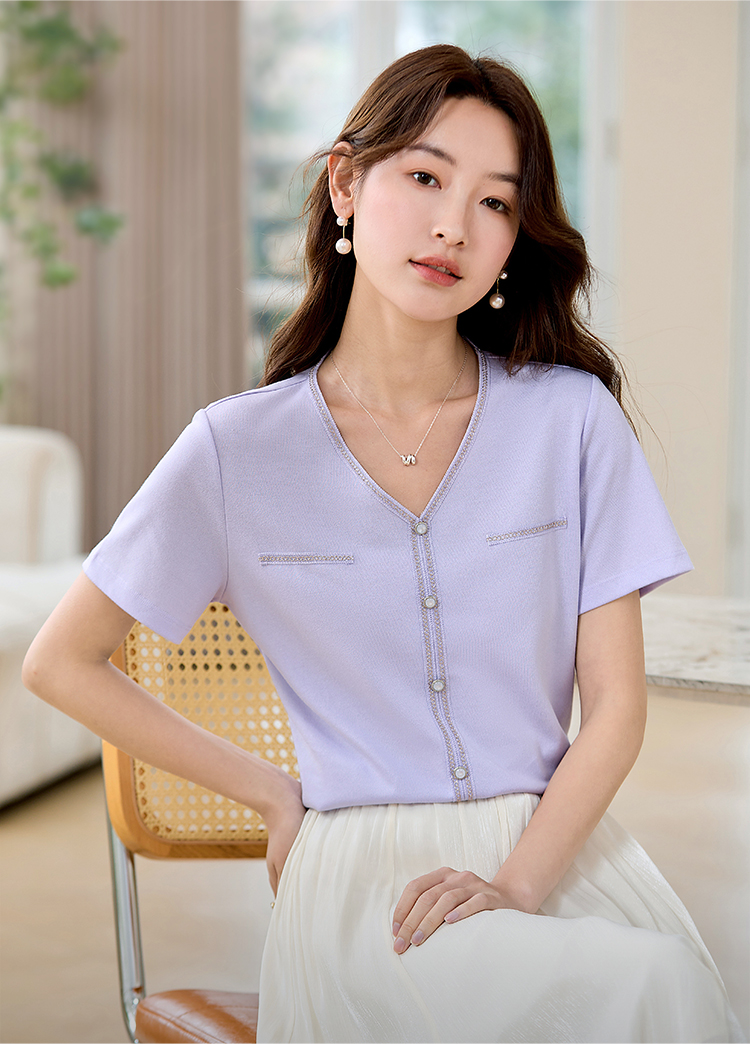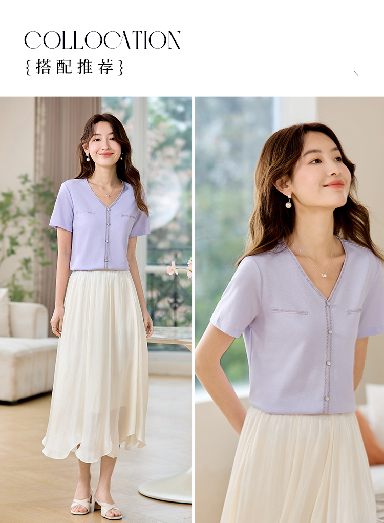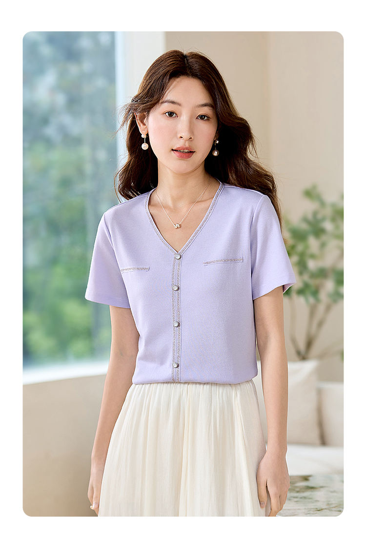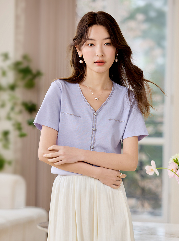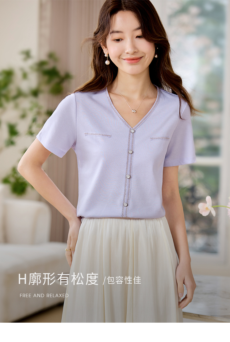 【专属特价】熙世界小香风织带针织T恤女短袖2025夏季新款气质时髦紫色V领上衣母亲节首选