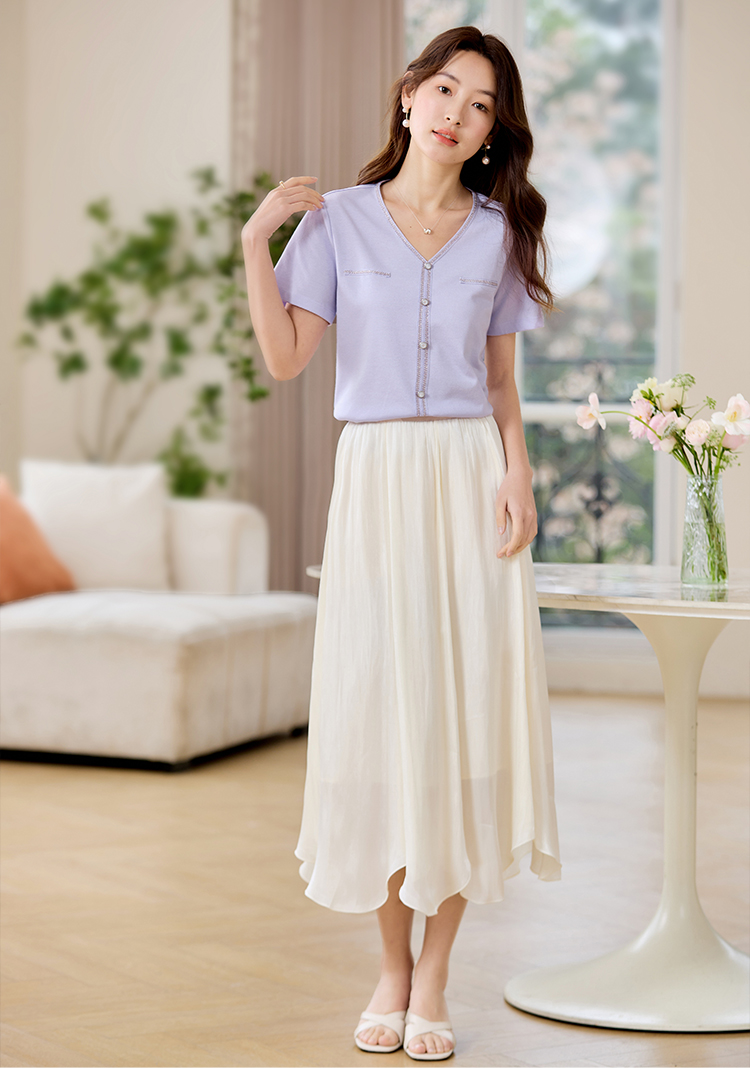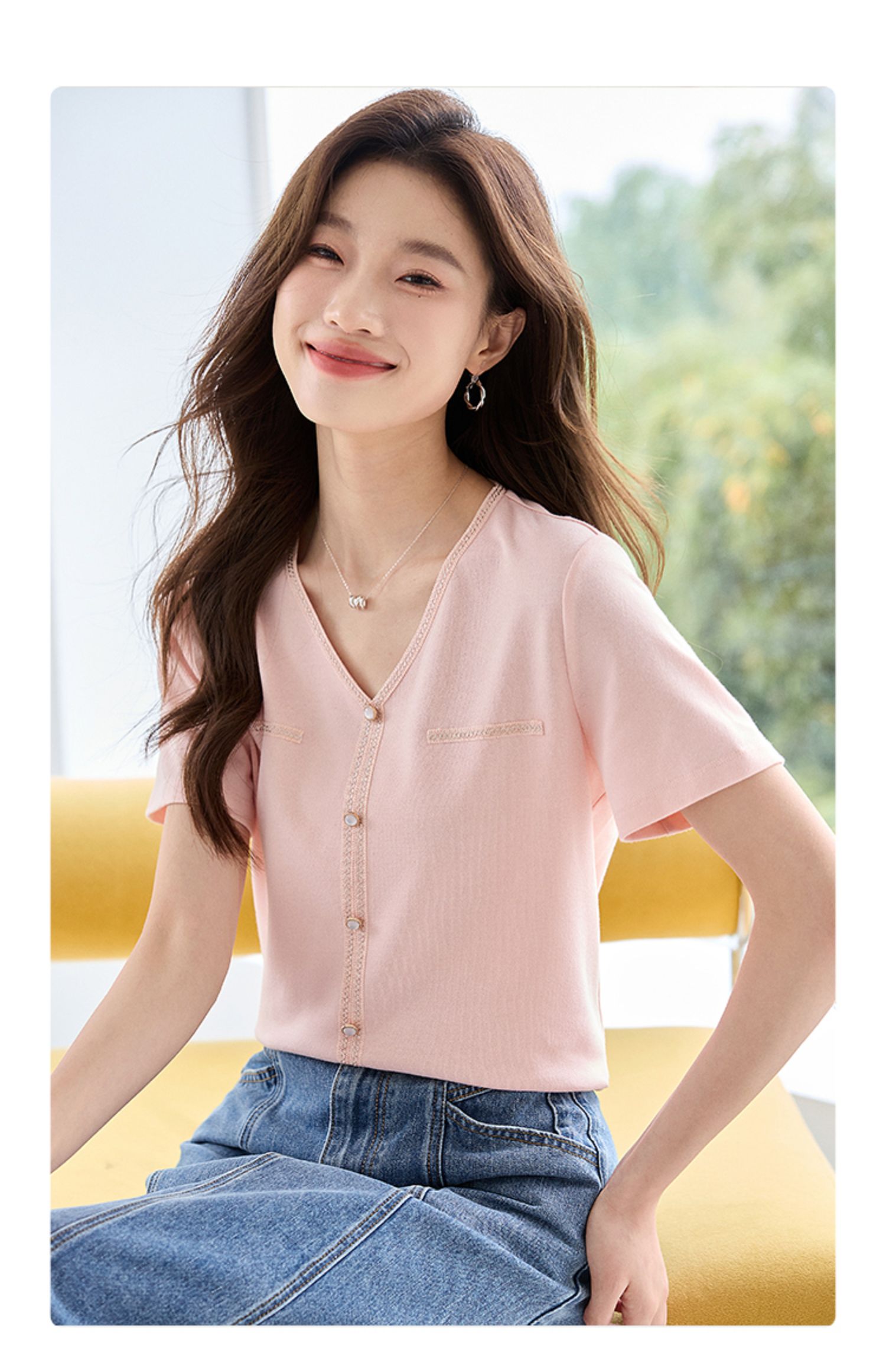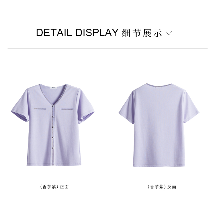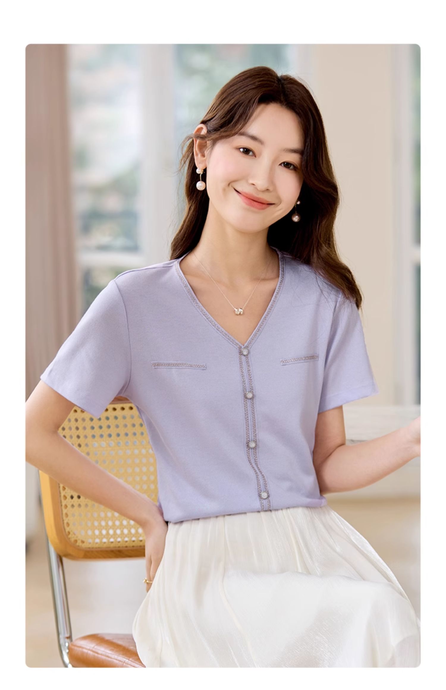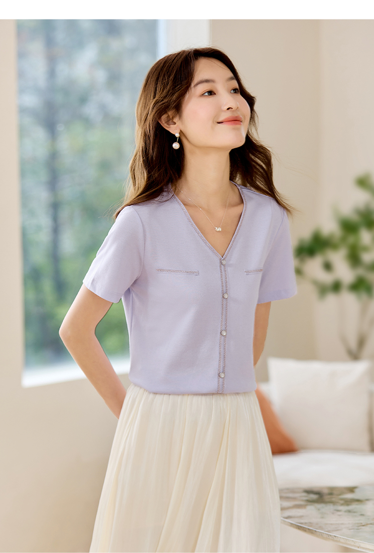 【专属特价】熙世界小香风织带针织T恤女短袖2025夏季新款气质时髦紫色V领上衣母亲节首选