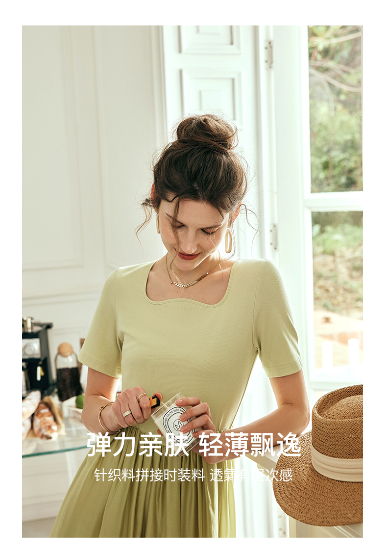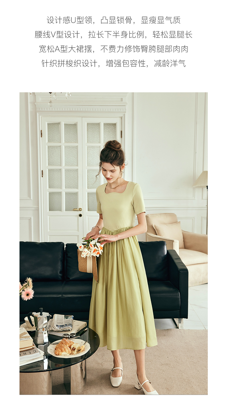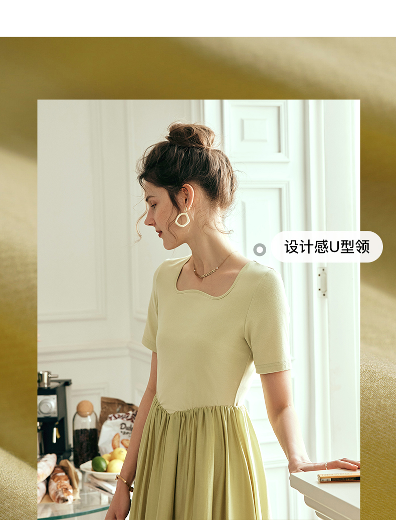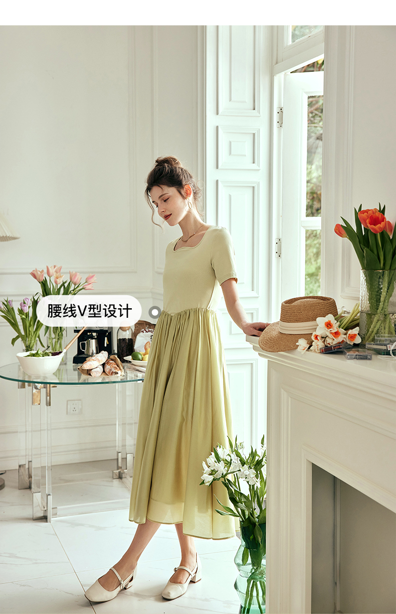 OLrain欧芮儿法式黄绿色连衣裙女夏季2023新款收腰针织拼接薄裙子