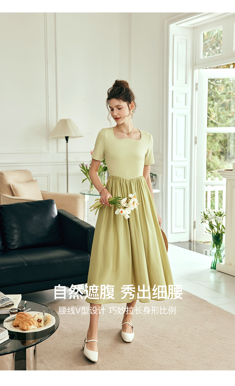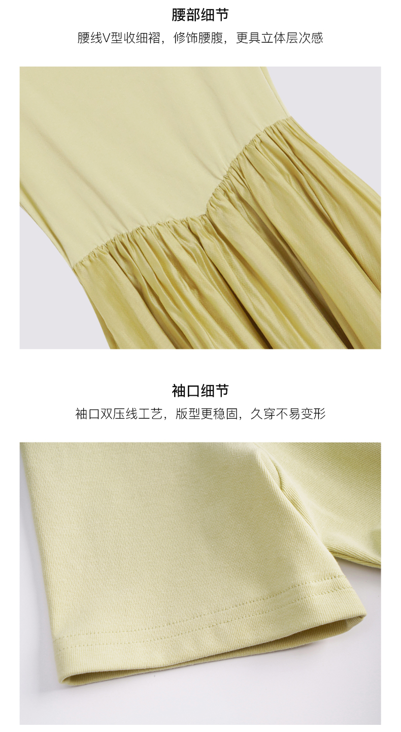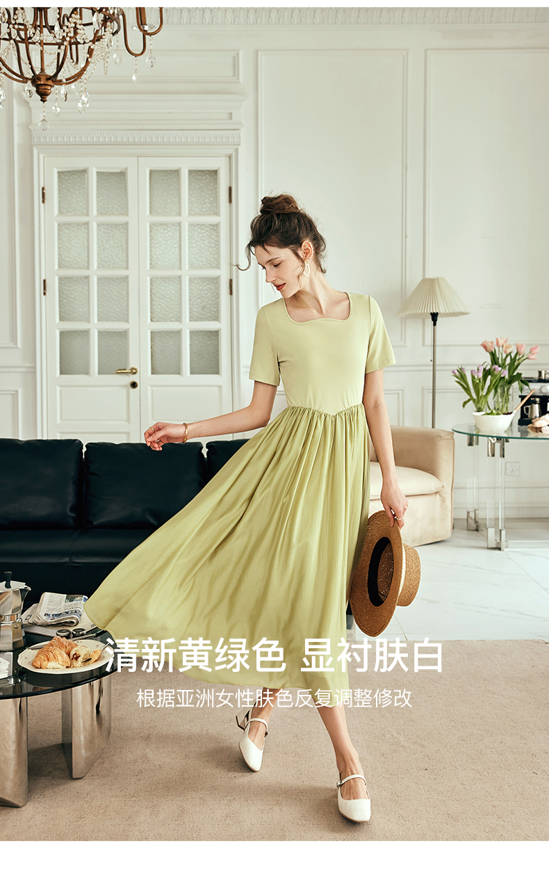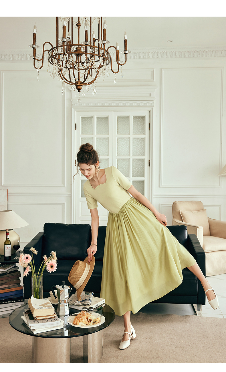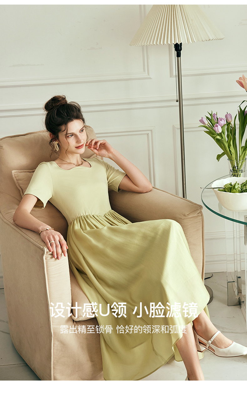 OLrain欧芮儿法式黄绿色连衣裙女夏季2023新款收腰针织拼接薄裙子
