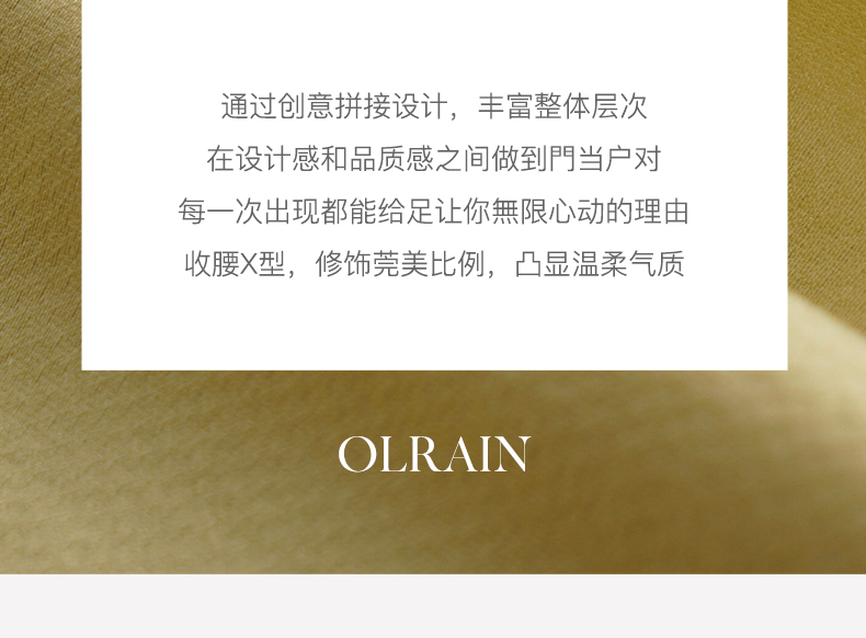 - “精致”是欧芮儿olrain品牌文化的核心,欧芮儿认为,精致的女人,不但要外在动人,更要内在迷人,内外兼修,有魅力、有气质、有内涵,自信而不自傲,优雅而不矫揉,自有万种风情而不轻浮,更不故作矜持。