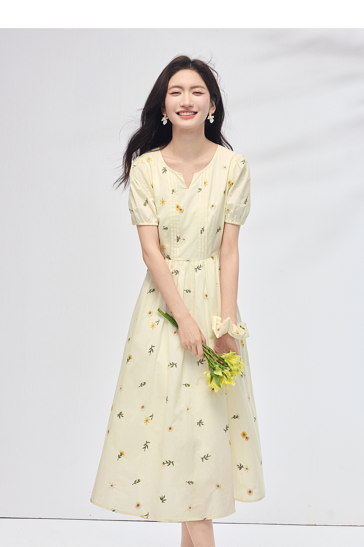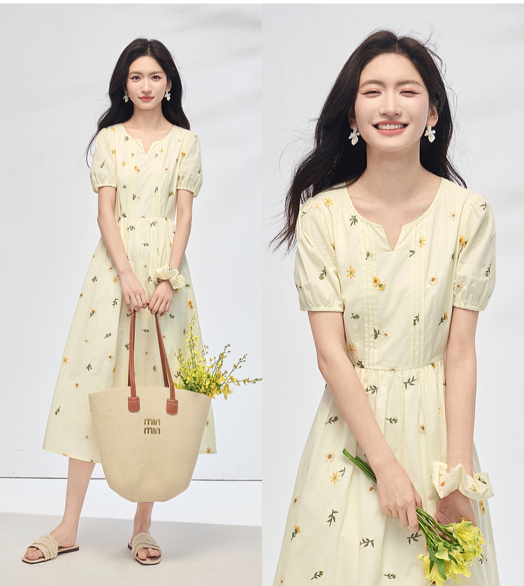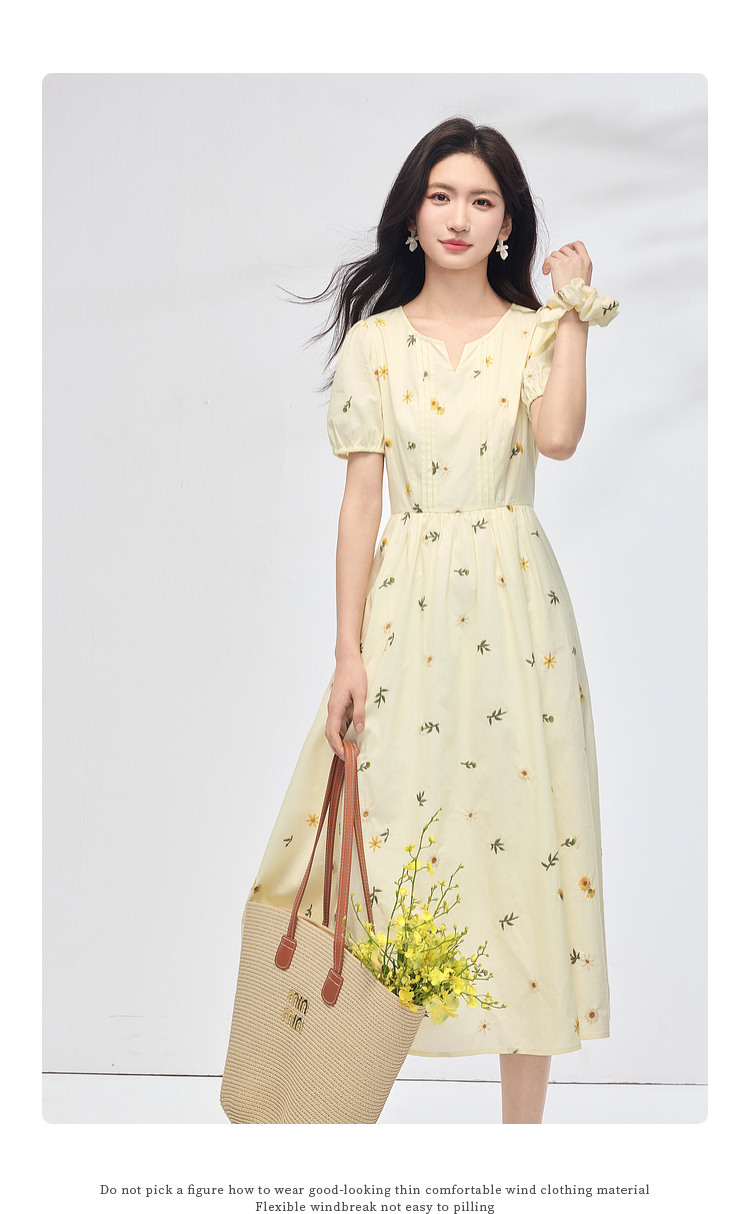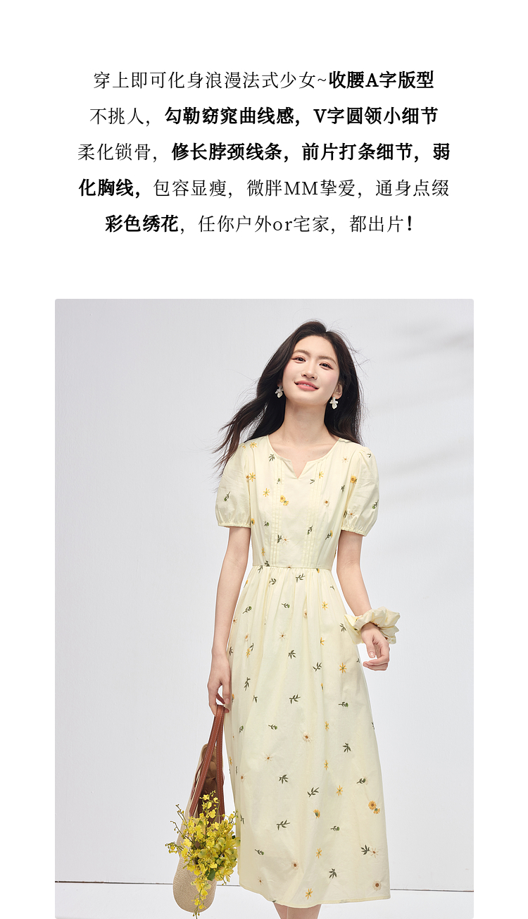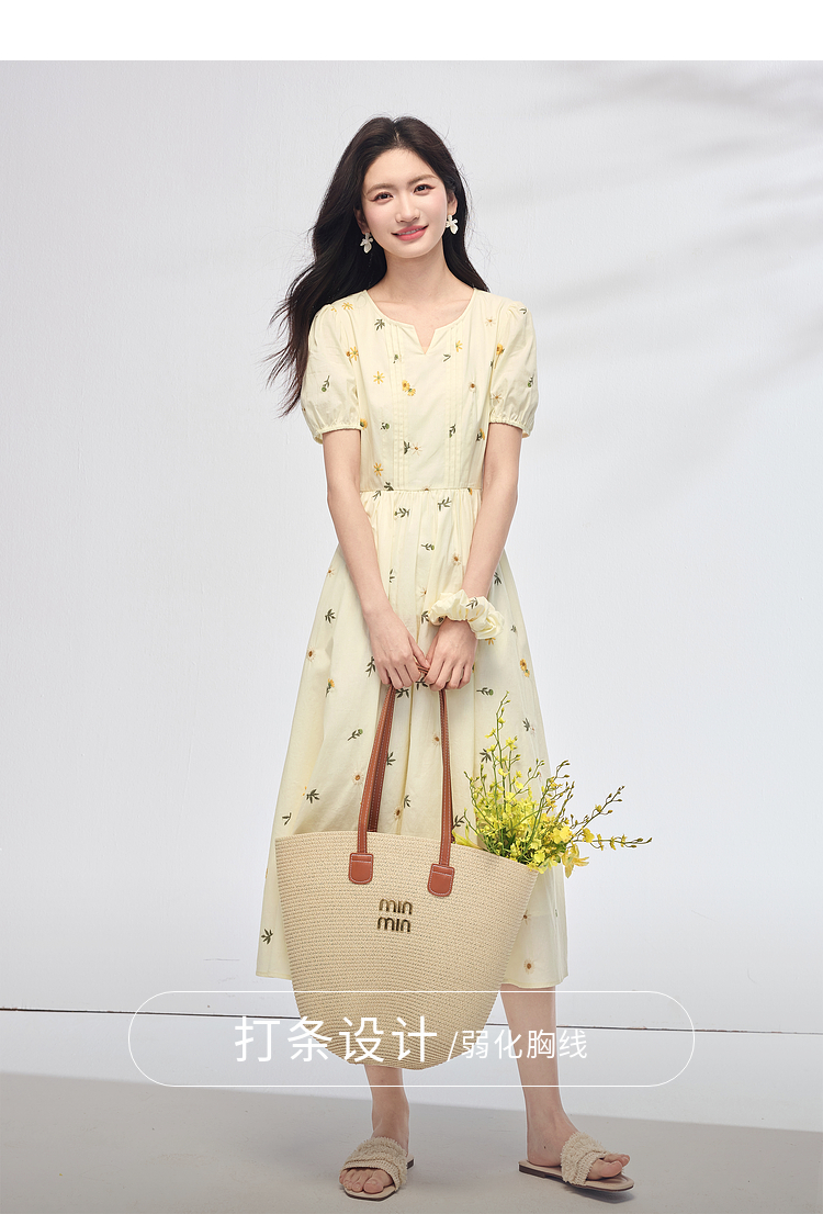 【专属特价】熙世界刺绣碎花连衣裙女短袖2025夏日新款法式显瘦收腰a字中长裙