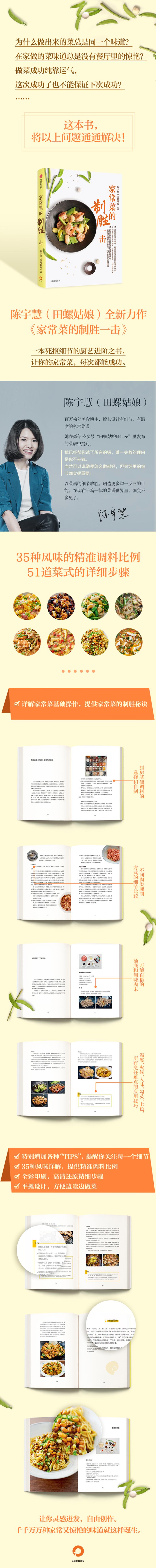家常菜的制胜一击,是体现在一个知识体系里的一个个小亮点。知识体系能保证家常菜的基础操作不出错,小亮点让普通的家常菜变得更好吃,这就是所谓的“制胜”。通过与主厨面对面交流,对每一道菜进行多次调整尝试,田螺姑娘在本书中精选的51道家常菜,既构造了体系,又突出了亮点。