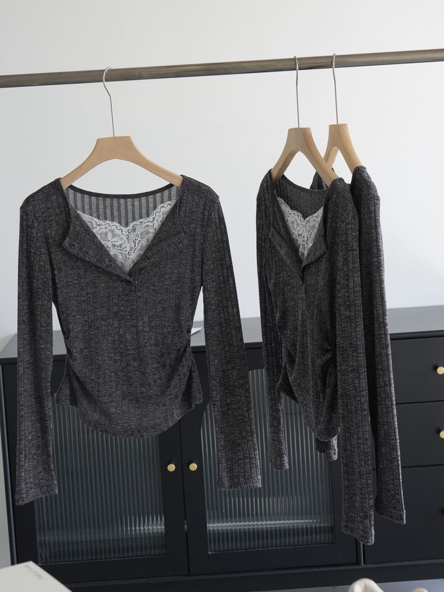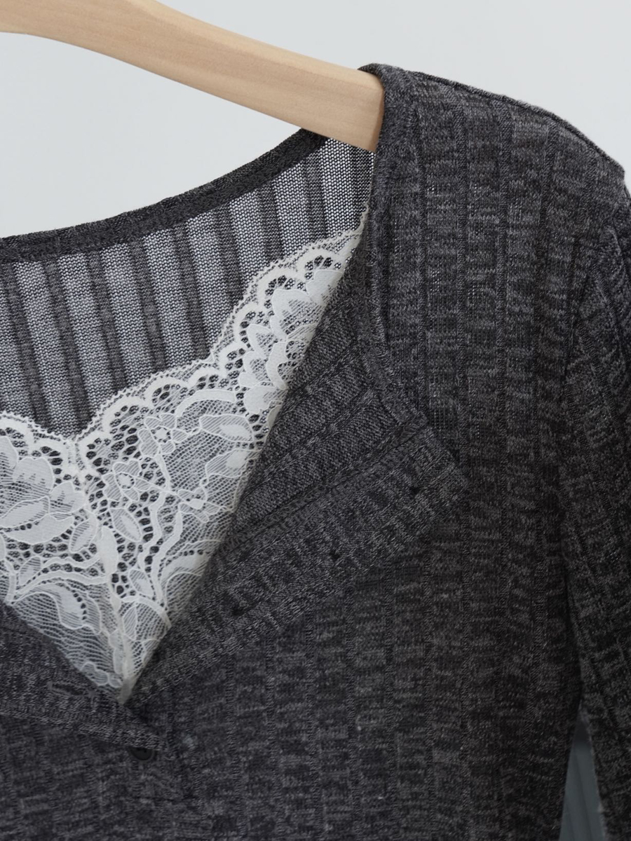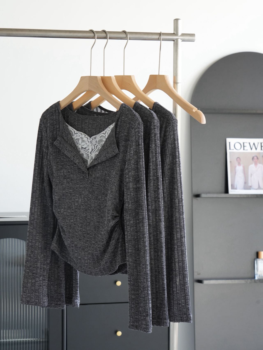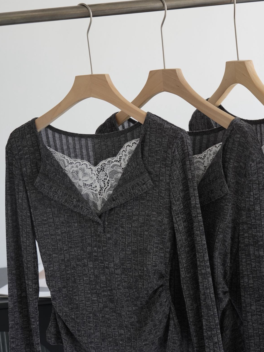 【百图lulu定制】【邂逅蕾丝T恤】【全码预售7天发】翻领 V领蕾丝拼接 两侧收腰抽褶 超弹长袖T恤