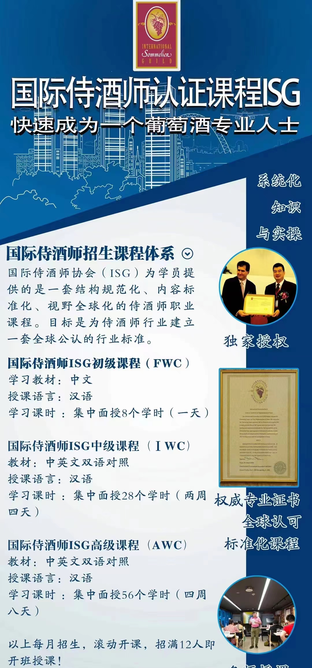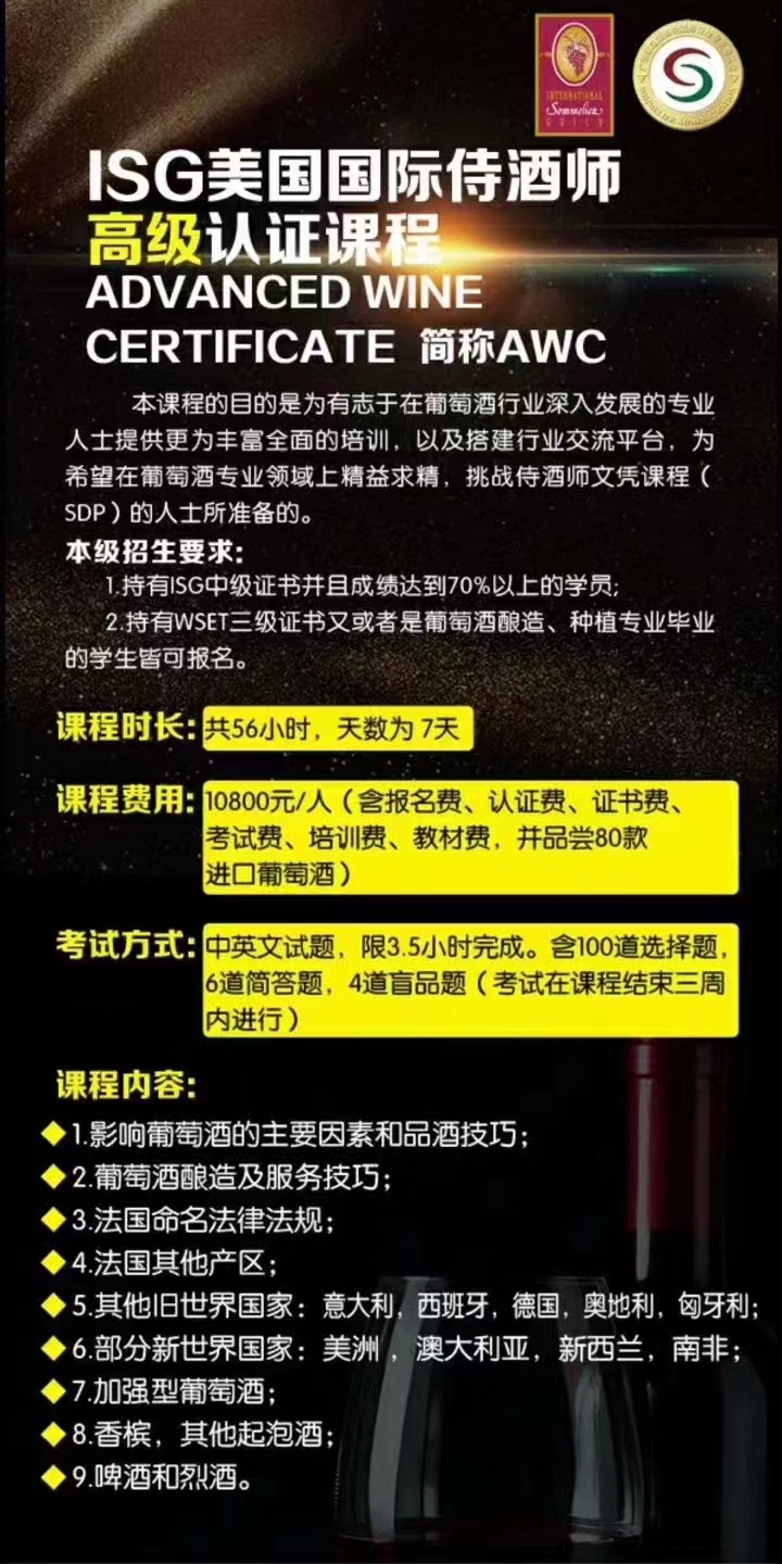 ISG国际侍酒师高级认证报名(含报名费、认证费、证书费、考试费、培训费、教材费,并品尝80款进口葡萄酒)