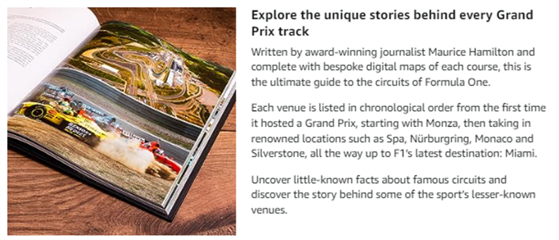 Explore the unique stories behind every Grand Prix track in this fully updated second edition. Written by award-winning journalist Maurice Hamilton and complete with bespoke digital maps of each course, this is the ultimate guide to the circuits of Formula One. Each venue is listed in chronological order from the first time it hosted a Grand Prix, starting with Monza, then taking in renowned locations such as Spa, Nurburgring, Monaco and Silverstone, all the way up to F1's latest destination: Miami.