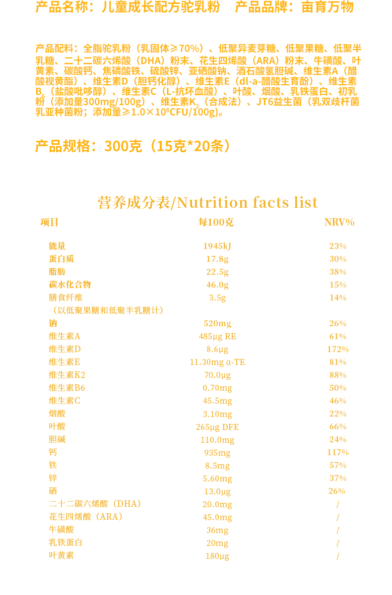 亩育万物 儿童成长配方驼乳粉300g(15g*20条)/罐