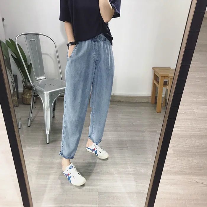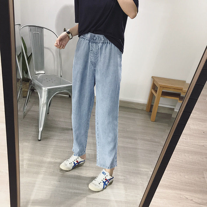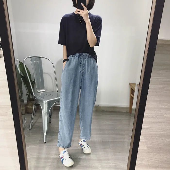 超薄牛仔裤女2021夏季松紧腰天丝宽松显瘦潮大码九分直筒老爹裤子